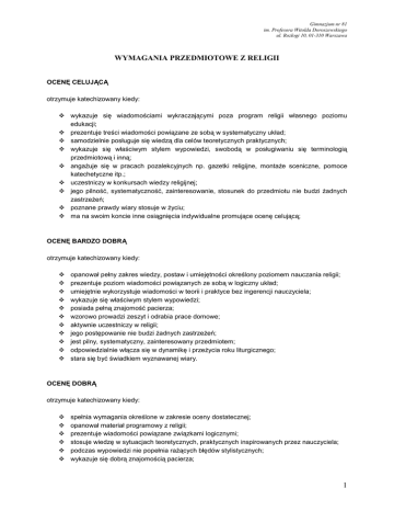 Gimnazjum nr 81 im. Profesora Witolda Doroszewskiego ul. Rozłogi 10, 01-310 Warszawa WYMAGANIA PRZEDMIOTOWE Z RELIGII OCENĘ CELUJĄCĄ otrzymuje katechizowany kiedy: wykazuje się wiadomościami wykraczającymi poza program religii własnego poziomu edukacji; prezentuje treści wiadomości powiązane ze sobą w systematyczny układ; samodzielnie posługuje się wiedzą dla celów teoretycznych praktycznych; wykazuje się właściwym stylem wypowiedzi, swobodą w posługiwaniu się terminologią przedmiotową i inną; angaŜuje się w pracach pozalekcyjnych np. gazetki religijne, montaŜe sceniczne, pomoce katechetyczne itp.; uczestniczy w konkursach wiedzy religijnej; jego pilność, systematyczność, zainteresowanie, stosunek do przedmiotu nie budzi Ŝadnych zastrzeŜeń; poznane prawdy wiary stosuje w Ŝyciu; ma na swoim koncie inne osiągnięcia indywidualne promujące ocenę celującą; OCENĘ BARDZO DOBRĄ otrzymuje katechizowany kiedy: opanował pełny zakres wiedzy, postaw i umiejętności określony poziomem nauczania religii; prezentuje poziom wiadomości powiązanych ze sobą w logiczny układ; umiejętnie wykorzystuje wiadomości w teorii i praktyce bez ingerencji nauczyciela; wykazuje się właściwym stylem wypowiedzi; posiada pełną znajomość pacierza; wzorowo prowadzi zeszyt i odrabia prace domowe; aktywnie uczestniczy w religii; jego postępowanie nie budzi Ŝadnych zastrzeŜeń; jest pilny, systematyczny, zainteresowany przedmiotem; odpowiedzialnie włącza się w dynamikę i przeŜycia roku liturgicznego; stara się być świadkiem wyznawanej wiary. OCENĘ DOBRĄ otrzymuje katechizowany kiedy: spełnia wymagania określone w zakresie oceny dostatecznej; opanował materiał programowy z religii; prezentuje wiadomości powiązane związkami logicznymi; stosuje wiedzę w sytuacjach teoretycznych, praktycznych inspirowanych przez nauczyciela; podczas wypowiedzi nie popełnia raŜących błędów stylistycznych; wykazuje się dobrą znajomością pacierza; 1 Gimnazjum nr 81 im. Profesora Witolda Doroszewskiego ul. Rozłogi 10, 01-310 Warszawa WYMAGANIA PRZEDMIOTOWE Z RELIGII w zeszycie posiada wszystkie notatki i prace domowe; podczas lekcji posiada określone pomoce (podręcznik, zeszyt i inne) i korzysta z nich; systematycznie uczestniczy w zajęciach religii; jest zainteresowany przedmiotem; wykazuje się dobrą umiejętnością zastosowania zdobytych wiadomości; postawa ucznia nie budzi wątpliwości; stara się być aktywnym podczas lekcji; OCENĘ DOSTATECZNĄ otrzymuje katechizowany kiedy: opanował łatwe, całkowicie niezbędne wiadomości, postawy i umiejętności; prezentuje podstawowe treści materiału programowego z religii; wykazuje się wiadomościami podstawowymi; dość poprawnie rozumie podstawowe uogólnienia oraz wyjaśnia waŜniejsze zjawiska z pomocą nauczyciela; potrafi stosować wiadomości dla celów praktycznych teoretycznych przy pomocy nauczyciela; w przekazywaniu wiadomości z religii popełnia niewielkie i nieliczne błędy; cechuje się małą kondensacją wypowiedzi; wykazuje się podstawową znajomością pacierza; w zeszycie ucznia sporadyczne braki notatek, prac domowych; prezentuje przeciętną pilność, systematyczność zainteresowanie przedmiotem. OCENĘ DOPUSZCZAJĄCĄ otrzymuje katechizowany kiedy: opanował konieczne pojęcia religijne; posiada niski poziom wiadomości programowych; prezentuje mało zadowalający poziom postaw i umiejętności; wykazuje brak rozumienia podstawowych uogólnień; nie potrafi stosować wiedzy, nawet przy pomocy nauczyciela; podczas przekazywania wiadomości popełnia liczne błędy, wykazuje niepoprawny styl wypowiedzi, posiada trudności w wysławianiu; prowadzi zeszyt; posiada problemy ze znajomością pacierza; wykazuje poprawny stosunek do religii. 2 Gimnazjum nr 81 im. Profesora Witolda Doroszewskiego ul. Rozłogi 10, 01-310 Warszawa WYMAGANIA PRZEDMIOTOWE Z RELIGII OCENĘ NIEDOSTATECZNĄ otrzymuje katechizowany kiedy: wykazuje raŜący brak wiadomości programowych; posiada brak jedności logicznej między wiadomościami; wykazuje zupełny brak umiejętności stosowania wiedzy; podczas przekazywania informacji popełnia bardzo liczne błędy; wykazuje raŜąco niepoprawny styl wypowiedzi; nie wykazuje się znajomością pacierza; nie posiada zeszytu lub dość często nie przynosi go na lekcję; lekcewaŜy przedmiot; nieodpowiednio zachowuje się na lekcji; wyraŜa lekcewaŜący stosunek do wartości religijnych; opuszcza lekcje religii; nie przejawia religijnego wymiaru własnego Ŝycia; inne uwarunkowania indywidualne ucznia wskazujące na ocenę niedostateczną. PRZY USTALANIU OCEN DECYDUJĄ W KOLEJNOŚCI OCENY CZĄSTKOWE Z: prac klasowych testów sprawdzianów odpowiedzi ustnych aktywności na lekcjach prac pisemnych 20% 20% 20% 10% 15% 15% Za osiągnięcia w konkursach i olimpiadach ocena końcowa jest podwyŜszona. NARZĘDZIA DIAGNOZOWANIA umiejętności rozumienie tekstów biblijnych narzędzia sprawdzające sprawdzian, odpowiedź ustna, praca z tekstem częstotliwość w semestrze 2x zasób wiadomości z katechezy odpowiedź ustna, praca klasowa, test 5x praca domowa zeszyt 6x 1x prace pisemne sprawdzenie 3 Gimnazjum nr 81 im. Profesora Witolda Doroszewskiego ul. Rozłogi 10, 01-310 Warszawa WYMAGANIA PRZEDMIOTOWE Z RELIGII OBSZARY OCENIANIA Z LEKCJI RELIGII: 1. wiedza; 2. umiejętności; 3. postępy; 4. postawa. Ad. 1. Wiedza ucznia zdobywana na katechezie i poza nią (literatura, czasopisma, środki masowego przekazu, grupy działające na terenie parafii): odpowiedź ustna; przygotowanie pomocy dydaktycznych w ramach zajęć dydaktycznych (plakaty, plansze, referaty, albumy); pisemne formy aktywności (prace domowe); udział w konkursach; udział w inscenizacjach. Ad.2. Sprawdzenie umiejętności uczniów: test; klasówka kończąca dany dział; sprawdzian z trzech ostatnich lekcji; systematyczne odrabianie prac domowych. Ad.3. Postępy – zaangaŜowanie: aktywność na katech