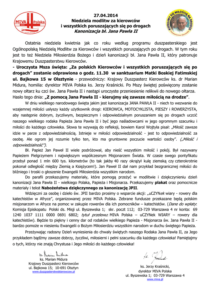 27.04.2014 Niedziela modlitw za kierowców i wszystkich poruszających się po drogach Kanonizacja bł. Jana Pawła II Ostatnia niedziela kwietnia jak co roku według programu duszpasterskiego jest Ogólnopolską Niedzielą Modlitw za Kierowców i wszystkich poruszających po drogach. W tym roku jest to też Niedziela Miłosierdzia Bożego i dzień kanonizacji bł. Jana Pawła II, który patronuje Krajowemu Duszpasterstwu Kierowców. - Uroczysta Msza święta: „Za polskich Kierowców i wszystkich poruszających się po drogach” zostanie odprawiona o godz. 11.30 w sanktuarium Matki Boskiej Fatimskiej ul. Bajkowa 15 w Olsztynie - przewodniczy: Krajowy Duszpasterz Kierowców ks. dr Marian Midura, homilia: dyrektor MIVA Polska ks. Jerzy Kraśnicki. Po Mszy świętej poświęcony zostanie nowy ołtarz ku czci św. Jana Pawła II i nastąpi uroczyste przeniesienie relikwii do nowego ołtarza. Hasło tego dnia: „Z pomocą Jana Pawła II - kierujmy się zawsze miłością na drodze”. W dniu wielkiego narodowego święta jakim jest kanonizacja JANA PAWŁA II - niech to wezwanie do wzajemnej miłości usłyszy każdy użytkownik drogi: KIEROWCA, MOTOCYKLISTA, PIESZY i ROWERZYSTA, aby następnie dobrym, życzliwym, bezpiecznym i odpowiedzialnym poruszaniem się po drogach uczcić naszego wielkiego rodaka Papieża Jana Pawła II i być jego naśladowcami w jego ogromnym szacunku i miłości do każdego człowieka. Słowa te wzywają do refleksji, bowiem Karol Wojtyła pisał: „Miłość zawsze idzie w parze z odpowiedzialnością. Istnieje w miłości odpowiedzialność - jest to odpowiedzialność za osobę. Ale ogrom jej rozumie tylko ten, kto ma gruntowne poczucie wartości osoby”. („Miłość i odpowiedzialność”). Bł. Papież Jan Paweł II wiele podróżował, aby nieść wszystkim miłość i pokój. Był nazywany Papieżem Pielgrzymem i największym współczesnym Misjonarzem Świata. W czasie swego pontyfikatu przebył ponad 1 mln 600 tys. kilometrów (to tak jakby 40 razy okrążył kulę ziemską czy czterokrotnie pokonał odległość między Ziemią a Księżycem!). Jan Paweł II dał nam przykład bezgranicznej miłości do bliźniego i troski o głoszenie Ewangelii Miłosierdzia wszystkim narodom. Do parafii przekazujemy materiały, które pomogą przeżyć w modlitwie i dziękczynieniu dzień kanonizacji Jana Pawła II - wielkiego Polaka, Papieża i Misjonarza. Przekazujemy plakat oraz pomocnicze materiały i tekst Nabożeństwa dziękczynnego za kanonizację JPII. Wdzięczni za osobę i dzieło św. JPII bardzo prosimy o wsparcie akcji: „uCZYNek wiary - rowery dla katechistów w Afryce”, organizowanej przez MIVA Polska. Zebrane fundusze przekazane będą polskim misjonarzom w Afryce na pomoc w zakupie rowerów dla ich pomocników – katechistów. (Dane do wpłaty: Komisja Episkopatu Polski ds. Misji ul. Byszewska 1; skr. poczt 112; 03-729 Warszawa 4 nr konta: 69 1240 1037 1111 0000 0691 6802; tytuł przelewu: MIVA Polska – uCZYNek WIARY – rowery dla katechistów). Będzie to piękny i cenny dar od rodaków wielkiego Papieża - Misjonarza św. Jana Pawła II bardzo pomoże w niesieniu Ewangelii o Bożym Miłosierdziu wszystkim narodom w duchu świętego Papieża. Przeżywając radosny Dzień wyniesienia do chwały świętych naszego Rodaka Jana Pawła II, za Jego przykładem bądźmy zawsze dobrzy, życzliwi, miłosierni i pełni szacunku dla każdego człowieka! Pamiętajmy o tych, którzy nie znają Chrystusa i Jego miłości do każdego człowieka! ks. Marian Midura Krajowy Duszpasterz Kierowców ul. Bajkowa 15; 10-691 Olsztyn www.duszpasterstwokierowcow.pl ks. Jerzy Kraśnicki, dyrektor MIVA Polska ul. Byszewska 1; 03-729 Warszawa 4 www.miva.pl