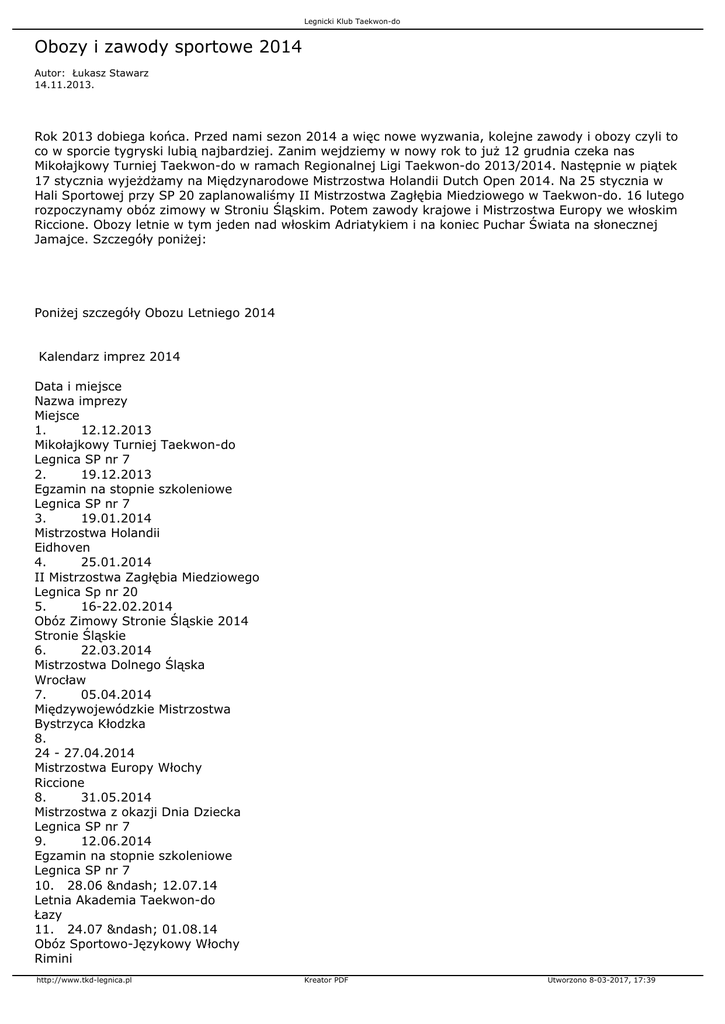 Legnicki Klub Taekwon-do Obozy i zawody sportowe 2014 Autor: Łukasz Stawarz 14.11.2013. Rok 2013 dobiega końca. Przed nami sezon 2014 a więc nowe wyzwania, kolejne zawody i obozy czyli to co w sporcie tygryski lubią najbardziej. Zanim wejdziemy w nowy rok to już 12 grudnia czeka nas Mikołajkowy Turniej Taekwon-do w ramach Regionalnej Ligi Taekwon-do 2013/2014. Następnie w piątek 17 stycznia wyjeżdżamy na Międzynarodowe Mistrzostwa Holandii Dutch Open 2014. Na 25 stycznia w Hali Sportowej przy SP 20 zaplanowaliśmy II Mistrzostwa Zagłębia Miedziowego w Taekwon-do. 16 lutego rozpoczynamy obóz zimowy w Stroniu Śląskim. Potem zawody krajowe i Mistrzostwa Europy we włoskim Riccione. Obozy letnie w tym jeden nad włoskim Adriatykiem i na koniec Puchar Świata na słonecznej Jamajce. Szczegóły poniżej: Poniżej szczegóły Obozu Letniego 2014 Kalendarz imprez 2014 Data i miejsce Nazwa imprezy Miejsce 1. 12.12.2013 Mikołajkowy Turniej Taekwon-do Legnica SP nr 7 2. 19.12.2013 Egzamin na stopnie szkoleniowe Legnica SP nr 7 3. 19.01.2014 Mistrzostwa Holandii Eidhoven 4. 25.01.2014 II Mistrzostwa Zagłębia Miedziowego Legnica Sp nr 20 5. 16-22.02.2014 Obóz Zimowy Stronie Śląskie 2014 Stronie Śląskie 6. 22.03.2014 Mistrzostwa Dolnego Śląska Wrocław 7. 05.04.2014 Międzywojewódzkie Mistrzostwa Bystrzyca Kłodzka 8. 24 - 27.04.2014 Mistrzostwa Europy Włochy Riccione 8. 31.05.2014 Mistrzostwa z okazji Dnia Dziecka Legnica SP nr 7 9. 12.06.2014 Egzamin na stopnie szkoleniowe Legnica SP nr 7 10. 28.06 – 12.07.14 Letnia Akademia Taekwon-do Łazy 11. 24.07 – 01.08.14 Obóz Sportowo-Językowy Włochy Rimini http://www.tkd-legnica.pl Kreator PDF Utworzono 8-03-2017, 17:39 Legnicki Klub Taekwon-do 12.26 - 30.08.2014 V Puchar Świata Jamajka 2014 Montego Bay http://www.tkd-legnica.pl Kreator PDF Utworzono 8-03-2017, 17:39