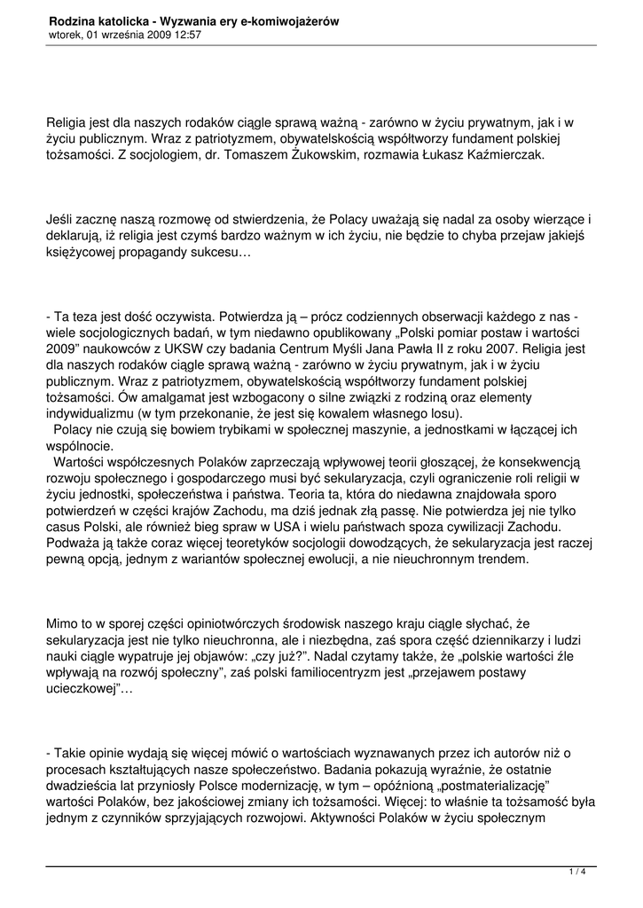 Rodzina katolicka - Wyzwania ery e-komiwojażerów wtorek, 01 września 2009 12:57 Religia jest dla naszych rodaków ciągle sprawą ważną - zarówno w życiu prywatnym, jak i w życiu publicznym. Wraz z patriotyzmem, obywatelskością współtworzy fundament polskiej tożsamości. Z socjologiem, dr. Tomaszem Żukowskim, rozmawia Łukasz Kaźmierczak. Jeśli zacznę naszą rozmowę od stwierdzenia, że Polacy uważają się nadal za osoby wierzące i deklarują, iż religia jest czymś bardzo ważnym w ich życiu, nie będzie to chyba przejaw jakiejś księżycowej propagandy sukcesu… - Ta teza jest dość oczywista. Potwierdza ją – prócz codziennych obserwacji każdego z nas wiele socjologicznych badań, w tym niedawno opublikowany „Polski pomiar postaw i wartości 2009” naukowców z UKSW czy badania Centrum Myśli Jana Pawła II z roku 2007. Religia jest dla naszych rodaków ciągle sprawą ważną - zarówno w życiu prywatnym, jak i w życiu publicznym. Wraz z patriotyzmem, obywatelskością współtworzy fundament polskiej tożsamości. Ów amalgamat jest wzbogacony o silne związki z rodziną oraz elementy indywidualizmu (w tym przekonanie, że jest się kowalem własnego losu). Polacy nie czują się bowiem trybikami w społecznej maszynie, a jednostkami w łączącej ich wspólnocie. Wartości współczesnych Polaków zaprzeczają wpływowej teorii głoszącej, że konsekwencją rozwoju społecznego i gospodarczego musi być sekularyzacja, czyli ograniczenie roli religii w życiu jednostki, społeczeństwa i państwa. Teoria ta, która do niedawna znajdowała sporo potwierdzeń w części krajów Zachodu, ma dziś jednak złą passę. Nie potwierdza jej nie tylko casus Polski, ale również bieg spraw w USA i wielu państwach spoza cywilizacji Zachodu. Podważa ją także coraz więcej teoretyków socjologii dowodzących, że sekularyzacja jest raczej pewną opcją, jednym z wariantów społecznej ewolucji, a nie nieuchronnym trendem. Mimo to w sporej części opiniotwórczych środowisk naszego kraju ciągle słychać, że sekularyzacja jest nie tylko nieuchronna, ale i niezbędna, zaś spora część dziennikarzy i ludzi nauki ciągle wypatruje jej objawów: „czy już?”. Nadal czytamy także, że „polskie wartości źle wpływają na rozwój społeczny”, zaś polski familiocentryzm jest „przejawem postawy ucieczkowej”… - Takie opinie wydają się więcej mówić o wartościach wyznawanych przez ich autorów niż o procesach kształtujących nasze społeczeństwo. Badania pokazują wyraźnie, że ostatnie dwadzieścia lat przyniosły Polsce modernizację, w tym – opóźnioną „postmaterializację” wartości Polaków, bez jakościowej zmiany ich tożsamości. Więcej: to właśnie ta tożsamość była jednym z czynników sprzyjających rozwojowi. Aktywności Polaków w życiu społecznym 1/4 Rodzina katolicka - Wyzwania ery e-komiwojażerów wtorek, 01 września 2009 12:57 sprzyjają m.in. silniejsze związki z religią, zaś jednym z ważnych źródeł obywatelskiego kapitału społecznego jest kapitał rodzinno-sąsiedzki. Zaś głównym źródłem naszych kłopotów z rozwojem są zupełnie inne czynniki: długoletnie, niszczące społeczne zaufanie, doświadczenie totalitaryzmu oraz kłopoty z budową sprawnego państwa w ostatnich dwóch dekadach. Z czego wynika siła polskiej tożsamości? - Każdy z jej głównych elementów ma własne, samodzielne, trwałe korzenie, a więc dużą nośność. Rzecz chyba jeszcze ważniejsza to wzajemne, złożone powiązania pomiędzy tymi elementami: patriotyzmem, wiarą, obywatelskością, prorodzinnością, indywidualizmem. Tam, gdzie słabnie wpływ jednego z elementów, nadal oddziałują pozostałe. Daje to splecionej całości i siłę, i elastyczność w reagowaniu na nowe wyzwania. Badania ukazują także złożoność zakorzenienia polskiej religijności. Dla Polaków Kościół jest i instytucją, i wspólnotą, i sposobem kontaktu z Bogiem. Co niezwykle ważne i ciekawe, w ten trzeci sposób definiują ludzie Kościół najczęściej. Gdy prezentowaliśmy te wyniki po raz pierwszy, zaskoczeni byli i dziennikarze, i socjologowie, i religioznawcy. Wielu z nich było święcie przekonanych, że pierwsze wskazanie padnie na aspekt instytucjonalny, jako że właśnie taki sposób narracji dominuje od dawna w polskiej dyskusji publicznej. Rozumienie Kościoła jako przede wszystkim miejsca kontaktu z tym co nadprzyrodzone wyjaśnia odporność jego wizerunku na różne, eksponowane w mediach, skandale, a także na umniejszenie roli instytucji Kościoła w sferze publicznej po upadku komunizmu. Zapewne dlatego nie powtórzył się w Polsce scenariusz z kanadyjskiego Quebecu, gdzie po przyznaniu tej francuskojęzycznej i katolickiej prowincji większej autonomii politycznej rola Kościoła, wcześniej bardzo skutecznego organizatora życia mieszkańców tej prowincji, wyraźnie osłabła. Czy to właśnie jeden z tych „polskich cudów” w sferze społecznej, o których pisał Pan niedawno na łamach ostatniego, piątego numeru „Teologii Politycznej”? - Takich cudów jest rzeczywiście sporo. Pierwszy z brzegu przykład: jesteśmy chyba jedynym krajem Europy, w którym w demokratycznym dyskursie publicznym dotyczącym ochrony życia zwycięstwo odniosła opcja „pro life”. A przypomnę, że jeszcze kilkanaście lat temu tzw. aborcja z przyczyn społecznych była powszechnie akceptowana przez większość opinii publicznej i popierana przez lewicowe oraz liberalne media. Jednak ten trend udało się odwrócić i to pomimo zmian obyczajowych w początkach transformacji ustrojowej, związanych z zachłyśnięciem się wolnością pojmowaną w sposób skrajnie indywidualistyczny. Inny „polski cud” to chociażby fakt, że Polska zaskakująco szybko oswoiła Unię Europejską i rozgościła się tam zamiast „siedzieć cicho”. Badanie Eurobarometru sprzed roku pokazuje 2/4 Rodzina katolicka -