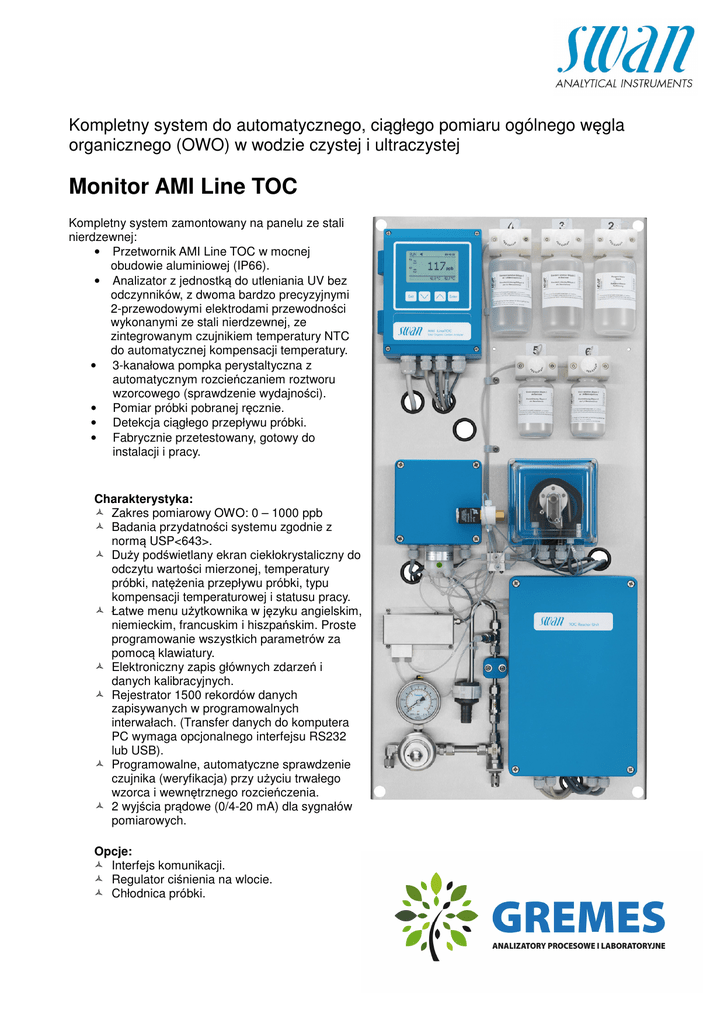 Kompletny system do automatycznego, ciągłego pomiaru ogólnego węgla organicznego (OWO) w wodzie czystej i ultraczystej Monitor AMI Line TOC Kompletny system zamontowany na panelu ze stali nierdzewnej: • Przetwornik AMI Line TOC w mocnej obudowie aluminiowej (IP66). • Analizator z jednostką do utleniania UV bez odczynników, z dwoma bardzo precyzyjnymi 2-przewodowymi elektrodami przewodności wykonanymi ze stali nierdzewnej, ze zintegrowanym czujnikiem temperatury NTC do automatycznej kompensacji temperatury. • 3-kanałowa pompka perystaltyczna z automatycznym rozcieńczaniem roztworu wzorcowego (sprawdzenie wydajności). • Pomiar próbki pobranej ręcznie. • Detekcja ciągłego przepływu próbki. • Fabrycznie przetestowany, gotowy do instalacji i pracy. Charakterystyka: Zakres pomiarowy OWO: 0 – 1000 ppb Badania przydatności systemu zgodnie z normą USP<643>. Duży podświetlany ekran ciekłokrystaliczny do odczytu wartości mierzonej, temperatury próbki, natężenia przepływu próbki, typu kompensacji temperaturowej i statusu pracy. Łatwe menu użytkownika w języku angielskim, niemieckim, francuskim i hiszpańskim. Proste programowanie wszystkich parametrów za pomocą klawiatury. Elektroniczny zapis głównych zdarzeń i danych kalibracyjnych. Rejestrator 1500 rekordów danych zapisywanych w programowalnych interwałach. (Transfer danych do komputera PC wymaga opcjonalnego interfejsu RS232 lub USB). Programowalne, automatyczne sprawdzenie czujnika (weryfikacja) przy użyciu trwałego wzorca i wewnętrznego rozcieńczenia. 2 wyjścia prądowe (0/4-20 mA) dla sygnałów pomiarowych. Opcje: Interfejs komunikacji. Regulator ciśnienia na wlocie. Chłodnica próbki. Zasilanie Napięcie: Pomiar OWO Metoda analizy: utlenianie UV bez odczynników, przewodność różnicowa. Czas reakcji <2 minut Czujnik Swansensor TOCON ze zintegrowanym czujnikiem temperatury NT5K. Emiter (nadajnik) UV Żywotność: 6 miesięcy zależnie od aplikacji: do 12 miesięcy 11 W Moc: Zakres pomiaru Rozdzielczość 0.1 do 1000 ppb OWO 0.1 ppb 0.1 do 50 ppb 50 do 1000 ppb Powtarzalność ± 1 ppb ± 2% 0.055 do 2 μS/cm (20 °C) Dokładność ± 2% Okresowe kontrole dokładności za pomocą ultra precyzyjnych rezystorów. Automatyczne sprawdzenie czujnika (weryfikacja) przy użyciu trwałego wzorca i wewnętrznego rozcieńczenia. Badania przydatności systemu zgodnie z normami USP<643> i Ph.Eur.2.2.44. Automatyczna kompensacja temperatury. Detekcja przepływu próbki. Specyfikacja i funkcjonalność przetwornika Obudowa elektroniki: aluminium Stopień ochrony: IP66 / NEMA 4X Ekran: LCD, 75 x 45 mm Połączenia elektryczne: zaciski śrubowe Wymiary: 180 x 140 x 70 mm Waga: 1.5 kg Temperatura otoczenia: -10 do +50 °C Wilgotność: 10-90% nie kondensująca 2 wyjścia sygnałowe (3. jako opcja) 100 – 240 VAC ± 10% Dwa wyjścia sygnałowe programowalne 50/60 Hz (± 5%) dla wartości mierzonych (dowolnie Pobór mocy: maks. 55 W skalowalne, liniowo lub dwu liniowo) lub jako ciągła kontrola wyjść Obsługa (programowalne parametry kontroli). Łatwa obsługa dzięki menu Pętla prądowa 0/4 – 20 mA podzielonym na działy „Messages”, Maks. obciążenie 510 Ω „Diagnostics”, „Maintenace”, Funkcja sterowania „Operation” i „Installation”. Menu użytkownika w językach: angielskim, Wyjścia przekaźnikowe lub prądowe niemieckim, francuskim i hiszpańskim. programowalne w funkcji sterowania Możliwość zabezpieczenia działów pompami lub zaworami menu hasłem dostępu. elektromagnetycznymi. Wyświetlanie wartości procesowej, Programowalne parametry sterowania: statusu alarmu i czasu podczas pracy. P, PI, PID, PD Zapis danych zdarzeń, alarmów 1 Interfejs komunikacji (opcja) i historii kalibracji. Przechowywania 1500 ostatnich - Interfejs RS232 do pobierania danych zapisów danych, rejestrowanych w na komputer PC ze SWAN Terminal programowalnych interwałach. - Interfejs RS485 (izolowany galwanicznie) z protokołem Fieldbus Funkcje bezpieczeństwa Modbus lub Profibus DP Zachowanie danych przy braku - 3. wyjście prądowe zasilania, wszystkie dane - USB zachowywane są w stałej pamięci. Zabezpieczenie przepięciowe wejść i wyjść. Dane monitora Wyjścia sygnałów izolowane galwanicznie od wejść czujników. Warunki dotyczące próbki Natężenie przepływu: 1 – 5 l/h Monitoring temperatury obudowy Temperatura próbki: od 10 do 40 °C z programowalnym alarmem dla zbyt z chłodnicą próbki (opcja): do 90 °C niskiej lub zbyt wysokiej temperatury. Ciśnienie na wlocie (25°C): do 1.5 bar z regulatorem ciśnienia: do 5 bar 1 przekaźnik alarmowy Ciśnienie na wylocie: bezciśnieniowy 1 styk bezpotencjałowy dla zbiorczego Przewodność: 0.055 – 2 μS/cm alarmu dla programowalnych wartości Zawartość cząstek stałych: < 100 μm alarmowych i błędów urządzenia. Próbka bez piasku, bez olejów. Maks. obciążenie: 1A / 250 VAC Podłączenie próbki 1 wejście Wlot: złączka Swagelok dla rurki ¼'' Jedno wejście dla styku Wylot: przyłącze G 1/2'' dla rurki bezpotencjałowego, programowalne elastycznej Φ 20 x 15 mm jako zamrożenie pomiaru lub zdalne wyłączenie. Panel Wymiary: 400 x 850 x 180 mm 2 przekaźniki Materiał: stal nierdzewna 2 styki bezpotencjałowe Waga całkowita: 20 kg programowalne dla limitów wartości mierzonych, sterownik lub zegar dla z automatycznym zamrożeniem pomiaru. Obciążenie znamionowe: 1A / 250 VAC Dystrybutor w Polsce: GREMES ul. Ptasia 24, 59-700 Bolesławiec tel.: +48 694 19 88 19, +48 508 25 93 69, +48 602 29 30 81 fax: +48 71 757 57 29 e-mail: [email protected] www.gremes.pl