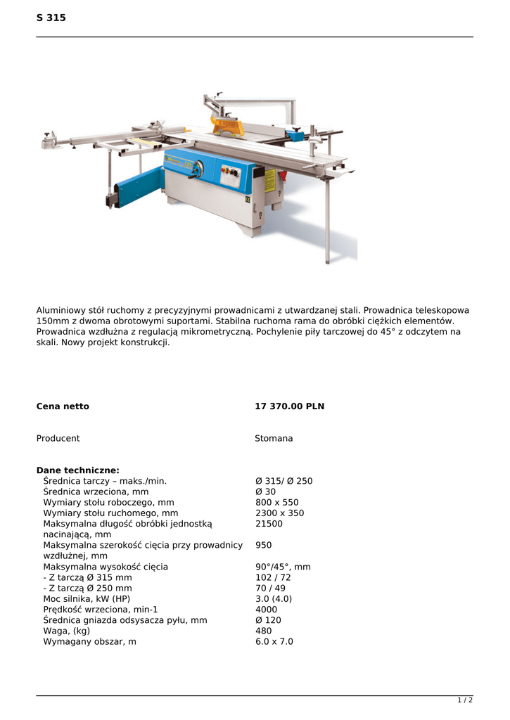 S 315 Aluminiowy stół ruchomy z precyzyjnymi prowadnicami z utwardzanej stali. Prowadnica teleskopowa 150mm z dwoma obrotowymi suportami. Stabilna ruchoma rama do obróbki ciężkich elementów. Prowadnica wzdłużna z regulacją mikrometryczną. Pochylenie piły tarczowej do 45° z odczytem na skali. Nowy projekt konstrukcji. Cena netto 17 370.00 PLN Producent Stomana Dane techniczne: Średnica tarczy – maks./min. Średnica wrzeciona, mm Wymiary stołu roboczego, mm Wymiary stołu ruchomego, mm Maksymalna długość obróbki jednostką nacinającą, mm Maksymalna szerokość cięcia przy prowadnicy wzdłużnej, mm Maksymalna wysokość cięcia - Z tarczą Ø 315 mm - Z tarczą Ø 250 mm Moc silnika, kW (HP) Prędkość wrzeciona, min-1 Średnica gniazda odsysacza pyłu, mm Waga, (kg) Wymagany obszar, m Ø 315/ Ø 250 Ø 30 800 x 550 2300 x 350 21500 950 90°/45°, mm 102 / 72 70 / 49 3.0 (4.0) 4000 Ø 120 480 6.0 x 7.0 1/2 S 315 Opcje: Jednostka nacinająca: Średnica tarczy, mm Średnica wrzeciona, mm Prędkość wrzeciona, min-1 Moc silnika, kW (HP) Moc silnika, kW (HP) Stół ruchomy, L, mm Maksymalna szerokość obróbki jednostką nacinającą, mm Maksymalna szerokość cięcia przy prowadnicy wzdłużnej, mm Rura odsysająca pył z wężem. Prowadnica kątowa. Ø 120 Ø 20 8000 0.75 (1.0) 4.0 (5.5) 1600, 2544, 2743, 3000, 3200 1270, 2400, 2640, 2900, 3100 1270, 1500 2/2 Powered by TCPDF (www.tcpdf.org)