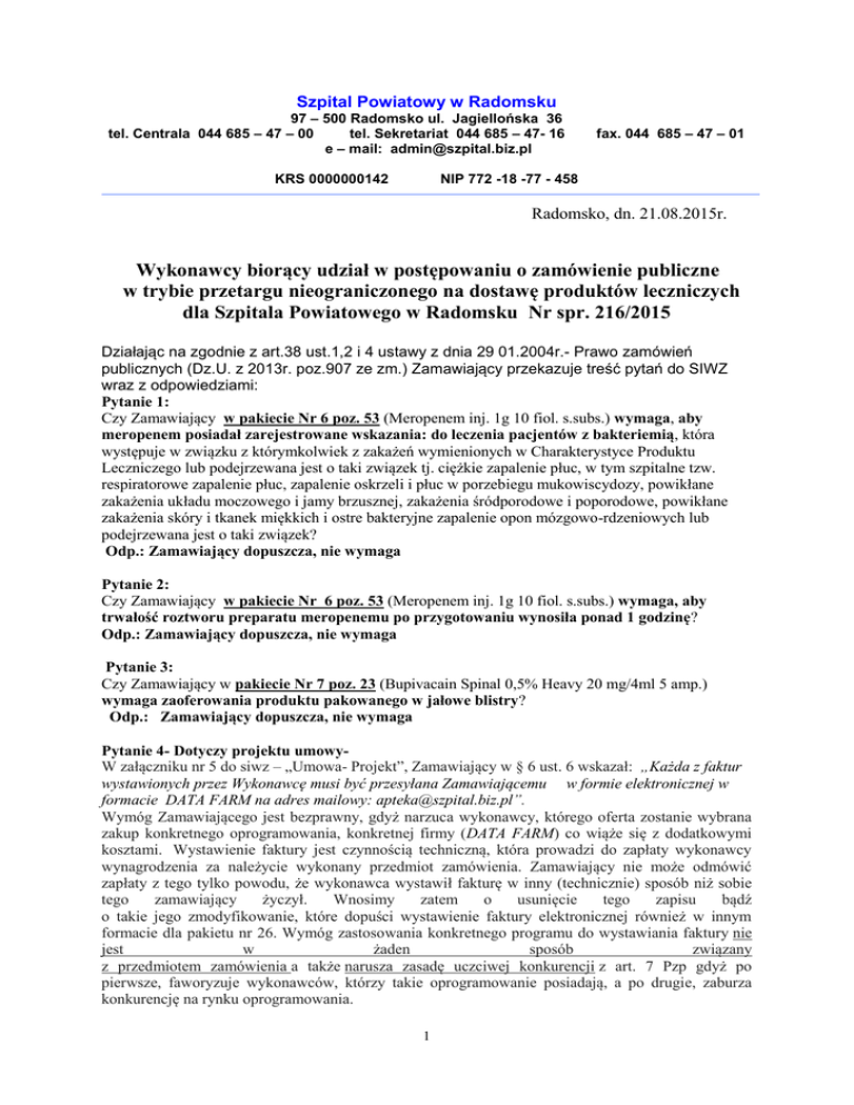 Szpital Powiatowy w Radomsku 97 – 500 Radomsko ul. Jagiellońska 36 tel. Centrala 044 685 – 47 – 00 tel. Sekretariat 044 685 – 47- 16 e – mail: [email protected] KRS 0000000142 fax. 044 685 – 47 – 01 NIP 772 -18 -77 - 458 Radomsko, dn. 21.08.2015r. Wykonawcy biorący udział w postępowaniu o zamówienie publiczne w trybie przetargu nieograniczonego na dostawę produktów leczniczych dla Szpitala Powiatowego w Radomsku Nr spr. 216/2015 Działając na zgodnie z art.38 ust.1,2 i 4 ustawy z dnia 29 01.2004r.- Prawo zamówień publicznych (Dz.U. z 2013r. poz.907 ze zm.) Zamawiający przekazuje treść pytań do SIWZ wraz z odpowiedziami: Pytanie 1: Czy Zamawiający w pakiecie Nr 6 poz. 53 (Meropenem inj. 1g 10 fiol. s.subs.) wymaga, aby meropenem posiadał zarejestrowane wskazania: do leczenia pacjentów z bakteriemią, która występuje w związku z którymkolwiek z zakażeń wymienionych w Charakterystyce Produktu Leczniczego lub podejrzewana jest o taki związek tj. ciężkie zapalenie płuc, w tym szpitalne tzw. respiratorowe zapalenie płuc, zapalenie oskrzeli i płuc w porzebiegu mukowiscydozy, powikłane zakażenia układu moczowego i jamy brzusznej, zakażenia śródporodowe i poporodowe, powikłane zakażenia skóry i tkanek miękkich i ostre bakteryjne zapalenie opon mózgowo-rdzeniowych lub podejrzewana jest o taki związek? Odp.: Zamawiający dopuszcza, nie wymaga Pytanie 2: Czy Zamawiający w pakiecie Nr 6 poz. 53 (Meropenem inj. 1g 10 fiol. s.subs.) wymaga, aby trwałość roztworu preparatu meropenemu po przygotowaniu wynosiła ponad 1 godzinę? Odp.: Zamawiający dopuszcza, nie wymaga Pytanie 3: Czy Zamawiający w pakiecie Nr 7 poz. 23 (Bupivacain Spinal 0,5% Heavy 20 mg/4ml 5 amp.) wymaga zaoferowania produktu pakowanego w jałowe blistry? Odp.: Zamawiający dopuszcza, nie wymaga Pytanie 4- Dotyczy projektu umowyW załączniku nr 5 do siwz – „Umowa- Projekt”, Zamawiający w § 6 ust. 6 wskazał: „Każda z faktur wystawionych przez Wykonawcę musi być przesyłana Zamawiającemu w formie elektronicznej w formacie DATA FARM na adres mailowy: [email protected]”. Wymóg Zamawiającego jest bezprawny, gdyż narzuca wykonawcy, którego oferta zostanie wybrana zakup konkretnego oprogramowania, konkretnej firmy (DATA FARM) co wiąże się z dodatkowymi kosztami. Wystawienie faktury jest czynnością techniczną, która prowadzi do zapłaty wykonawcy wynagrodzenia za należycie wykonany przedmiot zamówienia. Zamawiający nie może odmówić zapłaty z tego tylko powodu, że wykonawca wystawił fakturę w inny (technicznie) sposób niż sobie tego zamawiający życzył. Wnosimy zatem o usunięcie tego zapisu bądź o takie jego zmodyfikowanie, które dopuści wystawienie faktury elektronicznej również w innym formacie dla pakietu nr 26. Wymóg zastosowania konkretnego programu do wystawiania faktury nie jest w żaden sposób związany z przedmiotem zamówienia a także narusza zasadę uczciwej konkurencji z art. 7 Pzp gdyż po pierwsze, faworyzuje wykonawców, którzy takie oprogramowanie posiadają, a po drugie, zaburza konkurencję na rynku oprogramowania. 1 Odp.: Zamawiający modyfikuje projekt umowy w ten sposób, że wykreśla „ w formie DATA FARM” Pytanie 5 Czy Zamawiający wyrazi zgodę na zaoferowanie w pakiecie 6 pozycja 49 produktu leczniczego w opakowaniu po 5 ampułek? Odp. Zgodnie z Siwz Pytanie 6 Czy Zamawiający wyrazi zgodę na zaoferowanie w pakiecie 6 pozycja 59 produktu leczniczego w opakowaniu po 10 fiolek? Odp. Zgodnie z Siwz Pytanie 7 Czy Zamawiający wyrazi zgodę na zaoferowanie w pakiecie 7 pozycja 84 produktu leczniczego w opakowaniu po 5 fiolek? Odp. Zgodnie z Siwz Pytanie 8 Czy Zamawiający wyrazi zgodę na zaoferowanie w pakiecie 13 pozycja 3-5,10-13,18,27-31 płynów infuzyjnych z dwoma niezależnymi, jałowymi, różnej wielkości portami oddzielnie otwieranymi? Różnica w wielkości portów zapobiega pomyłce w trakcie użytkowania. Większy służy do przyłączenia zestawu do infuzji, mniejszy do dodania leku, zarówno przed infuzją, jak i w trakcie infuzji. Jałowe korki nie wymagają dezynfekcji przed pierwszym użyciem, co zmniejsza koszty użytkowania. Po usunięciu zestawu do infuzji lub igły po dodaniu leku korki samouszczelniają się i nie ma niebezpieczeństwa wycieku płynu, co eliminuje niebezpieczeństwo skażenia otoczenia, jeśli w opakowaniu był lek toksyczny i wykonywania dodatkowych czynności przez personel. Odp.: Zgodnie z Siwz Pytanie 9 Czy Zamawiający wyrazi zgodę na zaoferowanie w pakiecie 13 pozycja 24,25 produktu leczniczego Mannitol 20% w opakowaniu szklanym? Opakowanie szklane jest znacznie bezpieczniejsze w przypadku Mannitolu, gdyż jest całkowicie przezierne, co daje możliwość zauważenia i rozpuszczenia wszystkich skrystalizowanych cząsteczek. Odp.: Zgodnie z Siwz Pytanie 10 Czy Zamawiający wyrazi zgodę na zaoferowanie w pakiecie 13 pozycja 26 worka 3 komorowego Kabiven Peripheral do żywienia pozajelitowego do podawania obwodowo lub centralnie, zawierającego aminokwasy 45,0g, glukozę 130,0g, emulsję tłuszczową 68,0g, azot 7,2g i energię niebiałkową 1200 kcal objętość 1920ml? Odp.: Zgodnie z Siwz Pytanie 11 Czy Zamawiający wyrazi zgodę na zaoferowanie w pakiecie 13 pozycja 35 worka 3 komorowego SMOFKabiven zawierającego 10% roztwór aminokwasów 75,0g z tauryną, 12g azotu, glukozę z elektrolitami i cynkiem oraz unikalną emulsją tłuszczową 56g (30% oleju sojowego, 30% MCT, 25% oleju z oliwek, 15% oleju rybiego) węglowodany 187g o energii pozabiałkowej 1300 kcal, pojemności 1477ml? Odp.: Zgodnie z siwz 2 Pytanie 12 Czy Zamawiający wyrazi zgodę na zaoferowanie w pakiecie 13 pozycja 38 produktu leczniczego Venolyte – płyn wieloelektrolitowy bez jonów Ca zawierający chlorków 110,0 mmol/l, sodu 137,0 mmol/l zbuforowany octanem? Odp.: Zgodnie z siwz. Pytanie 13 Czy Zamawiający wyrazi zgodę na zaoferowanie w pakiecie 15 pozycja 2, produktu leczniczego Vo