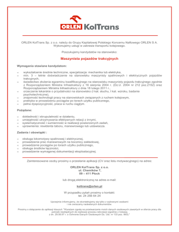 ORLEN KolTrans Sp. z o.o. naleŜy do Grupy Kapitałowej Polskiego Koncernu Naftowego ORLEN S A. Wykonujemy usługi w zakresie transportu kolejowego. Poszukujemy kandydatów na stanowisko: Maszynista pojazdów trakcyjnych Wymagania stawiane kandydatom: • • • • • • • wykształcenie średnie techniczne, specjalizacja: mechanika lub elektryka, min. 3 – letnie doświadczenie na stanowisku maszynisty spalinowych i elektrycznych pojazdów trakcyjnych, świadectwo złoŜenia egzaminu kwalifikacyjnego na stanowisku maszynisty pojazdu trakcyjnego zgodnie z Rozporządzeniem Ministra Infrastruktury z 16 sierpnia 2004 r. (Dz.U. 2004 nr 212 poz.2152) oraz Rozporządzeniem Ministra Infrastruktury z dnia 18 lutego 2011 r., orzeczenie lekarskie o przydatności na stanowisko (I kat. słuchu, I kat. wzroku, badanie psychotechniczne), znajomość technologii pracy na stanowiskach związanych z ruchem kolejowym, praktyka w prowadzeniu pociągów po torach uŜytku publicznego, pełna dyspozycyjność, praca w ruchu ciągłym. PoŜądane: • • • • dokładność i skrupulatność w działaniu, umiejętność utrzymywania efektywnych relacji z innymi, systematyczność i sumienność w realizacji powierzonych zadań, uprawnienia: rewidenta taboru, manewrowego lub ustawiacza. Zadania i obowiązki : • • • • • obsługa lokomotywy spalinowej i elektrycznej, prowadzenie prac manewrowych na bocznicy zakładowej, prowadzenie pociągów po torach uŜytku publicznego, obsługa środków łączności, prowadzenie wymaganej dokumentacji eksploatacyjnej. Zainteresowane osoby prosimy o przesłanie aplikacji (CV oraz listu motywacyjnego) na adres: ORLEN KolTrans Sp. z o.o. ul. Chemików 7, 09 – 411 Płock lub drogą elektroniczną na adres e-mail: [email protected] W przypadku pytań prosimy o kontakt: tel. 24 256 64 24 Uprzejmie informujemy, Ŝe skontaktujemy się tylko z wybranymi osobami i nie zwracamy nadesłanych dokumentów. Prosimy o dołączenie do aplikacji klauzuli: "WyraŜam zgodę na przetwarzanie moich danych osobowych zawartych w ofercie pracy dla potrzeb niezbędnych do realizacji procesu rekrutacji (zgodnie z Ustawą z dn. 29.08.97 r. o Ochronie Danych Osobowych Dz. Ust. nr 133 poz. 883)."