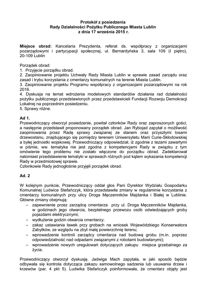 Protokół z posiedzenia Rady Działalności Pożytku Publicznego Miasta Lublin z dnia 17 września 2015 r. Miejsce obrad: Kancelaria Prezydenta, referat ds. współpracy z organizacjami pozarządowymi i partycypacji społecznej, ul. Bernardyńska 3, sala 109 (I piętro), 20-109 Lublin Porządek obrad: 1. Przyjęcie porządku obrad. 2. Zaopiniowanie projektu Uchwały Rady Miasta Lublin w sprawie zasad zarządu oraz zasad i trybu korzystania z cmentarzy komunalnych na terenie Miasta Lublin. 3. Zaopiniowanie projektu Programu współpracy z organizacjami pozarządowymi na rok 2016. 4. Dyskusja na temat wdrożenia modelowych standardów działania rad działalności pożytku publicznego przedstawionych przez przedstawicieli Fundacji Rozwoju Demokracji Lokalnej na poprzednim posiedzeniu. 5. Sprawy różne. Ad 1. Przewodniczący otworzył posiedzenie, powitał członków Rady oraz zaproszonych gości, a następnie przedstawił proponowany porządek obrad. Jan Rybojad zapytał o możliwość zaopiniowania przez Radę sprawy związanej ze stanem oraz przyszłymi losami drzewostanu, znajdującego się pomiędzy terenem Uniwersytetu Marii Curie-Skłodowskiej a byłej jednostki wojskowej. Przewodniczący odpowiedział, iż zgodnie z tezami zawartymi w piśmie, ww. tematyka nie jest zgodna z kompetencjami Rady w związku z tym omówienie tego problemu nie zostało włączone do porządku obrad. Zadeklarował natomiast przedstawienie tematyki w sprawach różnych pod kątem wykazania kompetencji Rady w przedmiotowej sprawie. Członkowie Rady jednogłośnie przyjęli porządek obrad. Ad. 2 W kolejnym punkcie, Przewodniczący oddał głos Pani Dyrektor Wydziału Gospodarku Komunalnej Ludwice Stefańczyk, która przedstawiła zmiany w regulaminie korzystania z cmentarzy komunalnych przy ulicy Droga Męczenników Majdanka i Białej w Lublinie. Główne zmiany obejmują: – zapewnienie przez zarządcę cmentarza przy ul. Droga Męczenników Majdanka, w godzinach jego otwarcia, bezpłatnego przewozu osób odwiedzających groby pojazdami elektrycznymi; – wydłużenie godzin otwarcia cmentarzy; – zakaz ustawiania ławek przy grobach na wniosek Wojewódzkiego Konserwatora Zabytków, ze względu na zbyt małą powierzchnię terenu; – wprowadzenie kontroli zarządcy cmentarza nad budową grobu (m.in. poprzez odpowiedzialność nad odpadami związanymi z robotami budowlanymi); – wprowadzenie nowych uregulowań dotyczących zakupu miejsca grzebalnego za życia. Przewodniczący otworzył dyskusję. Jadwiga Mach zapytała, w jaki sposób będzie odbywała się kontrola dotycząca zakazu samowolnego sadzenia lub usuwania drzew i krzewów (par. 4 pkt 5). Ludwika Stefańczyk poinformowała, że cmentarz objęty jest dokumentacją projektową, w której nie przewidziano miejsca na dobrowolne zagospodarowanie terenu przez jej użytkowników. Kontrola oraz egzekwowanie przepisów zawartych w regulaminie korzystania z cmentarza będą się odbywały na podstawie umowy zawartej pomiędzy Gminą Lublin, a zarządcą cmentarza, w której doprecyzowano zakres odpowiedzialności. Jadwiga Mach poruszyła kwestię, aby pracownicy Wydziału Gospodarki Komunalnej po uzgodnieniu z zarządca cmentarza zwiększyli częstotliwość ruchu pojazdów (par. 11 ust 6) do dwóch niedziel w miesiącu. W tej kwestii głos zabrali W. Krakowski, J. Kosowski, J. Rybojad i P. Choros odnieśli się negatywnie do tego pomysłu zważywszy na ruch pieszych i skalę wydanych zezwoleń. Ostatecznie wniosek nie został poddany pod głosowanie. Członkowie Rady zaś jednogłośnie opowiedzieli się za wnioskiem dotyczącym skrócenia czasu ruchu pojazdów mechanicznych w okresie od 1 kwietnia do 30 października do godziny 20.00. Jadwiga Mach poruszyła również problem zaniedbanych grobów, których jest coraz więcej na cmentarzach. Katarzyna Chałabis (kierownik referatu ds. cmentarnictwa oraz miejsc pamięci narodowej w Wydziale Gospodarki Komunalnej) poinformowała, iż obecnie obowiązujące przepisy uniemożliwiają Gminie Lublin wydatkowanie środków na opiekę nad grobami osób prywatnych (z wyjątkiem pochówków odbywających się ze środków gminy). Członkowie Rady obecni na posiedzeniu jednogłośnie przyjęli projekt Uchwały Rady Miasta Lublin w sprawie zasad zarządu oraz zasad i trybu korzystania z cmentarzy komunalnych na terenie Miasta Lublin. Jakub Kosowski wskazał, że ze względu na brak kworum głosowanie nieobecnych członków Rady odbędzie się drogą elektroniczną. W przypadku rekomendacji dotyczącej skrócenia czasu dostępności pojazdów elektronicznych w sezonie letnim do godz. 20 dziewięciu członków Rady było za. Jakub Kosowski wskazał, że ze względu na brak kworum głosowanie nieobecnych członków Rady odbędzie się drogą elektroniczną. Ad. 3 Rozpoczynając dyskusję nad projektem Programu współpracy z organizacjami pozarządowymi na rok 2016 Piotr Choroś zaprezentował zmiany wprowadzone do dokumentu w stosunku do jego kształtu w roku 2015. Główne zmiany obejmują: – podział zakresu przedmiotowego oraz priorytetowych zadań publicznych (rozdz. 5 par. 6 ust 1 i 2) na realizowane we współpracy finansowej i pozafinansowej; – wprowadzenie dodatkowego działania w ramach współpracy finansowej: „udzielanie nieodpłatnego poradnictwa prawnego na podstawie ustawy z dnia 5 sierpnia 2015 r. o nieodpłatnej pomocy prawnej oraz edukacji obywatelskiej”; Karol Wołek zgłosił dodatkowy zapis w ramach punktu 10) upowszechnianie i ochrona wolności i praw człowieka oraz swobód obywatelskich, a także działania wspomagające rozwój demokracji: "d) podejmowanie działań promujących postawy obywatelskie i patriotyczne". Jakub Kosowski oraz Piotr Choroś podkreślili, iż jest to zadanie wpisujące się w kompetencje wojewody. W wyniku głosowania wniosek Karola Wołka otrzymał następującą ilość głosów: 6 za, 2 przeciw, 1 wstrzymujący się. Jakub Kosowski wskazał, że ze wzglę
