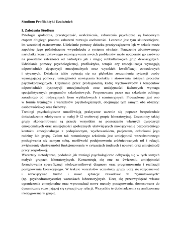 Studium Profilaktyki Uzależnień I. Założenia Studium Patologia społeczna, przestępczość, uzależnienia, zaburzenia psychiczne są końcowym etapem długiego procesu zaburzeń rozwoju osobowości. Leczenie jest tym skuteczniejsze, im wcześniej zastosowane. Udzielanie pomocy dziecku przeżywającemu lęk w szkole może zapobiec jego późniejszemu wypadnięciu z systemu oświaty. Nauczenie zbuntowanego nastolatka konstruktywnego rozwiązywania swoich problemów może uodpornić go zarówno na powstanie zależności od narkotyku jak i magię subkulturowych grup dewiacyjnych. Udzielanie pomocy psychologicznej, profilaktyka, terapia czy resocjalizacja wymagają odpowiednich dyspozycji emocjonalnych oraz wysokich kwalifikacji zawodowych i etycznych. Działania takie opierają się na głębokim zrozumieniu sytuacji osoby wymagającej pomocy, umiejętności nawiązania kontaktu i stosowania różnych procedur psychokorekcyjnych. Uzyskanie przez profesjonalną kadrę wychowawców i terapeutów odpowiednich dyspozycji emocjonalnych oraz umiejętności fachowych wymaga specjalistycznych programów szkoleniowych. Proponowane przez nas szkolenie odbiega zasadniczo od tradycyjnych form wykładowych i seminaryjnych. Prowadzone jest ono w formie treningów i warsztatów psychologicznych, obejmując tym samym oba obszary: osobowościowy oraz fachowy. Treningi psychologiczne umożliwiają praktyczne uczenie się poprzez bezpośrednie doświadczenie zdobywane w małej 8-12 osobowej grupie laboratoryjnej. Uczestnicy takiej grupy skoncentrowani są przede wszystkim na poszerzaniu własnych dyspozycji emocjonalnych oraz umiejętności społecznych ułatwiających nawiązywanie bezpośredniego kontaktu emocjonalnego z podopiecznym, wychowankiem, pacjentem, członkami jego rodziny lub grupą. Celem tak rozumianego szkolenia jest umiejętność wszechstronnego posługiwania się samym sobą, możliwość podejmowania zróżnicowanych ról i relacji, zwiększenie elastyczności funkcjonowania w sytuacjach trudnych i nowych oraz umiejętność pracy zespołowej. Warsztaty metodyczne, podobnie jak treningi psychologiczne odbywają się w tych samych małych grupach laboratoryjnych. Koncentrują się one na ćwiczeniu umiejętności formułowania specyficznej wieloczynnikowej diagnozy oraz programowaniu i realizacji postępowania korekcyjnego. W trakcie warsztatów uczestnicy grupy uczą się rozpoznawać i rozwiązywać trudne i nowe sytuacje zawodowe w "symulowanych" (np. psychodramatycznie) warunkach laboratoryjnych. Uczą się przezwyciężać własne ograniczenia emocjonalne oraz wprowadzać nowe metody postępowania, dostosowane do dynamicznie rozwijającej się sytuacji czy relacji. Wszystkie te doświadczenia są analizowane i korygowane w grupie. II. Uczestnicy Studium Szkolenie zawodowe w ramach Studium Profilaktyki Uzależnień obejmuje pracę nad sobą oraz praktyczne ćwiczenie metodyki pracy. Takie podejście do szkolenia zawodowego oparte jest na współczesnych metodach interwencji kryzysowej, pomocy psychologicznej, psychoterapii i resocjalizacji. Wymaga ono od uczestników znacznej otwartości, aktywności i gotowości do poszukiwania nowych sposobów funkcjonowania. Sprzyja temu poczucie psychologicznego bezpieczeństwa w grupie, wynikające z tego, że uczestnicy rekrutują się z różnych placówek z całego kraju, nie znają się i nie są w żaden sposób powiązani służbowo. Decyzja o podjęciu szkolenia powinna więc być indywidualna i całkowicie dobrowolna. Przyjmujemy wyłącznie zgłoszenia osób, które są zainteresowane udziałem w całym cyklu zajęć oraz gotowe na aktywną pracę nad sobą, własnymi problemami i ograniczeniami społecznymi i emocjonalnymi. Zajęcia warsztatowe w ramach Studium prowadzone są w dwóch specjalnościach: społeczności terapeutycznej oraz pracy środowiskowej. Zajęcia w zakresie pracy ze społecznością terapeutyczną prowadzone są dla pracowników ośrodków leczenia uzależnień, ośrodków resocjalizacyjnych "MONAR-u", domów dziecka, pogotowi opiekuńczych, zakładów wychowawczych, zakładów poprawczych i innych placówek stacjonarnych. Zajęcia w zakresie pracy środowiskowej prowadzone są dla pracowników szkół, poradni i punktów konsultacyjnych, ognisk wychowawczych, świetlic terapeutycznych, klubów środowiskowych, ośrodków kuratorskich i innych programów psychoprofilaktycznych. Warunkiem przyjęcia kandydata na Studium jest jego własnoręczne pisemne zgłoszenie zawierające wszystkie wymagane przez nas informacje, pisemna akceptacja kierownika jego placówki oraz udział w organizowanym przez nas spotkaniu informacyjnym. Nabór uczestników na kolejny cykl zajęć szkoleniowych prowadzimy raz w roku, z reguły w zimie. W wypadku większej ilości zgłoszeń niż przewidywanych miejsc, przeprowadzamy postępowanie kwalifikacyjne. III. Zespół prowadzący szkolenie Jesteśmy zespołem terapeutów i wychowawców. Prowadzimy różne programy środowiskowe obejmujące resocjalizację, wychowanie korekcyjne, pomoc psychologiczną, leczenie uzależnie oraz rehabilitację psychiatryczną. Specyfiką prowadzonych przez nas programów jest praca środowiskowa, praca z rodziną, podejście systemowe oraz nastawienie na aktywizację potencjalnych możliwości odbiorcy. Zespół nasz od 25-ciu lat prowadzi różne formy szkolenia zawodowego pracowników służby zdrowia, edukacji, pomocy społecznej i resocjalizacji. W organizowanych przez nas treningach i warsztatach wzięło dotychczas udział ponad 5000 osób (lekarzy, psychologów, instruktorów terapii, pielęgniarek, nauczycieli, wychowawców, kuratorów, pracowników socjalnych, studentów uniwersyteckich kierunków społecznych i medycyny itp.). Zajęcia treningowe i warsztatowe w ramach Studium prowadzone są przez pracowników i współpracowników naszego Towarzystwa, którzy mają znaczne doświadczenie w zakresie pracy środowiskowej, interwencji kryzysowej, re
