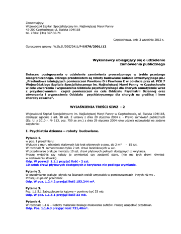 Zamawiający: Wojewódzki Szpital Specjalistyczny im. Najświętszej Maryi Panny 42-200 Częstochowa ul. Bialska 104/118 tel. i faks: (34) 367-36-74 Częstochowa, dnia 3 września 2012 r. Oznaczenie sprawy: W.Sz.S./DDZ/2411/P-8/076/2001/12 Wykonawcy ubiegający się o udzielenie zamówienia publicznego Dotyczy: postępowania o udzielenie zamówienia prowadzonego w trybie przetargu nieograniczonego, którego przedmiotem są roboty budowlane zadania inwestycyjnego pn.: „Przebudowa istniejących pomieszczeń Pawilonu D i Pawilonu E w obiekcie przy ul. PCK 7 Wojewódzkiego Szpitala Specjalistycznego im. Najświętszej Maryi Panny w Częstochowie w celu utworzenia i wyposażenia Oddziału psychiatrycznego dla chorych somatycznie wraz z przystosowaniem części pomieszczeń na cele Oddziału Psychiatrii Dziennej oraz utworzenia i wyposażenia Oddziału psychiatrycznego dla chorych na gruźlicę i inne choroby zakaźne”. WYJAŚNIENIA TREŚCI SIWZ - 2 Wojewódzki Szpital Specjalistyczny im. Najświętszej Maryi Panny w Częstochowie, ul. Bialska 104/118, działając zgodnie z art. 38 ust. 2 ustawy z dnia 29 stycznia 2004 r. - Prawo zamówień publicznych (Dz. U. z 2010 r. Nr 113, poz. 759 ze zm.) z dnia 29 stycznia 2004 roku udziela odpowiedzi na zadane zapytania: I. Psychiatria dzienna – roboty budowlane. Pytanie 1. w poz. 1 przedmiaru: Wykucie z muru ościeżnic stalowych lub krat okiennych o pow. do 2 m² - 15 szt. W rozdziale 9 zamontowano tylko 2 szt. drzwi łazienkowych w wc. W przedmiarze brakuje montażu 10 szt. drzwi płytowych pełnych dostępnych z korytarza. Proszę wyjaśnić czy należy je wymieniać czy zostawić stare. (nie ma tych drzwi również w zestawieniu stolarki). Odp. W pozycji 1.1.1 przyjąć ilość - 2 szt. 10 sztuk drzwi płytowych dostępnych z korytarza nie podlega wymianie. Pytanie 2. W przedmiarze brakuje płytek na ścianach wokół umywalek w pomieszczeniach innych niż wc . Proszę uzupełnić przedmiar. Odp. W poz. 1.2.4.2 przyjąć ilość 153,244 m². Pytanie 3. Poz. 1.1.5.1 Zabezpieczenia kątowe – powinno być 33 mb. Odp. W poz. 1.1.5.1 przyjąć ilość 33 mb. Pytanie 4. W rozdziale 1.1.6 – Roboty malarskie brakuje malowania sufitów. Proszę uzupełnić przedmiar. Odp. Poz. 1.1.6.3 przyjąć ilość 731,48m². Pytanie 5. Proszę o potwierdzenie, że meble do montażu nie wchodzą w zakres przetargu. Odp. Potwierdzamy, że meble do montażu nie wchodzą w zakres przetargu. Pytanie 6. Proszę o potwierdzenie, że wyposażenie łazienek typu : pojemniki, wieszaki, dozowniki i lustra nie wchodzą w zakres przetargu. Odp. Potwierdzamy, że wyposażenie łazienek typu pojemniki, wieszaki, dozowniki nie wchodzą w zakres przetargu. Lustra o następujących wymiarach 135x90-1sztuka, 120x90-1 sztuka, 190x90-1sztuka wchodzą w zakres przetargu. II. Psychiatria somatyczna – roboty budowlane. Pytanie 7. W przedmiarze brakuje płytek na ścianach wokół umywalek w pomieszczeniach Proszę uzupełnić przedmiar. Odp. W Poz. 1.2.4.2 dodać ilość 320,07m². innych niż wc. Pytanie 8. Poz. 1.2.4.2. – Okładziny ścienne z płytek 30x45cm – w aranżacji łazienek płytki. Ułożone są do wysokości 2,50 m a powyżej zamontowano sufit z płyt g-k. W przedmiarze nie ma sufitu a płytki zamontowano do wys. 3,20 m. Proszę zdecydować, czy ma być wg dokumentacji czy wg przedmiaru. Odp. Przyjąć wytyczne według przedmiaru. Pytanie 9. Rozdział 1.2.5 Instalowanie wyrobów metalowych – obmiar jest przepisany z oddziału Dziennego a korytarz oddziału somatycznego jest prawie trzy razy większy od dziennego – Proszę o zamieszczenie prawidłowych przedmiarów. Odp. W pozycjach poz. 1.2.5.2 -1.2.5.3 przyjąć obmiar 70,35m. W pozycji 1.2.5.1 przyjąć obmiar 75m. Pytanie 10. Rozdział 1.2.6. Roboty malarskie – proszę zamieścić prawidłowy przedmiar. Rozdział 1.2.9. Stolarka budowlana: Odp. Przyjąć ilość 731,48 m². Pytanie 11. Czego dotyczy pozycja 1.2.9.6. – drzwi al. 2,29x2,50 m. Odp. Nie wyceniać pozycji. Pytanie 12. Czy okno 0,90x0,90 w POM 1.12 ma być oknem weneckim czy zwykłym ? Odp. Okno w pomieszczeniu 1.12 ma być oknem weneckim. Pytanie 13. W pozycjach 1.2.9.7 i 1.2.9.8 jest zły obmiar okien. Proszę o poprawienie. Odp. W pozycji 1.2.9.7 przyjąć obmiar-3,863m². W poz. 1.2.9.8 przyjąć obmiar-0,81m². Pytanie 14. Proszę o potwierdzenie, że meble do montażu nie wchodzą w zakres przetargu. Odp. Potwierdzamy, że meble do montażu nie wchodzą w zakres przetargu. Pytanie 15. Proszę o potwierdzenie, że wyposażenie łazienek typu : pojemniki, wieszaki, dozowniki i lustra nie wchodzą w zakres przetargu. Odp. Potwierdzamy, że wyposażenie łazienek typu pojemniki, wieszaki, dozowniki nie wchodzą w zakres przetargu. Lustra o następujących wymiarach 90x90-1sztuka, 135x902 sztuki, 215x90-1sztuka, 120x90-1sztuka, 195x90-1sztuka wchodzą w zakres przetargu. Pytanie 16. W przedmiarze brakuje ścianek systemowych w łazience męskiej 1.6 – Proszę o uzupełnienie przedmiaru. Odp. Dodać pozycję Kalkulacja własna Ścianki systemowe – ilość 3,15 m². Pytanie 17. W pomieszczeniu 1.14. Loża pielęgniarek i w korytarzu na rysunku sufity – widoczny jest sufit podwieszany z płyt gips-karton w kształcie półkola, w przedmiarach nie ma takiego sufitu. Prosimy o uzupełnienie przedmiarów. Odp. Ujęto w pozycji 1.2.8.1. Pytanie 18. Po wizji lokalnej stwierdziliśmy, że większość ścian i sufitów w oddziale somatycznym pomalowane są farbą olejną. Proszę poinformować nas w jaki sposób mają być przygotowane powierzchnie pod malowanie farbami lateksowymi. Technologia przecierania tynków odnosi się do tynków malowanych farbami mineralnymi a nie olejnymi. Proszę o podanie obmiaru i sposobu likwidacji lamperii na ścianach i sufitach. Odp. Dodać pozycję KNNR-W 3 1005-01 Ługowanie farby olejnej z tynków ścian ilość 499,75m². Dodać pozycję KNNR-W 3 1005-02 Ługowanie farby olejnej z tynków sufitów iloś