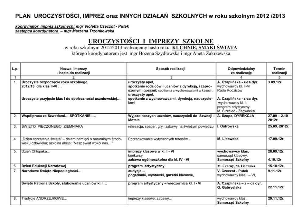 PLAN UROCZYSTOŚCI, IMPREZ oraz INNYCH DZIAŁAŃ SZKOLNYCH w roku szkolnym 2012 /2013 koordynator imprez szkolnych: mgr Violetta Czeczot - Putek zastępca koordynatora – mgr Marzena Trzonkowska UROCZYSTOŚCI I IMPREZY SZKOLNE w roku szkolnym 2012/2013 realizujemy hasło roku: KUCHNIE, SMAKI ŚWIATA którego koordynatorem jest mgr Bożena Szydłowska i mgr Aneta Zakrzewska L.p. 1 1. Nazwa imprezy - hasło do realizacji 2 Uroczyste rozpoczęcie roku szkolnego 2012/13 dla klas II-VI … Uroczyste przyjęcie klas I do społeczności uczniowskiej… Sposób realizacji 3 uroczysty apel, spotkanie rodziców i uczniów z dyrekcją, i zaproszonymi gośćmi; spotkania z wychowawcami w kasach. uroczysty apel, spotkanie z wychowawcami, dyrekcją, nauczycielami Odpowiedzialny za realizację 4 A. Czaplińska - z-ca dyr. wychowawcy kl. II-VI Rada Rodziców A. Czaplińska - z-ca dyr. wychowawcy kl. I: program artystyczny: M. Strzelec - Zagwocka Wyjazd naszych uczniów, nauczycieli do Szwecji - A. Szopa, DYREKCJA Motala Termin realizacji 5 3.09.12r. 2. Współpraca ze Szwedami… SPOTKANIE I… 3. ŚWIĘTO PIECZONEGO ZIEMNIAKA rekreacja, spacer, gry i zabawy na świeżym powietrzu I. Ostrowska 25.09. 2012r. 4. „Dzień sprzątania świata” – dniem pamięci o naturalnym środowisku człowieka; szkolna akcja: ”Nasz świat wokół nas…” Porządkowanie wytyczonych terenów… M. Lisowska 17.09.12r. 5. Dzień Chłopaka… imprezy klasowe w kl. I - VI konkursy zabawa ogólnoszkolna dla kl. IV - VI wychowawcy klas, samorząd klasowy, Samorząd Szkolny 28.09.12r. Dzień Edukacji Narodowej Narodowe Święto Niepodległości… program artystyczny audycja… pogadanki, wystawki, gazetki klasowe, M. Czarny, M. Lisowska V. Czeczot - Putek wychowawcy klas I – VI, 15.10.12r. 9.11.12r. Święto Patrona Szkoły, ślubowanie uczniów kl. I… program artystyczny – wieczornica kl. I - VI A. Czaplińska – z – ca dyr. G. Gabryelska 6. 7. 8. Tradycje ANDRZEJKOWE… imprezy klasowe, zabawy… wychowawcy klas, Samorząd Szkolny 27.09 – 2.10 2012r. 4.10.12r 22.11.12r. 29.11.12r. 9. Mikołajki… imprezy klasowe … impreza ogólnoszkolna 10. Spotkania świąteczne… Świąteczne klimaty… spotkanie wigilijne…dla pracowników spotkanie wigilijne w klasach… wychowawcy klas I – VI, ks. J. Dąbrowski, A, Zakrzewska , V. Czeczot A. Zakrzewska ks. J. Dąbrowski DYREKCJA wych. klas I - VI 6.12.12r. A.Czaplińska – z-ca dyr. A.Szopa wychowawcy klas, Samorząd Szkolny 21.01.13r. 21.12.12r. 11. 150 rocznica wybuchu Powstania Listopadowego apel, audycja… 12. Bale noworoczne… zabawy, bale przebierańców… 13. Dzień Dziewczyn… imprezy, konkursy w klasach… wychowawcy klas Samorząd Szkolny 8.03.13r. 14. Dzień Otwartych Drzwi Jedenastki… prezentacje działań szkoły dla rodziców uczniów kl. I DYREKCJA, n –ciele 27.03.13r. 15. Pierwszy dzień wiosny… XVII Rajd Pieszy po Ziemi Opolskiej… M. Lisowska kl. IV - VI E. Czachor kl. I - III wychowawcy klas I – VI 21.03.13r. A. Szopa DYREKCJA A. Skotniczny ks. J.Dąbrowski wychowawcy klas I - VI III – IV 2013r. konkursy, ognisko, gry i zabawy na świeżym powietrzu do 8 lutego 2013r. 16. Współpraca ze Szwedami… Spotkanie II Wizyta młodzieży i nauczycieli ze Szwecji u nas… 17. Wielkanoc – zwyczaje, tradycje z okazji świąt … gazetki klasowe, świąteczne dekoracje w klasach, wystawki, 18. Uchwalenie Konstytucji 3 Maja apel – akademia A. Sojka, 29 lub 30.04.13r. 19. XXI edycja Festynu Środowiskowego wg harmonogramu Dyrekcja Rada Rodziców 18.05.13r. 20. Uroczyste zakończenie roku szkolnego 2012/ 2013 dla klas I - V uroczysty apel , spotkanie z dyrekcją, nauczycielami, rodzicami… Dyrekcja, Rada Rodziców, wychowawcy klas I – V 28.06.13r. 26 - 3.04.13r. 21. Uroczyste zakończenie roku szkolnego 2012/2013 dla klas VI… Uroczyste wreczenie uczniom kl. VI statuetek: CHABROWSKIEGO ORLĄTKA, WALECZNYCH SERC… uroczysty apel, program artystyczny Dyrekcja, Rada Rodziców, wychowawcy klas I: i klas VI: 28.06.13r. pogadanka Odpowiedzialny za realizację A. Czaplińska – z-ca dyr. Termin realizacji 1.09.12r. pogadanki w klasach II – VI, lekcje jęz. polskiego i historii kl. IV – VI; gazetki: ogólnoszkolna i klasowe wychowawcy klas, n-ciele j. polskiego, historii 1-30.09.12r. do 2.10.12r. uczestniczenie w WOJEWÓDZKICH OBCHODACH ROCZNICY… delegacji szkoły - uczniów kl. VI z nauczycielem - wyjście na GOLGOTĘ WSCHODU spotkania z kresowiankami, kombatantami… Dyrekcja, wyjście pocztu sztandarowego…ucz. kl. VI 17.09.12r. g.12.00 A.Czaplińska – z-ca dyr. cały rok pogadanki w klasach, gazetki klasowe, gazetka ogólnoszkolna, wizyta na cmentarzu… wychowawcy klas I - VI Samorząd Szkolny V. Czeczot, /kl. VIB reprezent. szkołę/ K.Saj, A. Kosielska 25-31.10.12r. 25X- 4 XI 12r. INNE DZIAŁANIA SZKOŁY L.p. 1. Hasło do realizacji 73 - rocznica wybuchu II wojny światowej… 68 – rocznica zakończenia Powstania Warszawskiego… 2. 73 rocznica najazdu sowieckiego… 3. Realizacja projektu:” ŻYWA LEKCJA HISTORII…” 4. Wszystkich Świętych… Zaduszki… 5. 6. 7. 8. Charytatywny, świąteczny kiermasz z okazji Świąt Bożego Narodzenia, Wielkanocy.. Dzień Ziemi…: Światowy Dzień Książki… Podsumowanie osiągnięć edukacyjnych i wychowawczych uczniów klas I – VI w I semestrze Sposób realizacji kiermasz dla Rodziców konkursy: plastyczny… ekologiczny… wystawa w bibliotece…, pokaz multimedialny… apel 24.10.12r. 18-21.12.12r. 25–27.03.13r. D. Draguć 20.04.13r. M. Lisowska K. Dmochowska D. Polak - kl. I – III K. Ratajczak– kl. IV - VI 22.04.13r. 26.06.13r. 1. Odpowiedzialność za techniczne przygotowanie sali gimnastycznej (i innych ) – krzesła, wykładziny, przed i po uroczystości – D. Dubanowicz 2. Muzykę na poszczególne uroczystości przygotowuje lub pomaga przygotować ( wg potrzeb ) A. Majewska, dekoracje: D. Draguć i M. Trzonkowska 3. Każda klasa w ciągu roku szkolnego powinn