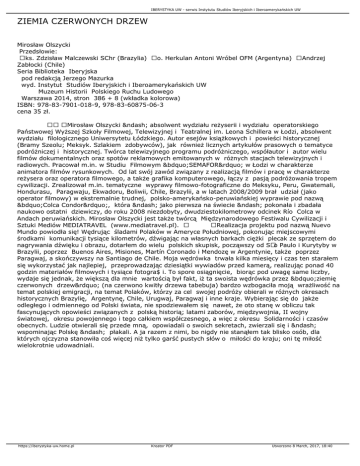 IBERYSTYKA UW - serwis Instytutu Studiów Iberyjskich i Iberoamerykańskich UW ZIEMIA CZERWONYCH DRZEW Mirosław Olszycki Przedsłowie: ks. Zdzisław Malczewski SChr (Brazylia) o. Herkulan Antoni Wróbel OFM (Argentyna) Andrzej Zabłocki (Chile) Seria Biblioteka Iberyjska pod redakcją Jerzego Mazurka wyd. Instytut Studiów Iberyjskich i Iberoamerykańskich UW Muzeum Historii Polskiego Ruchu Ludowego Warszawa 2014, stron 386 + 8 (wkładka kolorowa) ISBN: 978-83-7901-018-9, 978-83-60875-06-3 cena 35 zł. Mirosław Olszycki – absolwent wydziału reżyserii i wydziału operatorskiego Państwowej Wyższej Szkoły Filmowej, Telewizyjnej i Teatralnej im. Leona Schillera w Łodzi, absolwent wydziału filologicznego Uniwersytetu Łódzkiego. Autor esejów książkowych i powieści historycznej (Bramy Szeolu; Meksyk. Szlakiem zdobywców), jak również licznych artykułów prasowych o tematyce podróżniczej i historycznej. Twórca telewizyjnego programu podróżniczego, współautor i autor wielu filmów dokumentalnych oraz spotów reklamowych emitowanych w różnych stacjach telewizyjnych i radiowych. Pracował m.in. w Studiu Filmowym „SEMAFOR” w Łodzi w charakterze animatora filmów rysunkowych. Od lat swój zawód związany z realizacją filmów i pracę w charakterze reżysera oraz operatora filmowego, a także grafika komputerowego, łączy z pasją podróżowania tropem cywilizacji. Zrealizował m.in. tematyczne wyprawy filmowo-fotograficzne do Meksyku, Peru, Gwatemali, Hondurasu, Paragwaju, Ekwadoru, Boliwii, Chile, Brazylii, a w latach 2008/2009 brał udział (jako operator filmowy) w ekstremalnie trudnej, polsko-amerykańsko-peruwiańskiej wyprawie pod nazwą „Colca Condor”, która – jako pierwsza na świecie – pokonała i zbadała naukowo ostatni dziewiczy, do roku 2008 niezdobyty, dwudziestokilometrowy odcinek Río Colca w Andach peruwiańskich. Mirosław Olszycki jest także twórcą Międzynarodowego Festiwalu Cywilizacji i Sztuki Mediów MEDIATRAVEL (www.mediatravel.pl). Realizacja projektu pod nazwą Nuevo Mundo powiodła się! Wędrując śladami Polaków w Ameryce Południowej, pokonując miejscowymi środkami komunikacji tysiące kilometrów, dźwigając na własnych barkach ciężki plecak ze sprzętem do nagrywania dźwięku i obrazu, dotarłem do wielu polskich skupisk, począwszy od São Paulo i Kurytyby w Brazylii, poprzez Buenos Aires, Misiones, Martín Coronado i Mendozę w Argentynie, także poprzez Paragwaj, a skończywszy na Santiago de Chile. Moja wędrówka trwała kilka miesięcy i czas ten starałem się wykorzystać jak najlepiej, przeprowadzając dziesiątki wywiadów przed kamerą, realizując ponad 40 godzin materiałów filmowych i tysiące fotogra$ i. To spore osiągnięcie, biorąc pod uwagę same liczby, wydaje się jednak, że większą dla mnie wartością był fakt, iż ta swoista wędrówka przez „ziemię czerwonych drzew” (na czerwono kwitły drzewa tabebuja) bardzo wzbogaciła moją wrażliwość na temat polskiej emigracji, na temat Polaków, którzy za cel swojej podróży obierali w różnych okresach historycznych Brazylię, Argentynę, Chile, Urugwaj, Paragwaj i inne kraje. Wybierając się do jakże odległego i odmiennego od Polski świata, nie spodziewałem się nawet, że oto stanę w obliczu tak fascynujących opowieści związanych z polską historią; latami zaborów, międzywojnia, II wojny światowej, okresu powojennego i tego całkiem współczesnego, a więc z okresu Solidarności i czasów obecnych. Ludzie otwierali się przede mną, opowiadali o swoich sekretach, zwierzali się i – wspominając Polskę – płakali. A ja razem z nimi, bo nigdy nie stanąłem tak blisko osób, dla których ojczyzna stanowiła coś więcej niż tylko garść pustych słów o miłości do kraju; oni tę miłość wielokrotnie udowadniali. https://iberystyka-uw.home.pl Kreator PDF Utworzono 8 March, 2017, 18:40