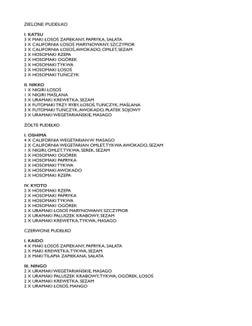 ZIELONE PUDEŁKO I. KATSU 3 X MAKI ŁOSOŚ ZAPIEKANY, PAPRYKA, SAŁATA 3 X CALIFORNIA ŁOSOŚ MARYNOWANY, SZCZYPIOR 3 X CALIFORNIA ŁOSOŚ, AWOKADO, OMLET, SEZAM 2 X HOSOMAKI RZEPA 2 X HOSOMAKI OGÓREK 2 X HOSOMAKI TYKWA 2 X HOSOMAKI ŁOSOŚ 2 X HOSOMAKI TUŃCZYK II. NIKKO 1 X NIGIRI ŁOSOŚ 1 X NIGIRI MAŚLANA 3 X URAMAKI KREWETKA, SEZAM 3 X FUTOMAKI TRZY RYBY, ŁOSOŚ, TUŃCZYK, MAŚLANA 3 X FUTOMAKI TUŃCZYK, AWOKADO, PŁATEK SOJOWY 3 X URAMAKI WEGETARIAŃSKIE, MASAGO ŻÓŁTE PUDEŁKO I. OSHIMA 4 X CALIFORNIA WEGETARIAN W MASAGO 2 X CALIFORNIA WEGETARIAN OMLET, TYKWA AWOKADO, SEZAM 1 X NIGIRI, OMLET, TYKWA, SEREK, SEZAM 2 X HOSOMAKI OGÓREK 2 X HOSOMAKI PAPRYKA 2 X HOSOMAKI TYKWA 2 X HOSOMAKI AWOKADO 2 X HOSOMAKI RZEPA IV. KYOTO 2 X HOSOMAKI RZEPA 2 X HOSOMAKI PAPRYKA 2 X HOSOMAKI TYKWA 2 X HOSOMAKI OGÓREK 2 X URAMAKI ŁOSOŚ MARYNOWANY, SZCZYPIOR 2 X URAMAKI PALUSZEK KRABOWY, SEZAM 2 X URAMAKI KREWETKA, TYKWA, MASAGO CZERWONE PUDEŁKO I. KAIDO 4 X MAKI ŁOSOŚ ZAPIEKANY, PAPRYKA, SAŁATA 2 X MAKI KREWETKA, TYKWA, SEZAM 2 X MAKI TILAPIA ZAPIEKANA, SAŁATA III. NINGO 2 X URAMAKI WEGETARIAŃSKIE, MASAGO 2 X URAMAKI PALUSZEK KRABOWY, TYKWA, OGÓREK, ŁOSOŚ 2 X URAMAKI KREWETKA, SEZAM 2 X URAMAKI ŁOSOŚ, MANGO