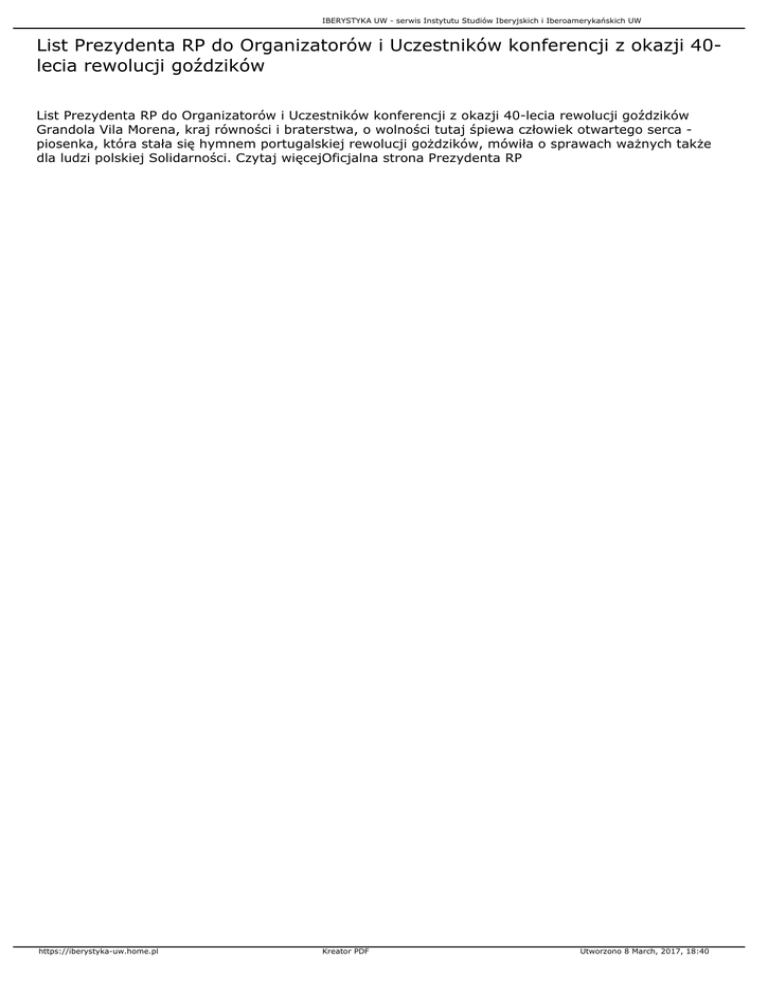 IBERYSTYKA UW - serwis Instytutu Studiów Iberyjskich i Iberoamerykańskich UW List Prezydenta RP do Organizatorów i Uczestników konferencji z okazji 40lecia rewolucji goździków List Prezydenta RP do Organizatorów i Uczestników konferencji z okazji 40-lecia rewolucji goździków Grandola Vila Morena, kraj równości i braterstwa, o wolności tutaj śpiewa człowiek otwartego serca piosenka, która stała się hymnem portugalskiej rewolucji gożdzików, mówiła o sprawach ważnych także dla ludzi polskiej Solidarności. Czytaj więcejOficjalna strona Prezydenta RP https://iberystyka-uw.home.pl Kreator PDF Utworzono 8 March, 2017, 18:40