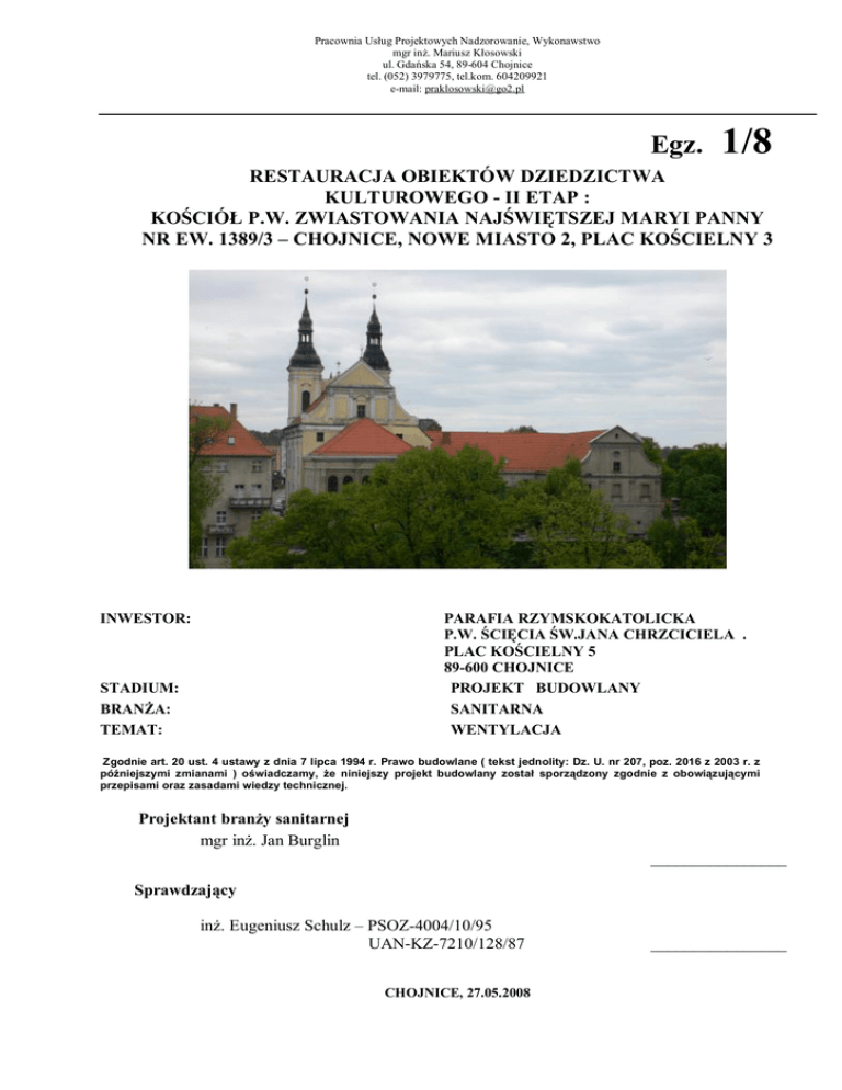 Pracownia Usług Projektowych Nadzorowanie, Wykonawstwo mgr inż. Mariusz Kłosowski ul. Gdańska 54, 89-604 Chojnice tel. (052) 3979775, tel.kom. 604209921 e-mail: [email protected] Egz. 1/8 RESTAURACJA OBIEKTÓW DZIEDZICTWA KULTUROWEGO - II ETAP : KOŚCIÓŁ P.W. ZWIASTOWANIA NAJŚWIĘTSZEJ MARYI PANNY NR EW. 1389/3 – CHOJNICE, NOWE MIASTO 2, PLAC KOŚCIELNY 3 INWESTOR: PARAFIA RZYMSKOKATOLICKA P.W. ŚCIĘCIA ŚW.JANA CHRZCICIELA . PLAC KOŚCIELNY 5 89-600 CHOJNICE PROJEKT BUDOWLANY SANITARNA WENTYLACJA STADIUM: BRANŻA: TEMAT: Zgodnie art. 20 ust. 4 ustawy z dnia 7 lipca 1994 r. Prawo budowlane ( tekst jednolity: Dz. U. nr 207, poz. 2016 z 2003 r. z późniejszymi zmianami ) oświadczamy, że niniejszy projekt budowlany został sporządzony zgodnie z obowiązującymi przepisami oraz zasadami wiedzy technicznej. Projektant branży sanitarnej mgr inż. Jan Burglin ________________ Sprawdzający inż. Eugeniusz Schulz – PSOZ-4004/10/95 UAN-KZ-7210/128/87 CHOJNICE, 27.05.2008 ________________ Pracownia Usług Projektowych Nadzorowanie, Wykonawstwo mgr inż. Mariusz Kłosowski ul. Gdańska 54, 89-604 Chojnice tel. (052) 3979775, tel.kom. 604209921 e-mail: [email protected] A. Spis treści A. Opis techniczny str. 3 B. Część rysunkowa: 1. Rzut podziemia – wentylacja mechaniczna skala 1:100 2. Rzut galerii – wentylacja mechaniczna skala 1:100 3. Schemat wentylacji mechanicznej układ N1-W1 4. Przekrój galerii – wentylacja mechaniczna skala 1:100 Pracownia Usług Projektowych Nadzorowanie, Wykonawstwo mgr inż. Mariusz Kłosowski ul. Gdańska 54, 89-604 Chojnice tel. (052) 3979775, tel.kom. 604209921 e-mail: [email protected] A. Opis techniczny do projektu technicznego restauracji obiektów dziedzictwa kulturowego- II etap : Kościół P.W.Zwiastowania Najświętszej Maryi Panny w Chojnicach na działce o nr geod. 1389/3 1. Podstawa opracowania 1.1. Projekt architektoniczno-budowlany budynku 1.2.Obowiązujące normy i zarządzenia 1.3.Uzgodnienia międzybranżowe 2. Zakres opracowania Przedmiotem opracowania jest wentylacja mechaniczna dla restauracji obiektów dziedzictwa kulturowego- II etap : Kościół P.W.Zwiastowania Najświętszej Maryi Panny w Chojnicach na działce o nr geod. 1389/3. 3. Opis przyjętych rozwiązań Projektuje się układ wentylacji mechanicznej nawiewno-wywiewnej i układy wywiewne dla pomieszczeń zlokalizowanych w Kościele P.W. Zwiastowania Najświętszej Maryi Panny w Chojnicach. Układ nawiewno-wywiewny N1-W1 zaprojektowano dla sali spotkań i ekspozycji 0.2 zlokalizowanej w podziemiu, dla pomieszczeń higieniczno-sanitarnych – układ wywiewny W3. Dla pomieszczenia galerii na poddaszu projektuje się układ wywiewny W 2. Dla pomieszczenia 0.2 przyjęto centralę grzewczą N1 z nagrzewnicą elektryczną i tłumikiem szumu : CV-P1/HED. Centrala jest zblokowana z wentylatorem wywiewnym W1 : CV-P1/DV. Centrala grzewcza dla układu N 1 i wentylator kanałowy w układzie W1 zlokalizowane są w pomieszczeniu 02, wykonane są w wersji podwieszanej i zlokalizowane pod stropem pomieszczenia. Powietrze nawiewane uzdatniane jest na filtrze klasy EU-4 i podgrzewane przez nagrzewnicę kanałową elektryczną. Adaptuje się istniejący kanał nawiewny doprowadzający powietrze wentylacyjne z czerpni ściennej. W czerpni powietrza zastosować siatkę ze stali nierdzewnej o drobnych oczkach. W pomieszczeniu 02 panuje nadciśnienie powietrza nawiewanego ze względu na przewidywany montaż kominka. Dodatkowo projektuje się jako zabezpieczenie przed możliwością niekontrolowanego wypływu dymu z kominka przy wystąpieniu niekorzystnych czynników atmosferycznych lub awarii urządzeń detektor tlenku węgla umieszczony na ścianie w odległości od 2-8m od kominka (wg zaleceń producenta). W pomieszczeniach higieniczno- sanitarnych w podziemiu zastosowano wentylator wywiewny kanałowy AXC 125B uruchamiany czujnikiem ruchu lub wraz z włączeniem oświetlenia. W pomieszczeniu 3.2 – galerii zastosowano układ wentylacyjny wywiewny W 2 z wentylatorem kanałowym z tłumikiem szumu CV-P1/DV. Przewiduje się nawiew powietrza do pomieszczeń sanitarnych grawitacyjny za pomocą kratek nawiewnych umieszczonych u dołu drzwi o pow.220cm2 netto. Uruchamianie układów N1-W1 i W2 za pomocą wyłącznika, układu W3 - za pomocą czujnika ruchu. Dla klatki schodowej zaprojektowano ze względów p.poż. agregat nadciśnieniowy umożliwiający ewakuację w razie pożaru, uruchamiany czujnikiem dymu oraz ręcznie dwoma wyłącznikami- na dole i górze przy klatce schodowej. Wyłączniki powinny być odpowiednio oznakowane. Trasy prowadzenia przewodów wentylacyjnych przedstawiono w części graficznej, sposoby sterowania w dalszej części opracowania. 4. Obliczenie sieci przewodów wentylacyjnych Dla uzyskania rozdziału powietrza w sieci przewodów zgodnego z założeniami, konieczne jest wyrównanie strat ciśnienia w węzłach. Uzyskano to stosując kratki wentylacyjne z przepustnicami. W celu uzyskania założonych przepływów i prędkości powietrza należy po wstępnym ustawieniu przepustnic sprawdzić prędkość i wydatek powietrza za pomocą mierników do powietrza wentylacyjnego. Obliczenie ilości powietrza wentylacyjnego dokonano po uwzględnieniu wymaganej minimalnej ilości powietrza, krotności wymian, strat i zysków ciepła. W pomieszczeniu 02 powinno występować nadciśnienie powietrza wentylacyjnego nawiewanego. Pracownia Usług Projektowych Nadzorowanie, Wykonawstwo mgr inż. Mariusz Kłosowski ul. Gdańska 54, 89-604 Chojnice tel. (052) 3979775, tel.kom. 604209921 e-mail: [email protected] 5. Kanały wentylacyjne oraz ich montaż Przewody wentylacyjne nawiewne i wywiewne zaprojektowano jako stalowe ocynkowane prostokątne. Zalecana odległość podparcia przewodów około 1m. W miejscach podparć pod kanały ułożyć podkładki z gumy mikroporowatej o grubości 30-60mm. Należy wykonywać okresowe czyszczenia kanałów wentylacyjnych oraz wymieniać filtr