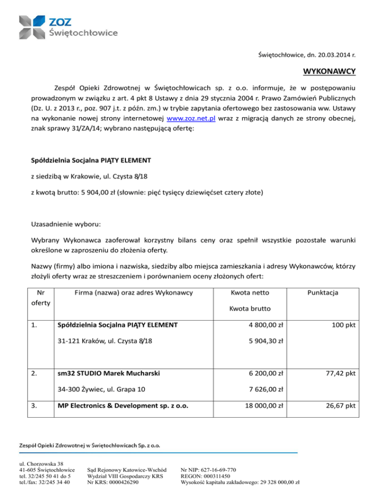Świętochłowice, dn. 20.03.2014 r. WYKONAWCY Zespół Opieki Zdrowotnej w Świętochłowicach sp. z o.o. informuje, że w postępowaniu prowadzonym w związku z art. 4 pkt 8 Ustawy z dnia 29 stycznia 2004 r. Prawo Zamówień Publicznych (Dz. U. z 2013 r., poz. 907 j.t. z późn. zm.) w trybie zapytania ofertowego bez zastosowania ww. Ustawy na wykonanie nowej strony internetowej www.zoz.net.pl wraz z migracją danych ze strony obecnej, znak sprawy 31/ZA/14; wybrano następującą ofertę: Spółdzielnia Socjalna PIĄTY ELEMENT z siedzibą w Krakowie, ul. Czysta 8/18 z kwotą brutto: 5 904,00 zł (słownie: pięć tysięcy dziewięćset cztery złote) Uzasadnienie wyboru: Wybrany Wykonawca zaoferował korzystny bilans ceny oraz spełnił wszystkie pozostałe warunki określone w zaproszeniu do złożenia oferty. Nazwy (firmy) albo imiona i nazwiska, siedziby albo miejsca zamieszkania i adresy Wykonawców, którzy złożyli oferty wraz ze streszczeniem i porównaniem oceny złożonych ofert: Nr oferty 1. 2. 3. Firma (nazwa) oraz adres Wykonawcy Kwota netto Punktacja Kwota brutto Spółdzielnia Socjalna PIĄTY ELEMENT 4 800,00 zł 31-121 Kraków, ul. Czysta 8/18 5 904,30 zł sm32 STUDIO Marek Mucharski 6 200,00 zł 34-300 Żywiec, ul. Grapa 10 7 626,00 zł MP Electronics & Development sp. z o.o. ul. Chorzowska 38 41-605 Świętochłowice tel. 32/245 50 41 do 5 tel./fax: 32/245 34 40 Sąd Rejonowy Katowice-Wschód Wydział VIII Gospodarczy KRS Nr KRS: 0000426290 18 000,00 zł Nr NIP: 627-16-69-770 REGON: 000311450 Wysokość kapitału zakładowego: 29 328 000,00 zł 100 pkt 77,42 pkt 26,67 pkt 4. 5. 6. 7. 8. 9. 10. 00-195 Warszawa, ul. Słomińskiego 19/80 22 140,00 zł Lemisoft Michał Kufel 19 900,00 zł 24-313 Wilków, Zarudki 19 24 477,00 zł dotthe.it sp. z o.o. 15 375,00 zł 90-233 Łódź, ul. Rewolucji 1905 r. 82 18 911,25 zł PlayNet Solutions Radosław Jankowski 8 000,00 zł 75-528 Koszalin, ul. Wieniawskiego 9/9 9 840,00 zł Laura Dzieniewicz 79 000,00 zł 03-051 Warszawa, ul. Chlubna 60 97 170,00 zł 1.62 Przemysław Garczarek 14 256,00 zł 64-500 Szamotuły, ul. Gąsowska 5c/35 17 534,88 zł NET PC sp. z o.o. 27 000,00 zł 80-874 Gdańsk, ul. Na Stoku 48 33 210,00 zł BACOM Bartosz Wesołowski 20 020,00 zł 41-200 Sosnowiec, ul. Kołłątaja 6A 26 000,00 zł 24,12 pkt 31,22 pkt 60 pkt 6,08 pkt 33,67 pkt 17,78 pkt 22,71 pkt Oferty złożone przez Wykonawców zostały ocenione przez Zamawiającego w oparciu o kryteria wskazane w zaproszeniu do złożenia oferty. ul. Chorzowska 38 41-605 Świętochłowice tel. 32/245 50 41 do 5 tel./fax: 32/245 34 40 Sąd Rejonowy Katowice-Wschód Wydział VIII Gospodarczy KRS Nr KRS: 0000426290 Nr NIP: 627-16-69-770 REGON: 000311450 Wysokość kapitału zakładowego: 29 328 000,00 zł