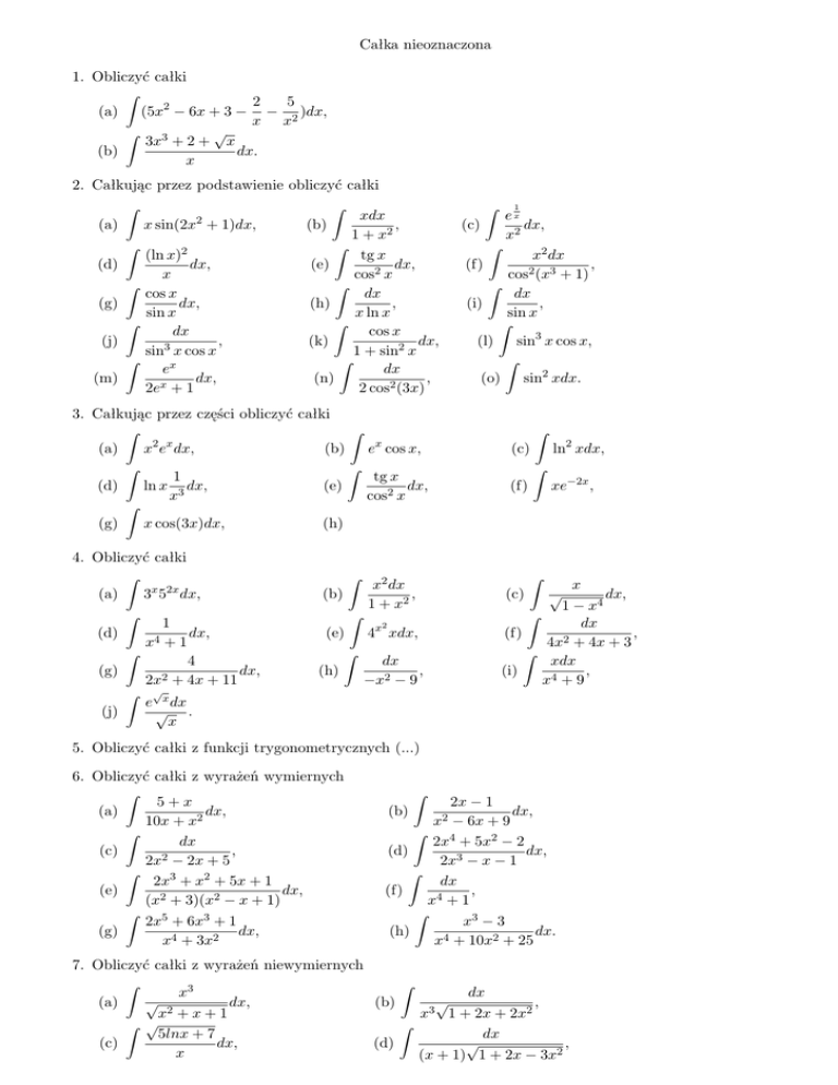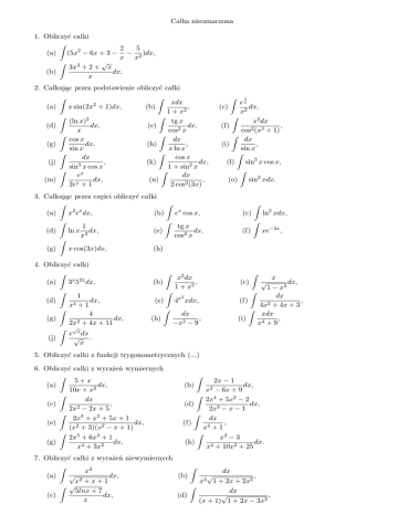 Całka nieoznaczona 1. Obliczyć całki Z 2 5 (a) (5x2 − 6x + 3 − − 2 )dx, x x √ Z 3 3x + 2 + x (b) dx. x 2. Całkując przez podstawienie obliczyć całki Z Z xdx 2 (a) x sin(2x + 1)dx, (b) , 1 + x2 Z Z tg x (ln x)2 dx, (e) dx, (d) x cos2 x Z Z cos x dx (g) dx, (h) , sin x x ln x Z Z dx cos x (j) , (k) dx, sin3 x cos x 1 + sin2 x Z Z ex dx (m) dx, (n) , x 2e + 1 2 cos2 (3x) 3. Całkując przez części obliczyć całki Z Z (a) x2 ex dx, (b) ex cos x, Z Z tg x 1 (e) dx, (d) ln x 3 dx, x cos2 x Z (g) x cos(3x)dx, (h) 4. Obliczyć całki Z (a) 3x 52x dx, Z 1 dx, (d) 4 x +1 Z 4 (g) dx, 2x2 + 4x + 11 Z √x e dx √ . (j) x Z (b) Z Z 1 ex (c) dx, x2 Z x2 dx (f) , cos2 (x3 + 1) Z dx (i) , sin x Z (l) sin3 x cos x, Z (o) sin2 xdx. Z ln2 xdx, Z xe−2x , (c) (f) x2 dx , 1 + x2 Z x dx, 1 − x4 Z dx (f) , 2 4x + 4x + 3 Z xdx (i) , x4 + 9 (c) 2 (e) 4x xdx, Z dx (h) , −x2 − 9 √ 5. Obliczyć całki z funkcji trygonometrycznych (...) 6. Obliczyć całki z wyrażeń wymiernych Z 5+x dx, (a) 10x + x2 Z dx (c) , 2x2 − 2x + 5 Z 2x3 + x2 + 5x + 1 (e) dx, (x2 + 3)(x2 − x + 1) Z 2x5 + 6x3 + 1 (g) dx, x4 + 3x2 2x − 1 dx, − 6x + 9 Z 2x4 + 5x2 − 2 (d) dx, 2x3 − x − 1 Z dx (f) , 4 x +1 Z x3 − 3 (h) dx. x4 + 10x2 + 25 Z (b) x2 7. Obliczyć całki z wyrażeń niewymiernych Z Z x3 dx √ √ (a) dx, (b) , 2 3 x +x+1 x 1 + 2x + 2x2 Z √ Z 5lnx + 7 dx √ (c) dx, (d) , x (x + 1) 1 + 2x − 3x2 Z √ (e) q x2 + 2x + 4 dx, (x − 1)2 √ x− 4x √ dx, 3x + 4 x Z (f) 1+x 1−x 1− Z √ (g) 3 Z (h) q 5 +x dx, 1+x 1−x dx p . 3 (x + 1)2 (x − 1)7