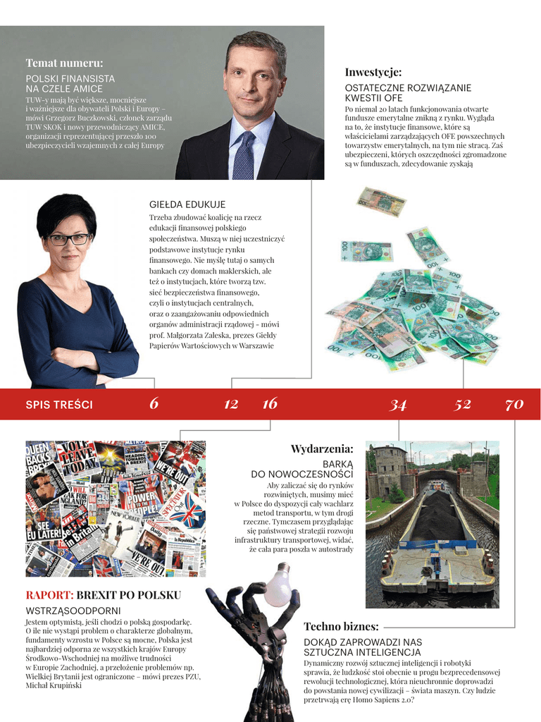 Temat numeru: Inwestycje: POLSKI FINANSISTA NA CZELE AMICE OSTATECZNE ROZWIĄZANIE KWESTII OFE TUW-y mają być większe, mocniejsze i ważniejsze dla obywateli Polski i Europy – mówi Grzegorz Buczkowski, członek zarządu TUW SKOK i nowy przewodniczący AMICE, organizacji reprezentującej przeszło 100 ubezpieczycieli wzajemnych z całej Europy Po niemal 20 latach funkcjonowania otwarte fundusze emerytalne znikną z rynku. Wygląda na to, że instytucje finansowe, które są właścicielami zarządzających OFE powszechnych towarzystw emerytalnych, na tym nie stracą. Zaś ubezpieczeni, których oszczędności zgromadzone są w funduszach, zdecydowanie zyskają GIEŁDA EDUKUJE Trzeba zbudować koalicję na rzecz edukacji finansowej polskiego społeczeństwa. Muszą w niej uczestniczyć podstawowe instytucje rynku finansowego. Nie myślę tutaj o samych bankach czy domach maklerskich, ale też o instytucjach, które tworzą tzw. sieć bezpieczeństwa finansowego, czyli o instytucjach centralnych, oraz o zaangażowaniu odpowiednich organów administracji rządowej - mówi prof. Małgorzata Zaleska, prezes Giełdy Papierów Wartościowych w Warszawie SPIS TREŚCI eprasa.pl 6 12 16 34 52 Wydarzenia: BARKĄ DO NOWOCZESNOŚCI Aby zaliczać się do rynków rozwiniętych, musimy mieć w Polsce do dyspozycji cały wachlarz metod transportu, w tym drogi rzeczne. Tymczasem przyglądając się państwowej strategii rozwoju infrastruktury transportowej, widać, że cała para poszła w autostrady RAPORT: BREXIT PO POLSKU WSTRZĄSOODPORNI Jestem optymistą, jeśli chodzi o polską gospodarkę. O ile nie wystąpi problem o charakterze globalnym, fundamenty wzrostu w Polsce są mocne, Polska jest najbardziej odporna ze wszystkich krajów Europy Środkowo-Wschodniej na możliwe trudności w Europie Zachodniej, a przełożenie problemów np. Wielkiej Brytanii jest ograniczone – mówi prezes PZU, Michał Krupiński Techno biznes: DOKĄD ZAPROWADZI NAS SZTUCZNA INTELIGENCJA Dynamiczny rozwój sztucznej inteligencji i robotyki sprawia, że ludzkość stoi obecnie u progu bezprecedensowej rewolucji technologicznej, która nieuchronnie doprowadzi do powstania nowej cywilizacji – świata maszyn. Czy ludzie przetrwają erę Homo Sapiens 2.0? 70 NAJSTARSZY MAGAZYN EKONOMICZNY W POLSCE Ranking „Gazety Bankowej”: LISTA 100 NAJWIĘKSZYCH INSTYTUCJI FINANSOWYCH Pomimo słabszych od oczekiwań danych finansowych, przejawiających się w mniejszych przychodach oraz zyskach, pomimo zawirowań na rynku walut polski system finansowy nie stracił na stabilności Miasta: OFENSYWA NARODOWEGO DEWELOPERA Polski Holding Nieruchomości nie zostanie sprywatyzowany. Firma ma konkurować z najlepszymi komercyjnymi firmami i umocnić swoją pozycję rynkową. Wartość planowanych inwestycji sięga blisko 4,5 mld zł Edytorial | 4 Temat numeru Giełda edukuje | 6 TUW-y rosną w siłę | 12 Raport: Brexit – angielskie wyjście Wstrząsoodporni | 18 Londyn? Nie ma takiego miasta | 22 Brexit per saldo | 25 Bilet w jedną stronę | 28 Felieton Bankructwo pewnej doktryny | 30 Nie zmawiaj się w przetargach | 32 Europejskie kasyno | 33 Wydarzenia Barką do nowoczesności | 34 Eksport też trzeba udomowić | 38 Wszystkie chwyty nadal dozwolone | 42 Monopol z automatu | 44 Wojsko bardzo technologiczne | 48 Inwestycje eprasa.pl Ostateczne rozwiązanie kwestii OFE | 52 Kapitał zaufania | 55 Techno biznes 77 96 104 Zawód: youtuber | 58 Wiele metod, jeden cel | 61 Sukces zaprogramowany | 62 Wyścig z czasem | 65 Schyłek potęgi | 66 Scenariusz Homo Sapiens 2.0 | 70 Felieton Miłosierdzie, być dla… | 74 Metafizyczna pauza, hedonistyczny luz | 75 Płomień osobistych motywacji | 76 RANKING 100 największych instytucji finansowych Ciężki rok za nami, rok wyzwań przed nami | 77 Miasta Ofensywa narodowego dewelopera | 96 Banki się usztywniły | 100 Szklane drogi | 102 Pasje Sztuka życia: JĘZYK OBRAZKOWY Dzięki internetowi i mediom zaczynam postrzegać świat poprzez wspólny język obrazkowy. Trzeba umiejętnie zestawiać te symbole, by opowiedzieć coś interesującego – stwierdza Paweł Kuczyński, grafik i ilustrator prasowy Język obrazkowy | 104 Motoryzacja: Gepard w mieście | 106 Podróże: Plaża na skraju kraju | 110 Folder: Kultura | 114 Historia gospodarcza Iskrzy na placu Zbawiciela | 116 Kronika Najlepsi wśród bankierów | 119 Rada programowa: Post-referendalny paraliż | 134 Marża | 138
