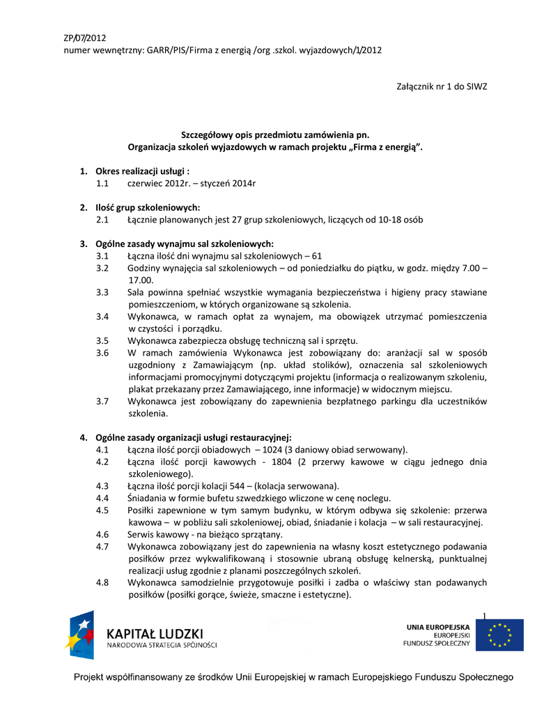 ZP/07/2012 numer wewnętrzny: GARR/PIS/Firma z energią /org .szkol. wyjazdowych/1/2012 Załącznik nr 1 do SIWZ Szczegółowy opis przedmiotu zamówienia pn. Organizacja szkoleń wyjazdowych w ramach projektu „Firma z energią”. 1. Okres realizacji usługi : 1.1 czerwiec 2012r. – styczeń 2014r 2. Ilość grup szkoleniowych: 2.1 Łącznie planowanych jest 27 grup szkoleniowych, liczących od 10-18 osób 3. Ogólne zasady wynajmu sal szkoleniowych: 3.1 Łączna ilość dni wynajmu sal szkoleniowych – 61 3.2 Godziny wynajęcia sal szkoleniowych – od poniedziałku do piątku, w godz. między 7.00 – 17.00. 3.3 Sala powinna spełniać wszystkie wymagania bezpieczeństwa i higieny pracy stawiane pomieszczeniom, w których organizowane są szkolenia. 3.4 Wykonawca, w ramach opłat za wynajem, ma obowiązek utrzymać pomieszczenia w czystości i porządku. 3.5 Wykonawca zabezpiecza obsługę techniczną sal i sprzętu. 3.6 W ramach zamówienia Wykonawca jest zobowiązany do: aranżacji sal w sposób uzgodniony z Zamawiającym (np. układ stolików), oznaczenia sal szkoleniowych informacjami promocyjnymi dotyczącymi projektu (informacja o realizowanym szkoleniu, plakat przekazany przez Zamawiającego, inne informacje) w widocznym miejscu. 3.7 Wykonawca jest zobowiązany do zapewnienia bezpłatnego parkingu dla uczestników szkolenia. 4. Ogólne zasady organizacji usługi restauracyjnej: 4.1 Łączna ilość porcji obiadowych – 1024 (3 daniowy obiad serwowany). 4.2 Łączna ilość porcji kawowych - 1804 (2 przerwy kawowe w ciągu jednego dnia szkoleniowego). 4.3 Łączna ilość porcji kolacji 544 – (kolacja serwowana). 4.4 Śniadania w formie bufetu szwedzkiego wliczone w cenę noclegu. 4.5 Posiłki zapewnione w tym samym budynku, w którym odbywa się szkolenie: przerwa kawowa – w pobliżu sali szkoleniowej, obiad, śniadanie i kolacja – w sali restauracyjnej. 4.6 Serwis kawowy - na bieżąco sprzątany. 4.7 Wykonawca zobowiązany jest do zapewnienia na własny koszt estetycznego podawania posiłków przez wykwalifikowaną i stosownie ubraną obsługę kelnerską, punktualnej realizacji usług zgodnie z planami poszczególnych szkoleń. 4.8 Wykonawca samodzielnie przygotowuje posiłki i zadba o właściwy stan podawanych posiłków (posiłki gorące, świeże, smaczne i estetyczne). 1 ZP/07/2012 numer wewnętrzny: GARR/PIS/Firma z energią /org .szkol. wyjazdowych/1/2012 Załącznik nr 1 do SIWZ 4.9 4.10 4.11 4.12 W przypadku awarii lub innych nieprzewidzianych zdarzeń Wykonawca jest zobowiązany zapewnić posiłki o nie gorszej jakości na swój koszt z innych źródeł. Zamawiający określi w pisemnym zleceniu na 5 dni przed szkoleniem: termin szkolenia, dokładną liczbę uczestników oraz godziny przerw kawowych i obiadowej. Ilość i wielkość zamawianych usług wskazana w SIWZ stanowi maksymalny ich zakres i wielkość zamówienia. Zamawiający zastrzega sobie możliwość zamówienia mniejszej ilości usług, niż maksymalna wskazana w SIWZ, a w takiej sytuacji Wykonawca nie będzie wnosił żadnych roszczeń z tego tytułu, w szczególności o zapłatę za ilość stanowiącą różnicę między maksymalną ilością usług wskazanych w SIWZ, a ilością rzeczywiście zrealizowaną na podstawie poszczególnego zlecenia Zamawiającego. Zamawiający zastrzega sobie prawo do niezrealizowania 50% przedmiotu zamówienia. Rozliczenie nastąpi zgodnie z rzeczywistym wykonaniem przedmiotu umowy, po dokonaniu protokolarnego odbioru przedmiotu umowy. Ceny zaoferowane przez Wykonawcę w ofercie nie ulegną podwyższeniu przez cały okres obowiązywania umowy. 4.13 Wymagania dotyczące przerw kawowych: 4.13.1 W ramach przerwy kawowej Wykonawca zapewni: kawę, herbatę, śmietankę do kawy, cukier, soki owocowe (3 rodzaje - podane w dzbankach szklanych lub dyspenserach), wodę mineralną niegazowaną (podana w butelkach typu PET o objętości 0,3-0,33L.), ciastka kruche (3 rodzaje: maślane, herbatniki itp.); 4.13.2 Zamawiający nie dopuszcza stosowania wód smakowych; 4.13.3 Naczynia do konsumpcji kawy i herbaty powinny być podane w zastawie ceramicznej lub porcelanowej, dostarczone w ilości o 20% większej niż przewidywana liczba uczestników. Zamawiający nie dopuszcza użycia naczyń jednorazowych do konsumpcji napojów gorących. 4.13.4 Zamawiający dopuszcza użycie naczyń jednorazowych do konsumpcji napojów zimnych. Wykonawca dostarczy o 20% więcej naczyń niż przewidywana liczba uczestników. 4.14 Wymagania dotyczące przerwy obiadowej: 4.14.1 Obiad serwowany 3 daniowy: zupa, drugie danie mięsne lub wegetariańskie (na życzenie uczestników szkoleń), deser (puchar lodowy lub ciasto sezonowe, itp.), napoje (woda mineralna, soki owocowe w 3 rodzajach, kawa z ekspresu ciśnieniowego, herbata), 4.14.2 Zamawiający nie dopuszcza stosowania wód smakowych. 4.14.3 Obiad powinien być podany w zastawie ceramicznej lub porcelanowej. Zamawiający nie dopuszcza użycia naczyń jednorazowych do konsumpcji potraw gorących. 4.15 Wymagania dotyczące śniadania 2 ZP/07/2012 numer wewnętrzny: GARR/PIS/Firma z energią /org .szkol. wyjazdowych/1/2012 Załącznik nr 1 do SIWZ 4.15.1 Śniadanie w formie stołu szwedzkiego: urozmaicony bufet: sery (minimum 3 rodzaje), wędliny wysokiej jakości (minimum3 rodzaje), jajecznica, parówki, pieczywo mieszane, masło, dżemy, jogurty owocowe (minimum 3 rodzaje), kawa, herbata, soki owocowe (minimum 3 rodzaje), woda mineralna niegazowana w butelkach typu PET o objętości 0,3-0,33L. 4.16 Wymagania dotyczące kolacji 4.16.1 Kolacja serwowana: ciepłe danie, przystawka, napoje (kawa, herbata, soki owocowe (minimum 3 rodzaje), woda mineralna niegazowana w butelkach typu PET o objętości 0,3-0,33L). 5. Zasady organizacji usługi noclegowej 5.1.1 5.1.2 5.1.3 5.1.4 5.1.5 Łączna ilość osobo noclegów: 544, w tym 34 osobo noclegi w pokojach jednoosobowych, pozostałe w pokojach dwuosobowych (z zastrzeżeniem pkt. 5.1.2) Przy każdej g