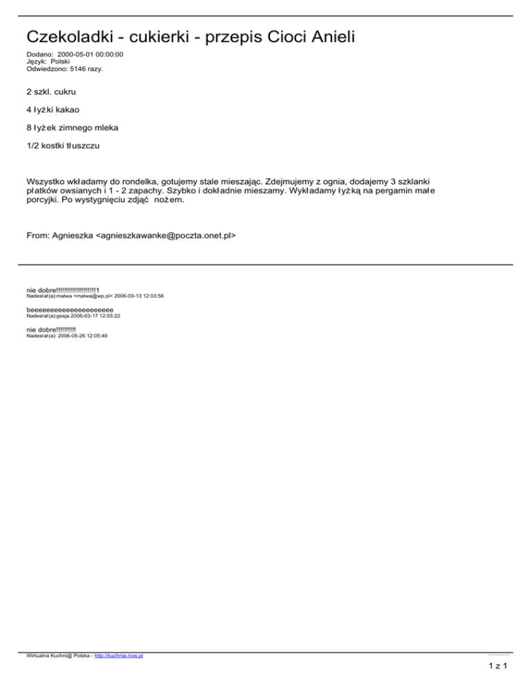 Czekoladki - cukierki - przepis Cioci Anieli Dodano: 2000-05-01 00:00:00 Język: Polski Odwiedzono: 5146 razy. 2 szkl. cukru 4 łyżki kakao 8 łyżek zimnego mleka 1/2 kostki tłuszczu Wszystko wkładamy do rondelka, gotujemy stale mieszając. Zdejmujemy z ognia, dodajemy 3 szklanki płatków owsianych i 1 - 2 zapachy. Szybko i dokładnie mieszamy. Wykładamy łyżką na pergamin małe porcyjki. Po wystygnięciu zdjąć nożem. From: Agnieszka <[email protected]> nie dobre!!!!!!!!!!!!!!!!!!!!1 Nadesłał(a):malwa <[email protected]> 2006-03-13 12:03:56 beeeeeeeeeeeeeeeeeeeee Nadesłał(a):gosja 2006-03-17 12:03:22 nie dobre!!!!!!!!!! Nadesłał(a): 2006-05-26 12:05:49 Wirtualna Kuchni@ Polska - http://kuchnia.now.pl przepis nr 6541, plik wygenerowano 2017.03.08 19:40 1z1