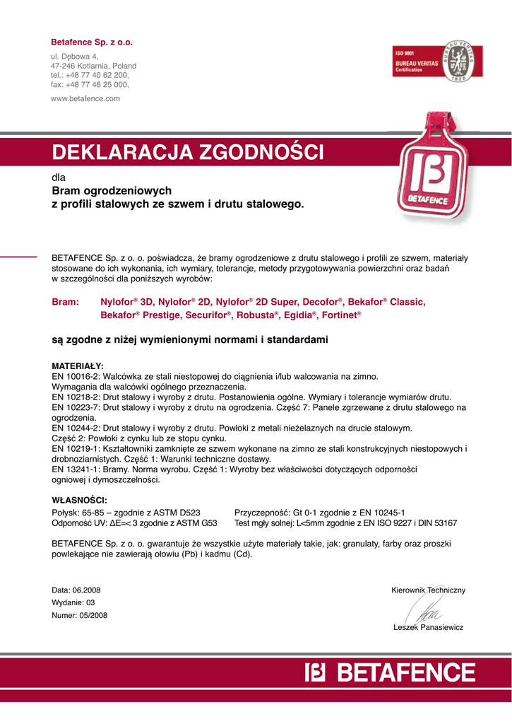Betafence Sp. z o.o. ul. Dębowa 4, 47-246 Kotlarnia, Poland tel.: +48 77 40 62 200, fax: +48 77 48 25 000, www.betafence.com DEKLARACJA ZGODNOŚCI dla Bram ogrodzeniowych z profili stalowych ze szwem i drutu stalowego. BETAFENCE Sp. z o. o. poświadcza, że bramy ogrodzeniowe z drutu stalowego i profili ze szwem, materiały stosowane do ich wykonania, ich wymiary, tolerancje, metody przygotowywania powierzchni oraz badań w szczególności dla poniższych wyrobów: Bram: Nylofor® 3D, Nylofor® 2D, Nylofor® 2D Super, Decofor®, Bekafor® Classic, Bekafor® Prestige, Securifor®, Robusta®, Egidia®, Fortinet® są zgodne z niżej wymienionymi normami i standardami MATERIAŁY: EN 10016-2: Walcówka ze stali niestopowej do ciągnienia i/lub walcowania na zimno. Wymagania dla walcówki ogólnego przeznaczenia. EN 10218-2: Drut stalowy i wyroby z drutu. Postanowienia ogólne. Wymiary i tolerancje wymiarów drutu. EN 10223-7: Drut stalowy i wyroby z drutu na ogrodzenia. Część 7: Panele zgrzewane z drutu stalowego na ogrodzenia. EN 10244-2: Drut stalowy i wyroby z drutu. Powłoki z metali nieżelaznych na drucie stalowym. Część 2: Powłoki z cynku lub ze stopu cynku. EN 10219-1: Kształtowniki zamknięte ze szwem wykonane na zimno ze stali konstrukcyjnych niestopowych i drobnoziarnistych. Część 1: Warunki techniczne dostawy. EN 13241-1: Bramy. Norma wyrobu. Część 1: Wyroby bez właściwości dotyczących odporności ogniowej i dymoszczelności. WŁASNOŚCI: Połysk: 65-85 – zgodnie z ASTM D523 Odporność UV: ΔE=< 3 zgodnie z ASTM G53 Przyczepność: Gt 0-1 zgodnie z EN 10245-1 Test mgły solnej: L<5mm zgodnie z EN ISO 9227 i DIN 53167 BETAFENCE Sp. z o. o. gwarantuje że wszystkie użyte materiały takie, jak: granulaty, farby oraz proszki powlekające nie zawierają ołowiu (Pb) i kadmu (Cd). Data: 06.2008 Wydanie: 03 Numer: 05/2008 Kierownik Techniczny Leszek Panasiewicz