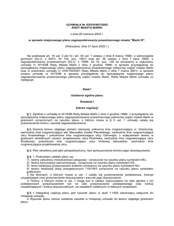 UCHWAŁA Nr XXXVI/407/2002 RADY MIASTA MARKI z dnia 26 czerwca 2002 r. w sprawie miejscowego planu zagospodarowania przestrzennego miasta "Marki III". (Warszawa, dnia 31 lipca 2002 r.) Na podstawie art. 18 ust. 2 pkt 5) i art. 40 ust. 1 ustawy z dnia 8 marca 1990r. o samorządzie gminnym (Dz.U. z 2001r. Nr 142, poz. 1591) oraz art. 26 ustawy z dnia 7 lipca 1994r. o zagospodarowaniu przestrzennym (Dz.U. z 1999r. Nr 15, poz. 139 ze zmianami) w wykonaniu uchwały nr III/15/98 Rady Miasta Marki z dnia 2 grudnia 1998r. w sprawie przystąpienia do sporządzania miejscowego planu zagospodarowania przestrzennego północnej części miasta Marki oraz w wykonaniu uchwały nr XXII/155/2001 Rady Miasta Marki z dnia 7 marca 2001r. w sprawie zmiany uchwały nr III/15/98 w sprawie przystąpienia do sporządzania miejscowego planu zagospodarowania przestrzennego północnej części miasta Marki, Rada Miasta Marki uchwala co następuje: Dział I Ustalenia ogólne planu Rozdział I Zakres regulacji § 1. Zgodnie z uchwałą nr III/15/98 Rady Miasta Marki z dnia 2 grudnia 1998r. o przystąpieniu do sporządzania miejscowego planu zagospodarowania przestrzennego północnej części miasta Marki w granicach oznaczonych na rysunku planu, o którym mowa w § 5 ust. 1 uchwały ustala się przeznaczenie terenu i sposób zagospodarowania. § 2. Granice terenu objętego planem stanowią: północna linia rozgraniczająca ul. Granicznej, wschodnia linia rozgraniczająca alei Marszałka Józefa Piłsudskiego, zachodnia linia rozgraniczająca ulicy Krasińskiego i południowa linia rozgraniczająca ulicy Odrowąża, z wyłączeniem terenu w granicach określonych ulicami: projektowana ulica Piotrówka, zachodnia linia rozgraniczająca ulicy Środkowej, południowa linia rozgraniczająca ulicy Królowej Marysieńki, zachodnia linia rozgraniczająca projektowanej ulicy. § 3. Plan określony jest jako perspektywiczny, bez sprecyzowania terminu jego obowiązywania. § 4. 1. Podmiotem ustaleń planu są: 1) tereny zabudowy mieszkaniowo-usługowej - oznaczone na rysunku planu symbolem MU, 2) tereny komunikacji samochodowej - oznaczone na rysunku planu symbolem KS, 3) teren lokalizacji przepompowni ścieków oznaczony na rysunku planu symbolem NU, 4) tereny lokalizacji stacji energetycznych 110/15kV oznaczone na rysunku planu symbolem graficznym. 2. Na terenach, o których mowa w ust. 1 ustala się przeznaczenie podstawowe, funkcje uzupełniające oraz przeznaczenie dopuszczalne i warunki jego dopuszczenia. 3. Tereny, o których mowa w ust. 1 mogą być w całości wykorzystane na cele zgodne z ich podstawowym przeznaczeniem lub na cele przeznaczenia podstawowego oraz funkcji uzupełniających i funkcji dopuszczalnych, na zasadach ustalonych w dalszych przepisach. § 5. 1. Integralną częścią planu jest rysunek planu w skali 1:1000 stanowiący załącznik do niniejszej uchwały. 2. Rysunek planu odnosi ustalenia zawarte w niniejszej uchwale do terenu objętego granicami planu. 3. Na rysunku planu, o którym mowa w ust. 1 określa się jako obowiązujące następujące oznaczenia graficzne: 1) granice terenu objętego planem, 2) linie rozgraniczające tereny o odmiennym sposobie użytkowania, 3) przeznaczenie terenów wewnątrz linii rozgraniczających, 4) lokalizacja terenów rezerwowanych dla kubaturowych urządzeń obsługi inżynieryjnej terenu (stacje trafo i przepompownia ścieków), 5) obowiązujące linie zabudowy, 6) strefy ochronne: - strefa pomników przyrody 15m, - strefa ochrony archeologicznej, - zasięg stref stanowisk archeologicznych podlegających ochronie, - strefa występowania utrudnionych warunków gruntowo - wodnych, 7) strefy uciążliwości układu komunikacyjnego, 4. Na rysunku planu, o którym mowa w ust. 1 określa się jako informacyjne oznaczenia graficzne: - geometryczny układ jezdni, - klasyfikacja funkcjonalna ulic. § 6. Warunki zabudowy i zagospodarowania terenu dla poszczególnych działek lub ich zespołów należy określać według zasad ustalonych w stosunku do obszarów wyznaczonych liniami rozgraniczającymi, o których mowa w Dziale II niniejszej uchwały z uwzględnieniem ustaleń dotyczących struktury funkcjonalno przestrzennej, układu drogowo ulicznego, zasad obsługi inżynieryjnej, ograniczeń zagospodarowania wynikających z zasad ochrony środowiska przyrodniczego, o których mowa w rozdziałach 2, 3, 4, 5, 6 i 7 niniejszej uchwały. § 7. Ilekroć w dalszych przepisach niniejszej uchwały jest mowa o: 1) planie - należy przez to rozumieć ustalenia planu, o których mowa w § 1 uchwały, o ile z treści przepisu nie wynika inaczej, 2) uchwale - należy przez to rozumieć niniejszą uchwałę Rady Miejskiej w Markach dotyczącą zagospodarowania obszaru północnej części miasta Marki, o ile z treści przepisu nie wynika inaczej, 3) przepisach szczególnych i odrębnych - należy przez to rozumieć przepisy ustaw wraz z aktami wykonawczymi, normy polskie oraz ograniczenia w dysponowaniu terenem, wynikające z prawomocnych decyzji administracyjnych, 4) rysunku planu - należy przez to rozumieć rysunek planu na mapie w skali 1:1000 stanowiący załącznik nr 1 do niniejszej uchwały, 5) przeznaczeniu podstawowym - należy przez to rozumieć takie przeznaczenie, które powinno przeważać na terenie danej nieruchomości, 6) przeznaczeniu uzupełniającym - należy przez to rozumieć rodzaje przeznaczenia inne niż podstawowe, które uzupełniają lub wzbogacają przeznaczenie podstawowe, 7) przeznaczeniu dopuszczalnym - należy przez to rozumieć przeznaczenie inne niż podstawowe lub uzupełniające, którego realizacja na danym terenie wynika z niezbędnego uzupełnienia infrastruktury przestrzennej lub technicznej, i która nie koliduje z funkcjami podstawowymi, 8) obszarze funkcjonalnym - należy przez to rozumieć teren o określonym rodzaju przeznaczenia wyznaczony na rysunku planu liniami rozgraniczającymi, 9) powierzchni biologicznie czynnej - należy prze