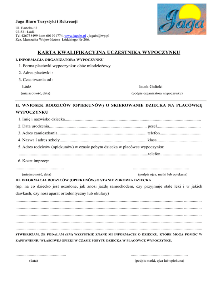 Jaga Biuro Turystyki i Rekreacji Ul. Bartoka 67 92-531 Łódź Tel 426738499 kom 601991774, www.jagabt.pl , [email protected] Zez. Marszałka Województwa Łódzkiego Nr 206. KARTA KWALIFIKACYJNA UCZESTNIKA WYPOCZYNKU I. INFORMACJA ORGANIZATORA WYPOCZYNKU 1. Forma placówki wypoczynku: obóz młodzieżowy 2. Adres placówki : 3. Czas trwania od : Łódź (miejscowość, data) Jacek Galicki (podpis organizatora wypoczynku) II. WNIOSEK RODZICÓW (OPIEKUNÓW) O SKIEROWANIE DZIECKA NA PLACÓWKĘ WYPOCZYNKU 1. Imię i nazwisko dziecka............................................................................................................................ 2. Data urodzenia......................................................................................... pesel........................................ 3. Adres zamieszkania................................................................................. telefon...................................... 4. Nazwa i adres szkoły................................................................................klasa......................................... 5. Adres rodziców (opiekunów) w czasie pobytu dziecka w placówce wypoczynku: ......................................................................................................................telefon...................................... 6. Koszt imprezy: ............................................ (miejscowość, data) ................................................... (podpis ojca, matki lub opiekuna) III. INFORMACJA RODZICÓW (OPIEKUNÓW) O STANIE ZDROWIA DZIECKA (np. na co dziecko jest uczulone, jak znosi jazdę samochodem, czy przyjmuje stale leki i w jakich dawkach, czy nosi aparat ortodontyczny lub okulary) ........................................................................................................................................................ ................ ........................................................................................................................................................ ................ ........................................................................................................................................................ ................ .......................................................................................................................................................................... .......................................................................................................................................................................... STWIERDZAM, ŻE PODAŁAM (EM) WSZYSTKIE ZNANE MI INFORMACJE O DZIECKU, KTÓRE MOGĄ POMÓC W ZAPEWNIENIU WŁAŚCIWEJ OPIEKI W CZASIE POBYTU DZIECKA W PLACÓWCE WYPOCZYNKU. .............................................. (data) .................................................... (podpis matki, ojca lub opiekuna) IV. INFORMACJA PIELĘGNIARKI O SZCZEPIENIACH lub przedstawienie książeczki zdrowia z aktualnym wpisem szczepień Szczepienia ochronne (podać rok): tężec ......................, błonica ......................, dur .........................., inne ........................... .......................................... .......................................................... (data) (podpis pielęgniarki) V. INFORMACJA O DZIECKU WYCHOWAWCY KLASY (w przypadku barku możliwości uzyskania opinii wychowawcy klasy – wypełnia rodzic lub opiekun) .......................................................................................................................................................................... .......................................................................................................................................................................... .......................................................................................................................................................................... ……………………………………………………………………………………………………………….. .......................................................................................................................................................................... .......................................................................................................................................................................... ……………………………………………………………………………………………………………… ....................................... ............................................................... (data) (podpis wychowawcy lub rodzica - opiekuna) VI. POTWIERRDZENIE POBYTU DZIECKA W PLACÓWCE WYPOCZYNKU Dziecko przebywało na ................................................................................................................................... (forma i adres placówki wypoczynku) od dnia ........................................ do dnia ............................................... 20 ...........r. ........................................ .......................................................................... (data) (czytelny podpis kierownika placówki wypoczynku) VII. INFORMACJA O STANIE ZDROWIA DZIECKA W CZASIE POBYTU W PLACÓWCE WYPOCZYNKU (dane o zachorowaniach, urazach, leczeniu itp.) ........................................................................................................................................................ ................ ........................................................................................................................................................ ................ ........................................................................................................................................................ ................ ............................................................................................