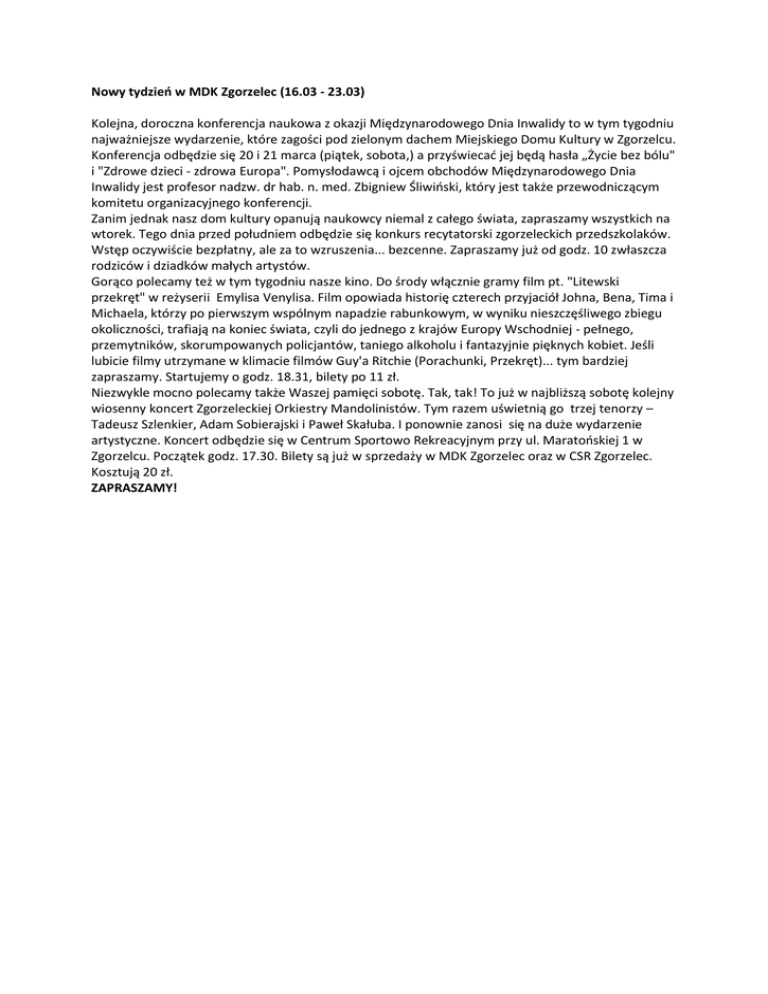 Nowy tydzień w MDK Zgorzelec (16.03 - 23.03) Kolejna, doroczna konferencja naukowa z okazji Międzynarodowego Dnia Inwalidy to w tym tygodniu najważniejsze wydarzenie, które zagości pod zielonym dachem Miejskiego Domu Kultury w Zgorzelcu. Konferencja odbędzie się 20 i 21 marca (piątek, sobota,) a przyświecać jej będą hasła „Życie bez bólu" i "Zdrowe dzieci - zdrowa Europa". Pomysłodawcą i ojcem obchodów Międzynarodowego Dnia Inwalidy jest profesor nadzw. dr hab. n. med. Zbigniew Śliwiński, który jest także przewodniczącym komitetu organizacyjnego konferencji. Zanim jednak nasz dom kultury opanują naukowcy niemal z całego świata, zapraszamy wszystkich na wtorek. Tego dnia przed południem odbędzie się konkurs recytatorski zgorzeleckich przedszkolaków. Wstęp oczywiście bezpłatny, ale za to wzruszenia... bezcenne. Zapraszamy już od godz. 10 zwłaszcza rodziców i dziadków małych artystów. Gorąco polecamy też w tym tygodniu nasze kino. Do środy włącznie gramy film pt. "Litewski przekręt" w reżyserii Emylisa Venylisa. Film opowiada historię czterech przyjaciół Johna, Bena, Tima i Michaela, którzy po pierwszym wspólnym napadzie rabunkowym, w wyniku nieszczęśliwego zbiegu okoliczności, trafiają na koniec świata, czyli do jednego z krajów Europy Wschodniej - pełnego, przemytników, skorumpowanych policjantów, taniego alkoholu i fantazyjnie pięknych kobiet. Jeśli lubicie filmy utrzymane w klimacie filmów Guy'a Ritchie (Porachunki, Przekręt)... tym bardziej zapraszamy. Startujemy o godz. 18.31, bilety po 11 zł. Niezwykle mocno polecamy także Waszej pamięci sobotę. Tak, tak! To już w najbliższą sobotę kolejny wiosenny koncert Zgorzeleckiej Orkiestry Mandolinistów. Tym razem uświetnią go trzej tenorzy – Tadeusz Szlenkier, Adam Sobierajski i Paweł Skałuba. I ponownie zanosi się na duże wydarzenie artystyczne. Koncert odbędzie się w Centrum Sportowo Rekreacyjnym przy ul. Maratońskiej 1 w Zgorzelcu. Początek godz. 17.30. Bilety są już w sprzedaży w MDK Zgorzelec oraz w CSR Zgorzelec. Kosztują 20 zł. ZAPRASZAMY!