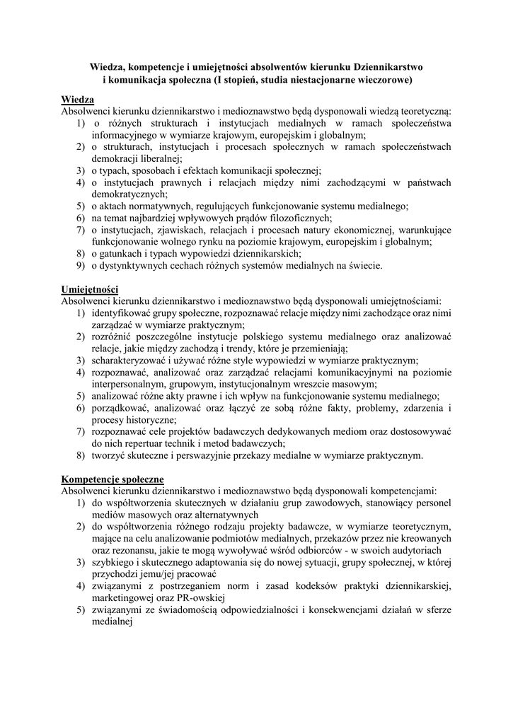 Wiedza, kompetencje i umiejętności absolwentów kierunku Dziennikarstwo i komunikacja społeczna (I stopień, studia niestacjonarne wieczorowe) Wiedza Absolwenci kierunku dziennikarstwo i medioznawstwo będą dysponowali wiedzą teoretyczną: 1) o różnych strukturach i instytucjach medialnych w ramach społeczeństwa informacyjnego w wymiarze krajowym, europejskim i globalnym; 2) o strukturach, instytucjach i procesach społecznych w ramach społeczeństwach demokracji liberalnej; 3) o typach, sposobach i efektach komunikacji społecznej; 4) o instytucjach prawnych i relacjach między nimi zachodzącymi w państwach demokratycznych; 5) o aktach normatywnych, regulujących funkcjonowanie systemu medialnego; 6) na temat najbardziej wpływowych prądów filozoficznych; 7) o instytucjach, zjawiskach, relacjach i procesach natury ekonomicznej, warunkujące funkcjonowanie wolnego rynku na poziomie krajowym, europejskim i globalnym; 8) o gatunkach i typach wypowiedzi dziennikarskich; 9) o dystynktywnych cechach różnych systemów medialnych na świecie. Umiejętności Absolwenci kierunku dziennikarstwo i medioznawstwo będą dysponowali umiejętnościami: 1) identyfikować grupy społeczne, rozpoznawać relacje między nimi zachodzące oraz nimi zarządzać w wymiarze praktycznym; 2) rozróżnić poszczególne instytucje polskiego systemu medialnego oraz analizować relacje, jakie między zachodzą i trendy, które je przemieniają; 3) scharakteryzować i używać różne style wypowiedzi w wymiarze praktycznym; 4) rozpoznawać, analizować oraz zarządzać relacjami komunikacyjnymi na poziomie interpersonalnym, grupowym, instytucjonalnym wreszcie masowym; 5) analizować różne akty prawne i ich wpływ na funkcjonowanie systemu medialnego; 6) porządkować, analizować oraz łączyć ze sobą różne fakty, problemy, zdarzenia i procesy historyczne; 7) rozpoznawać cele projektów badawczych dedykowanych mediom oraz dostosowywać do nich repertuar technik i metod badawczych; 8) tworzyć skuteczne i perswazyjnie przekazy medialne w wymiarze praktycznym. Kompetencje społeczne Absolwenci kierunku dziennikarstwo i medioznawstwo będą dysponowali kompetencjami: 1) do współtworzenia skutecznych w działaniu grup zawodowych, stanowiący personel mediów masowych oraz alternatywnych 2) do współtworzenia różnego rodzaju projekty badawcze, w wymiarze teoretycznym, mające na celu analizowanie podmiotów medialnych, przekazów przez nie kreowanych oraz rezonansu, jakie te mogą wywoływać wśród odbiorców - w swoich audytoriach 3) szybkiego i skutecznego adaptowania się do nowej sytuacji, grupy społecznej, w której przychodzi jemu/jej pracować 4) związanymi z postrzeganiem norm i zasad kodeksów praktyki dziennikarskiej, marketingowej oraz PR-owskiej 5) związanymi ze świadomością odpowiedzialności i konsekwencjami działań w sferze medialnej