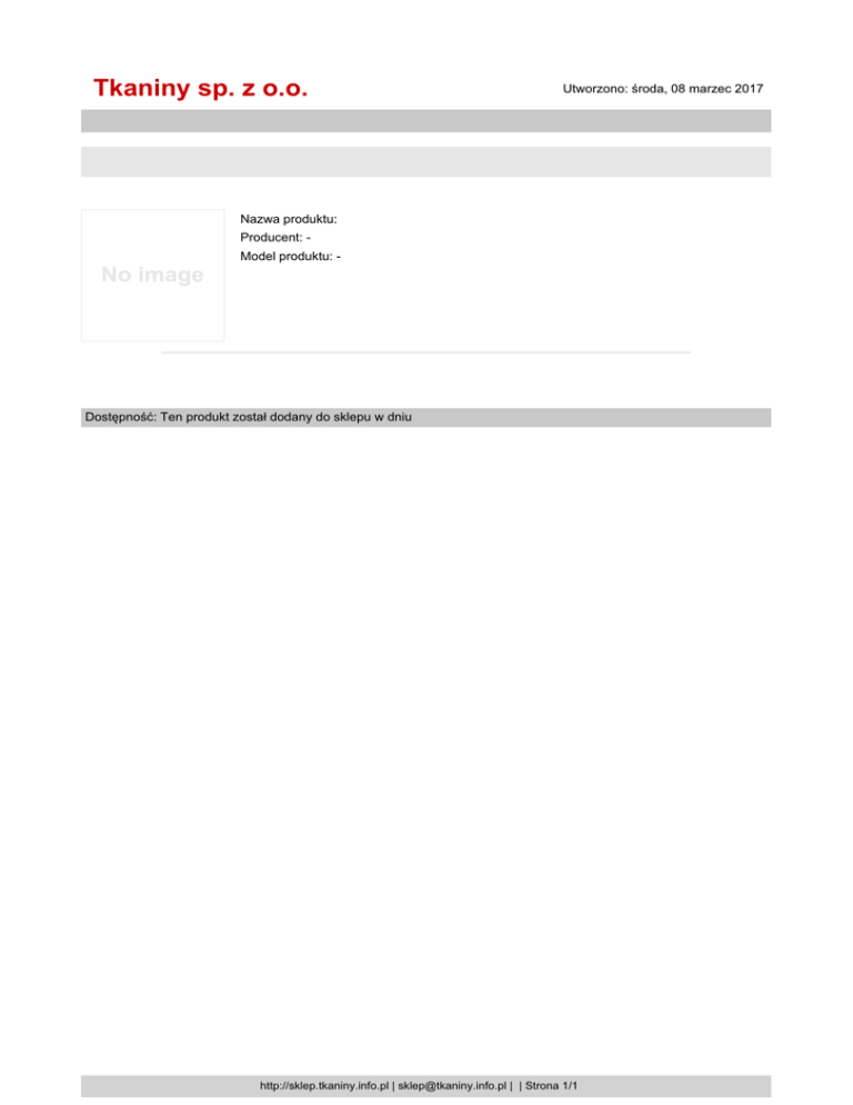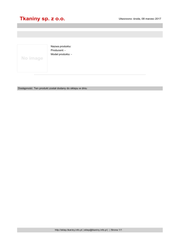 Tkaniny sp. z o.o. Utworzono: środa, 08 marzec 2017 Nazwa produktu: Producent: Model produktu: - No image Dostępność: Ten produkt został dodany do sklepu w dniu http://sklep.tkaniny.info.pl | [email protected] | | Strona 1/1