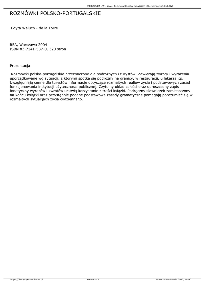 IBERYSTYKA UW - serwis Instytutu Studiów Iberyjskich i Iberoamerykańskich UW ROZMÓWKI POLSKO-PORTUGALSKIE Edyta Waluch - de la Torre REA, Warszawa 2004 ISBN 83-7141-537-0, 320 stron Prezentacja Rozmówki polsko-portugalskie przeznaczone dla podróżnych i turystów. Zawierają zwroty i wyrażenia uporządkowane wg sytuacji, z którymi spotka się podróżny na granicy, w restauracji, u lekarza itp. Uwzględniają cenne dla turystów informacje dotyczące rozmaitych realiów życia i podstawowych zasad funkcjonowania instytucji użyteczności publicznej. Czytelny układ całości oraz uproszczony zapis fonetyczny wyrazów i zwrotów ułatwią korzystanie z treści książki. Podręczny słowniczek zamieszczony na końcu książki oraz przystępnie podane podstawowe zasady gramatyczne pomagają porozumieć się w rozmaitych sytuacjach życia codziennego. https://iberystyka-uw.home.pl Kreator PDF Utworzono 8 March, 2017, 18:40