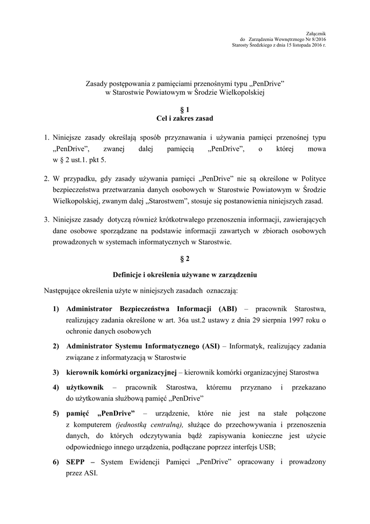 Załącznik do Zarządzenia Wewnętrznego Nr 8/2016 Starosty Średzkiego z dnia 15 listopada 2016 r. Zasady postępowania z pamięciami przenośnymi typu „PenDrive” w Starostwie Powiatowym w Środzie Wielkopolskiej §1 Cel i zakres zasad 1. Niniejsze zasady określają sposób przyznawania i używania pamięci przenośnej typu „PenDrive”, zwanej w § 2 ust.1. pkt 5. dalej pamięcią „PenDrive”, o której mowa 2. W przypadku, gdy zasady używania pamięci „PenDrive” nie są określone w Polityce bezpieczeństwa przetwarzania danych osobowych w Starostwie Powiatowym w Środzie Wielkopolskiej, zwanym dalej „Starostwem”, stosuje się postanowienia niniejszych zasad. 3. Niniejsze zasady dotyczą również krótkotrwałego przenoszenia informacji, zawierających dane osobowe sporządzane na podstawie informacji zawartych w zbiorach osobowych prowadzonych w systemach informatycznych w Starostwie. §2 Definicje i określenia używane w zarządzeniu Następujące określenia użyte w niniejszych zasadach oznaczają: 1) Administrator Bezpieczeństwa Informacji (ABI) – pracownik Starostwa, realizujący zadania określone w art. 36a ust.2 ustawy z dnia 29 sierpnia 1997 roku o ochronie danych osobowych 2) Administrator Systemu Informatycznego (ASI) – Informatyk, realizujący zadania związane z informatyzacją w Starostwie 3) kierownik komórki organizacyjnej – kierownik komórki organizacyjnej Starostwa 4) użytkownik – pracownik Starostwa, któremu przyznano i przekazano stałe połączone do użytkowania służbową pamięć „PenDrive” 5) pamięć „PenDrive” – urządzenie, które nie jest na z komputerem (jednostką centralną), służące do przechowywania i przenoszenia danych, do których odczytywania bądź zapisywania konieczne jest użycie odpowiedniego innego urządzenia, podłączane poprzez interfejs USB; 6) SEPP – System Ewidencji Pamięci „PenDrive” opracowany i prowadzony przez ASI. §3 Zasady przyznawania służbowych pamięci „PenDrive” 1. Kierownik komórki organizacyjnej, zwraca się pisemnie do ASI o przyznanie i przekazanie służbowej pamięci „PenDrive” dla siebie oraz dla podległego pracownika. Osoba pracująca na samodzielnym stanowisku zwraca się pisemnie do ASI o przyznanie i przekazanie jej służbowej pamięci „PenDrive”. 2. Pamięci „PenDrive” pozostają na stanie odpowiednio kierownika komórki organizacyjnej lub osoby pracującej na samodzielnym stanowisku. 3. Kierownik komórki organizacyjnej, przekazuje pamięć „PenDrive” podległemu pracownikowi, zaś ASI osobie pracującej na samodzielnym stanowisku, po zapoznaniu ich z postanowieniami niniejszych zasad. 4. ASI nadaje pamięciom „PenDrive” unikalny numer ewidencyjny, zgodnie z wykazem w SEPP. 5. Fakt przekazania pamięci „PenDrive” użytkownikowi odnotowuje się w SEPP oraz poświadcza się w druku oświadczenia, którego wzór określa załącznik nr 1, do niniejszych zasad. 6. Oryginał oświadczenia, o którym mowa w ust.5 : • kierownika komórki organizacyjnej- przechowuje ASI, • podległego pracownika - przechowuje kierownik komórki organizacyjnej, • osoby pracującej na samodzielnym stanowisku- przechowuje ASI , Kopię oświadczenia otrzymuje użytkownik. 7. Użytkownik jest zobowiązany do przestrzegania warunków gwarancji powierzonej pamięci „PenDrive” w szczególności do zachowania oryginalnego opakowania jeżeli wymaga tego umowa gwarancyjna. 8. Użytkownik jest zobowiązany do rozliczenia się z powierzonej pamięci „PenDrive” podczas kontroli inwentaryzacyjnej lub na wezwanie przełożonego. 9. Użytkownik zdaje pamięć „PenDrive” ASI w przypadku rozwiązania umowy o pracę, zmiany wydziału lub oddelegowania go do innej pracy. 10. Uszkodzoną pamięć „PenDrive” należy przekazać do ASI wraz ze zgłoszeniem, którego wzór stanowi załącznik nr 2 do niniejszych zasad. 11. W przypadku nieodwracalnego uszkodzenia pamięć „PenDrive” zostaje zniszczona przez ASI. 12. Fakt uszkodzenia, utracenia lub przekazania użytkownikowi odnotowuje się w SEPP. pamięci „PenDrive” innemu 13. W przypadku utracenia pamięci „PenDrive” użytkownik o tym fakcie niezwłocznie zawiadamia pisemnie: • kierownika komórki organizacyjnej – w przypadku podległego pracownika, • ABI i ASI - w przypadku kierownika komórki organizacyjnej oraz osoby pracującej na samodzielnym stanowisku, na zgłoszeniu opisanym w ust. 14. 14. Kierownik komórki organizacyjnej pisemnie powiadamia ABI i ASI o utraceniu pamięci „PenDrive” przekazując im zgłoszenie o utraceniu, którego wzór określa załącznik nr 2 do niniejszych zasad. 15. Po otrzymaniu pisemnego powiadomienia o utraceniu pamięci „PenDrive” ABI przeprowadza czynności wyjaśniające, a po ich zakończeniu przedstawia wnioski Staroście. 16. W przypadku utracenia lub uszkodzenia pamięci „PenDrive” ABI przeprowadza postępowanie wyjaśniające w celu ustalenia czy do zdarzenia doszło z winy użytkownika. Użytkownik, z którego winy doszło do utracenia lub uszkodzenia pamięci „PenDrive” ponosi odpowiedzialność materialną. §4 Zasady eksploatacji pamięci „PenDrive” 1. Służbowe pamięci „PenDrive” służą do przechowywania i przenoszenia wyłącznie danych zawierających informacje służbowe, z zastrzeżeniem ust. 9 i 10. 2. Pamięć „PenDrive” winna być przechowywana w sposób uniemożliwiający dostęp do niej osobom niepowołanym. 3. Pamięć „PenDrive” winna być chroniona przed utratą lub uszkodzeniem (np. na skutek uderzenia, a także wystawienia na działanie wysokich temperatur, wilgoci, agresywnych środków chemicznych, silnych pól magnetycznych). 4. Przenoszenie danych służbowych za pomocą pamięci „PenDrive” poza teren Starostwa jest dopuszczalne wyłącznie w celach służbowych za zgodą ABI. 5. Pamięć „PenDrive” należy sprawdzać oprogramowaniem na obecność wirusów lub innego szkodli