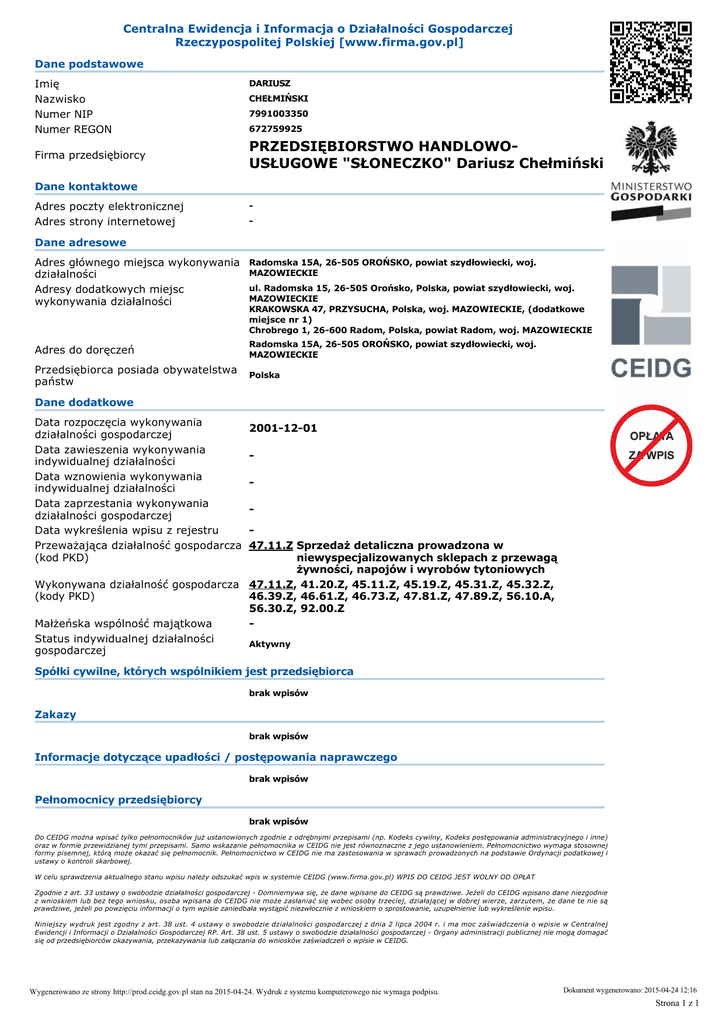 Centralna Ewidencja i Informacja o Działalności Gospodarczej Rzeczypospolitej Polskiej [www.firma.gov.pl] Dane podstawowe Imię Nazwisko Numer NIP Numer REGON Firma przedsiębiorcy DARIUSZ CHEŁMIŃSKI 7991003350 672759925 PRZEDSIĘBIORSTWO HANDLOWO USŁUGOWE "SŁONECZKO" Dariusz Chełmiński Dane kontaktowe Adres poczty elektronicznej Adres strony internetowej Dane adresowe Adres głównego miejsca wykonywania działalności Adresy dodatkowych miejsc wykonywania działalności Radomska 15A, 26505 OROŃSKO, powiat szydłowiecki, woj. MAZOWIECKIE ul. Radomska 15, 26505 Orońsko, Polska, powiat szydłowiecki, woj. MAZOWIECKIE KRAKOWSKA 47, PRZYSUCHA, Polska, woj. MAZOWIECKIE, (dodatkowe miejsce nr 1) Chrobrego 1, 26600 Radom, Polska, powiat Radom, woj. MAZOWIECKIE Adres do doręczeń Radomska 15A, 26505 OROŃSKO, powiat szydłowiecki, woj. MAZOWIECKIE Przedsiębiorca posiada obywatelstwa państw Polska Dane dodatkowe Data rozpoczęcia wykonywania działalności gospodarczej Data zawieszenia wykonywania indywidualnej działalności Data wznowienia wykonywania indywidualnej działalności Data zaprzestania wykonywania działalności gospodarczej Data wykreślenia wpisu z rejestru Przeważająca działalność gospodarcza (kod PKD) 20011201 47.11.Z Sprzedaż detaliczna prowadzona w niewyspecjalizowanych sklepach z przewagą żywności, napojów i wyrobów tytoniowych Wykonywana działalność gospodarcza 47.11.Z, 41.20.Z, 45.11.Z, 45.19.Z, 45.31.Z, 45.32.Z, (kody PKD) 46.39.Z, 46.61.Z, 46.73.Z, 47.81.Z, 47.89.Z, 56.10.A, 56.30.Z, 92.00.Z Małżeńska wspólność majątkowa Status indywidualnej działalności Aktywny gospodarczej Spółki cywilne, których wspólnikiem jest przedsiębiorca brak wpisów Zakazy brak wpisów Informacje dotyczące upadłości / postępowania naprawczego brak wpisów Pełnomocnicy przedsiębiorcy brak wpisów Do CEIDG można wpisać tylko pełnomocników już ustanowionych zgodnie z odrębnymi przepisami (np. Kodeks cywilny, Kodeks postępowania administracyjnego i inne) oraz w formie przewidzianej tymi przepisami. Samo wskazanie pełnomocnika w CEIDG nie jest równoznaczne z jego ustanowieniem. Pełnomocnictwo wymaga stosownej formy pisemnej, którą może okazać się pełnomocnik. Pełnomocnictwo w CEIDG nie ma zastosowania w sprawach prowadzonych na podstawie Ordynacji podatkowej i ustawy o kontroli skarbowej. W celu sprawdzenia aktualnego stanu wpisu należy odszukać wpis w systemie CEIDG (www.firma.gov.pl) WPIS DO CEIDG JEST WOLNY OD OPŁAT Zgodnie z art. 33 ustawy o swobodzie działalności gospodarczej Domniemywa się, że dane wpisane do CEIDG są prawdziwe. Jeżeli do CEIDG wpisano dane niezgodnie z wnioskiem lub bez tego wniosku, osoba wpisana do CEIDG nie może zasłaniać się wobec osoby trzeciej, działającej w dobrej wierze, zarzutem, że dane te nie są prawdziwe, jeżeli po powzięciu informacji o tym wpisie zaniedbała wystąpić niezwłocznie z wnioskiem o sprostowanie, uzupełnienie lub wykreślenie wpisu. Niniejszy wydruk jest zgodny z art. 38 ust. 4 ustawy o swobodzie działalności gospodarczej z dnia 2 lipca 2004 r. i ma moc zaświadczenia o wpisie w Centralnej Ewidencji i Informacji o Działalności Gospodarczej RP. Art. 38 ust. 5 ustawy o swobodzie działalności gospodarczej Organy administracji publicznej nie mogą domagać się od przedsiębiorców okazywania, przekazywania lub załączania do wniosków zaświadczeń o wpisie w CEIDG. Wygenerowano ze strony http://prod.ceidg.gov.pl stan na 20150424. Wydruk z systemu komputerowego nie wymaga podpisu. Dokument wygenerowano: 20150424 12:16 Strona 1 z 1