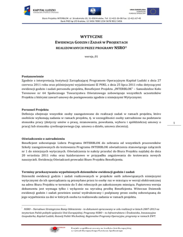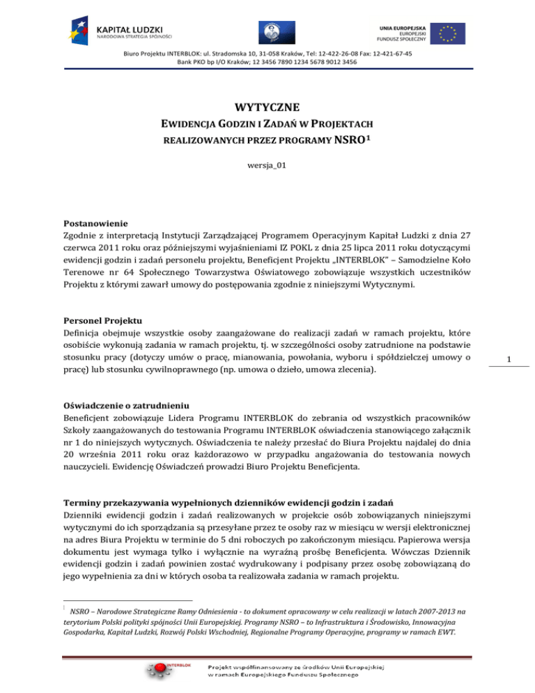 Biuro Projektu INTERBLOK: ul. Stradomska 10, 31-058 Kraków, Tel: 12-422-26-08 Fax: 12-421-67-45 Bank PKO bp I/O Kraków; 12 3456 7890 1234 5678 9012 3456 WYTYCZNE EWIDENCJA GODZIN ZADA PROJEKTACH REALIZOWANYCH PRZEZ PROGRAMY NSRO1 wersja_01 Postanowienie Zgodnie interpretacj Instytucji Zarz dzaj cej Programem Operacyjnym Kapita Ludzki dnia 27 czerwca 2011 roku oraz pó niejszymi wyja nieniami IZ POKL dnia 25 lipca 2011 roku dotycz cymi ewidencji godzin zada personelu projektu, Beneficjent Projektu „INTERBLOK” Samodzielne Ko Terenowe nr 64 Spo ecznego Towarzystwa wiatowego zobowi zuje wszystkich uczestników Projektu którymi zawar umowy do post powania zgodnie niniejszymi Wytycznymi. Personel Projektu Definicja obejmuje wszystkie osoby zaanga owane do realizacji zada ramach projektu, które osobi cie wykonuj zadania ramach projektu, tj. szczególno ci osoby zatrudnione na podstawie stosunku pracy (dotyczy umów prac mianowania, powo ania, wyboru spó dzielczej umowy prac lub stosunku cywilnoprawnego (np. umowa dzie o, umowa zlecenia). wiadczenie zatrudnieniu Beneficjent zobowi zuje Lidera Programu INTERBLOK do zebrania od wszystkich pracowników Szko zaanga owanych do testowania Programu INTERBLOK wiadczenia stanowi cego za cznik nr do niniejszych wytycznych. wiadczenia te nale przes do Biura Projektu najdalej do dnia 20 wrze nia 2011 roku oraz ka dorazowo przypadku anga owania do testowania nowych nauczycieli. Ewidencj wiadcze prowadzi Biuro Projektu Beneficjenta. Terminy przekazywania wype nionych dzienników ewidencji godzin zada Dzienniki ewidencji godzin zada realizowanych projekcie osób zobowi zanych niniejszymi wytycznymi do ich sporz dzania przesy ane przez te osoby raz miesi cu wersji elektronicznej na adres Biura Projektu terminie do dni roboczych po zako czonym miesi cu. Papierowa wersja dokumentu jest wymaga tylko wy cznie na wyra pro Beneficjenta. Wówczas Dziennik ewidencji godzin zada powinien zosta wydrukowany podpisany przez osob zobowi zan do jego wype nienia za dni których osoba ta realizowa zadania ramach projektu. 1 NSRO Narodowe Strategiczne Ramy Odniesienia to dokument opracowany celu realizacji latach 2007-2013 na terytorium Polski polityki spójno ci Unii Europejskiej. Programy NSRO to Infrastruktura rodowisko, Innowacyjna Gospodarka, Kapita Ludzki, Rozwój Polski Wschodniej, Regionalne Programy Operacyjne, programy ramach EWT. Biuro Projektu INTERBLOK: ul. Stradomska 10, 31-058 Kraków, Tel: 12-422-26-08 Fax: 12-421-67-45 Bank PKO bp I/O Kraków; 12 3456 7890 1234 5678 9012 3456 Przyk adowe formy zatrudnienia personelu Projektu Poni sze zestawienie zawiera przyk adowe formy zatrudnienia wraz jego braku zakresie ewidencjonowania godzin zada Projekcie. Forma zatrudnienia jednej osoby Obowi zek prowadzenia ewidencji godzin zada Umowa prac jednym projekcie umowa cywilnoprawna innym projekcie TAK Umowa cywilnoprawna jednym projekcie umowa cywilnoprawna innym projekcie TAK Dwie (i wi cej) umowy cywilnoprawne jednym tym samym projekcie TAK Dodatek do wynagrodzenia ramach stosunku pracy jednym projekcie umowa cywilnoprawna innym projekcie Umowa prac projekcie (zawarta do 31.12.2010 r.) umowa cywilnoprawna innym projekcie (zawarta od 01.01.2011 r.) Za cznik nr Za cznik nr TAK TAK Wzór wiadczenia Wzór dziennika ewidencji godzin zada okre leniem obowi zku lub Komentarz Wydatki zwi zane zatrudnieniem osoby zaanga owanej realizacj zada wi cej ni jednym projekcie kwalifikowalne, ile m.in. osoba ta prowadzi ewidencj godzin zada realizowanych ramach wszystkich projektów przypadku zaanga owania osoby stanowi cej personel projektu na podstawie wi cej ni jednej umowy cywilnoprawnej ramach projektu, wydatki zwi zane wynagrodzeniem personelu kwalifikowalne, je eli m.in. osoba ta prowadzi ewidencj godzin zaanga owanych we wszystkie zadania ramach tego projektu, która mo podlega kontroli Wydatki zwi zane zatrudnieniem osoby zaanga owanej realizacj zada wi cej ni jednym projekcie kwalifikowalne, ile m.in. osoba ta prowadzi ewidencj godzin zada realizowanych ramach wszystkich projektów Biuro Projektu INTERBLOK: ul. Stradomska 10, 31-058 Kraków, Tel: 12-422-26-08 Fax: 12-421-67-45 Bank PKO bp I/O Kraków; 12 3456 7890 1234 5678 9012 3456 Za cznik nr ………………………………………………………………………………………………………………………………………………….. Imi nazwisko osoby sk adaj cej [drukowanymi literami] wiadczenie ………………………………………………………………………………………………………………………………………………………. Nazwa Szko ……………………………………… Numer ewidencyjny szko WIADCZENIE Ja, ………………………………………………………………………………. ni ej podpisany wiadczam, spe niam 2 warunki wymagaj ce nie wymagaj ce sporz dzania dziennika zaj ewidencjonuj cego godziny zadania realizowane ramach jednego kliku projektów. przypadku spe niania warunków wymagaj cych sporz dzenia dziennika ewidencji godzin zada Zobowi zuj si do przekazywania na adres Biura Projektu sporz dzonej ewidencji godzin zada realizowanych projekcie wersji elektronicznej terminie do dni roboczych po zako czonym miesi cu., Zobowi zuj si do dostarczenia wersji papierowej dziennika ewidencji godzin zada na pro Beneficjenta, Zobowi zuj si do efektywnego realizowania zada ramach projektu INTERBLOK. przypadku nie spe niania warunków wymagaj cych sporz dzenia dziennika ewidencji godzin zada na dzie enia niniejszego wiadczenia: Zobowi zuj si do rozpocz cia ewidencjonowania godzin zada projekcie od momentu zaistnienia przes anki powstania takiego obowi zku, Zobowi zuj si nast pstwie tej przes anki do post powania tak jak opisano powy ej. …………………………………………………………………………….. Data, podpis osoby sk adaj cej wiadczenie 2 Niepotrzebne skre li Biuro Projektu INTERBLOK: ul. Stradomsk