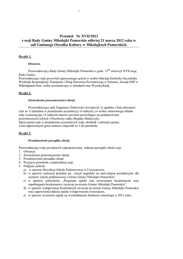 1 Protokół Nr XVII/2012 z sesji Rady Gminy Mikołajki Pomorskie odbytej 21 marca 2012 roku w sali Gminnego Ośrodka Kultury w Mikołajkach Pomorskich. Do pkt 1. Otwarcie. Przewodniczący Rady Gminy Mikołajki Pomorskie o godz. 1500 otworzył XVII sesję Rady Gminy. Przewodniczący rady przywitał zaproszonego gościa w osobie Macieja Derbicha Naczelnika Wydziału Komunikacji Transportu i Dróg Starostwa Powiatowego w Sztumie, Zarząd OSP w Mikołajkach Pom. osoby uczestniczące w obradach oraz Wysoką Radę. Do pkt 2. Stwierdzenie prawomocności obrad. Przewodniczący rady Eugeniusz Żebrowski oświadczył, iż zgodnie z listą obecności (zał. nr 1) aktualnie w posiedzeniu uczestniczy 14 radnych, co wobec ustawowego składu rady wynoszącego 15 radnych stanowi qworum pozwalające na podejmowanie prawomocnych uchwał. (Nieobecny radny Bogdan Mularczyk). Spoza grona rady w posiedzeniu uczestniczyli wójt, skarbnik i sekretarz gminy. Lista zaproszonych gości stanowi załącznik nr 2 do protokołu. Do pkt 3. Przedstawienie porządku obrad. Przewodniczący rady przedstawił zaproponowany radnym porządek obrad sesji: 1. Otwarcie. 2. Stwierdzenie prawomocności obrad. 3. Przedstawienie porządku obrad. 4. Przyjęcie protokołu z poprzedniej sesji. 5. Podjęcie uchwał: a) w sprawie likwidacji Szkoły Podstawowej w Cieszymowie, b) w sprawie realizacji projektu pn. „Język angielski na start-zajęcia pozalekcyjne dla uczniów szkoły podstawowej z terenu Gminy Mikołajki Pomorskie”, c) w sprawie uchwalenia „Programu opieki nad zwierzętami bezdomnymi oraz zapobiegania bezdomności zwierząt na terenie Gminy Mikołajki Pomorskie”, d) w sprawie wyłapywania bezdomnych zwierząt na terenie Gminy Mikołajki Pomorskie oraz zapewnienia dalszej opieki wyłapywanym zwierzętom, e) w sprawie wyrażenia zgody na wyodrębnienie funduszu sołeckiego w 2013 roku, 2 6. 7. 8. 9. f) w sprawie „Gminnego Programu Przeciwdziałania Przemocy w Rodzinie oraz Ochrony Ofiar Przemocy w Rodzinie na lata 2012-2017, g) w sprawie przeznaczenia do sprzedaży nieruchomości gruntowej położonej w Wilczewie, h) w sprawie nabycia nieruchomości gruntowej położonej w Cieszymowie obręb Stążki, i) w sprawie wyrażenia zgody na zawarcie kolejnej umowy dzierżawy, j) w sprawie udzielenia pomocy finansowej dla Powiatu Sztumskiego, k) zmian budżetu gminy Mikołajki Pomorskie na 2012 rok. Sprawozdanie wójta z działalności w okresie międzysesyjnym. Interpelacje i zapytania radnych oraz odpowiedzi. Wolne wnioski i informacje. Zakończenie sesji. Przewodniczący zaproponował wprowadzenie jako punkt 5 „Wystąpienie gościa i pytania w sprawie dróg powiatowych” i w punkcie 6 przed zmianami budżetu gminy jako podpunkt k podjecie uchwały w sprawie zmiany Wieloletniej Prognozy Finansowej Gminy Mikołajki Pomorskie na lata 2012-2022”. Ponadto przewodniczący rady zaproponował, żeby dyskusja na temat dotacji dla OSP odbyła się w punkcie interpelacje i zapytania radnych. Więcej propozycji zmian w porządku obrad sesji nie wniesiono. Radni jednogłośnie przyjęli zaproponowane przez przewodniczącego zmiany w porządku obrad sesji. 1. Otwarcie. 2. Stwierdzenie prawomocności obrad. 3. Przedstawienie porządku obrad. 4. Przyjęcie protokołu z poprzedniej sesji. 5. Wystąpienie gościa i pytania w sprawie dróg powiatowych. 6. Podjęcie uchwał: a) w sprawie likwidacji Szkoły Podstawowej w Cieszymowie, b) w sprawie realizacji projektu pn. „Język angielski na start-zajęcia pozalekcyjne dla uczniów szkoły podstawowej z terenu Gminy Mikołajki Pomorskie”, c) w sprawie uchwalenia „Programu opieki nad zwierzętami bezdomnymi oraz zapobiegania bezdomności zwierząt na terenie Gminy Mikołajki Pomorskie”, d) w sprawie wyłapywania bezdomnych zwierząt na terenie Gminy Mikołajki Pomorskie oraz zapewnienia dalszej opieki wyłapywanym zwierzętom, e) w sprawie wyrażenia zgody na wyodrębnienie funduszu sołeckiego w 2013 roku, f) w sprawie „Gminnego Programu Przeciwdziałania Przemocy w Rodzinie oraz Ochrony Ofiar Przemocy w Rodzinie na lata 2012-2017, g) w sprawie przeznaczenia do sprzedaży nieruchomości gruntowej położonej w Wilczewie, h) w sprawie nabycia nieruchomości gruntowej położonej w Cieszymowie obręb Stążki, i) w sprawie wyrażenia zgody na zawarcie kolejnej umowy dzierżawy, j) w sprawie udzielenia pomocy finansowej dla Powiatu Sztumskiego, k) w sprawie zmiany Wieloletniej Prognozy Finansowej Gminy Mikołajki Pomorskie na lata 2012-2022, l) zmian budżetu gminy Mikołajki Pomorskie na 2012 rok. 6. Sprawozdanie wójta z działalności w okresie międzysesyjnym. 7. Interpelacje i zapytania radnych oraz odpowiedzi. 8. Wolne wnioski i informacje. 9. Zakończenie sesji. Usunięto: Do pkt 3.¶ 3 Lista podjętych na sesji uchwał stanowi załącznik nr 3 do protokołu. Do pkt 4. Przyjęcie protokołu z poprzedniej sesji. Przewodniczący rady poinformował, iż protokół z poprzedniej sesji wyłożony był do wglądu przed sesją w biurze rady oraz przesłany radnym drogą e-mail i radni mieli możliwość zapoznania się z jego treścią. Radni nie wnieśli uwag do protokołu. Po przegłosowaniu w obecności 14 radnych, rada jednogłośnie przyjęła protokół bez odczytywania do akceptującej wiadomości. Do pkt 5. Wystąpienie gościa i pytania w sprawie dróg powiatowych. Naczelnik Wydziału Komunikacji Rozwoju Transportu i Dróg Starostwa Powiatowego w Sztumie Pan Maciej Derbich podziękował za zaproszenie na sesję wicestarosty i usprawiedliwił nieobecność wicestarosty ze względu na bardzo bogaty terminarz spotkań. Starostwo wydało zgodę na objazd w związku z modernizacją linii kolejowej, drogą z Mikołajek przez Mirowice, Polaszki, Watkowice do Pierzchowic a droga ta jest w bardzo złym stanie zauważył radny Kazimierz Marchlewski.. Najpierw trzeba było wyremontować drogę i dopiero zrobić objazd, stwierdził radny. Pan M.Derbich odpowiedział, że w chwili obe