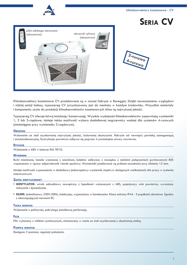 klimakonwektory kasetonowe - CV Seria CV pilot zdalnego sterowania (akcesorium) sterownik cyfrowy (akcesorium) 2-ru ro 4-ru we rowe Klimakonwektory kasetonowe CV produkowane są w naszej fabryce w Bareggio. Dzięki nowoczesnemu wyglądowi i niskiej emisji hałasu, typoszereg CV przystosowany jest do montażu w każdym środowisku. Wszystkie materiały i komponenty użyte do produkcji klimakonwektorów kasetonowych Atisa są najwyższej jakości. Typoszereg CV oferuje łatwą instalację i konserwację. Wysokie wydajności klimakonwektorów zapewniają wymienniki 1, 2 lub 3-rzędowe; istnieje także możliwość wyboru dodatkowej nagrzewnicy wodnej dla systemów 4-rurowych (niedostępne przy wymienniku 3-rzędowym). Obudowa Wykonanie ze stali ocynkowanej najwyższej jakości, izolowanej akustycznie. Pokrycie od wewnątrz powłoką samogasnącą i antykondensacyjną. Dystrybucja powietrza odbywa się poprzez 4 prostokątne otwory nawiewne. Dyfuzor Wykonanie z ABS w kolorze RAL 9010. Wymiennik Rurki miedziane, lamele wykonane z aluminium, kolektor odlewany z mosiądzu z żeńskimi połączeniami gwintowanymi BSP, wyposażony w ręczny odpowietrznik i korek spustowy. Wymienniki poddawane są próbom szczelności przy ciśnieniu 15 atm. Istnieje możliwość wyposażenia w dodatkowy jednorzędowy wymiennik ciepła (w dostępnych wielkościach) dla pracy w systemie czterorurowym. Zespół wentylatorowy • WENTYLATOR: wirnik odśrodkowy zewnętrzny z łopatkami wykonanymi z ABS, pojedynczy wlot powietrza, wyważony statycznie i dynamicznie. • SILNIK: jednofazowy 230V-50Hz, indukcyjny, wyposażony w kondensator. Klasa ochrony IP44 - 3 prędkości obrotowe. Zgodny z obowiązującymi normami EC. Tacka skroplin Wykonanie z polistyrolu, pokrytego plastikową perforacją. Filtr Filtr wykonany z włókien syntetycznych, umieszczony w ramie ze stali ocynkowanej z obustronną siatką. Pompka skroplin Dostępne 3 poziomy regulacji położenia. 1 klimakonwektory kasetonowe - CV Akcesoria • PX - jednorzędowa nagrzewnica wodna • WS - panel do montażu naściennego sterownika • SH - czujnik wody dla sterowników RARD • SM - czujnik temperatury minimalnej • System zdalnego sterowania: TLC - pilot zdalnego sterowania TLC/R - odbiornik (montaż na urządzeniu) TLC/S - karta elektroniczna + czujnik (montaż na urządzeniu) • RELÉ - skrzynka przekaźnikowa do równoległego podłączenia do 4 jednostek • BK - dodatkowa tacka skroplin • MK - kołnierz ze stali ocynkowanej dla powietrza nawiewanego do sąsiedniego pomieszczenia • AK - kołnierz ze stali ocynkowanej dla powietrza świeżego • VA2 - zawór 2-drogowy on/off sterowany siłownikiem 230V • VA3 - zawór 3-drogowy on/off sterowany siłownikiem 230V • VA2M - zawór 2-drogowy modulacyjny sterowany siłownikiem 230V • VA3M - zawór 3-drogowy modulacyjny sterowany siłownikiem 230V • K2V-2(3,4) - zestaw przyłączeniowy zaworu 2-drogowego • K3V-2(3,4) - zestaw przyłączeniowy zaworu 3-drogowego • FS - sterownik (on/off, 3 prędkości) • RM - sterownik z termostatem (on/off, tryb lato/zima, 3 prędkości, pokrętło regulacji temperatury) • RA - sterownik z termostatem i automatyczną regulacją pracy wentylatora (on/off, tryb lato/zima, 3 prędkości + tryb auto, pokrętło regulacji temperatury) • RD - sterownik cyfrowy z termostatem i funkcją harmonogramu pracy urządzenia (przycisk on/off, przełącznik biegów wentylatora, przycisk menu, pokrętło regulacji temperatury) Wymiary 580 = 580 40 89 105 = 5 275 105 = 107 31 = 105 A 86 580 97 480 B B 650 nawiew po 650 555 wymiennik dodatkowy 1/2” (opcja) y 1/2” 555 B B stro 822 == ycznych 822 90 = 116 105 = 315 143 111 60 115 A 56 822 150 odprowadzenie skroplin Ø10 115 Jednostki CV01-CV23 A 5 60 120 B B 930 700 nawiew po 798 930 wymiennik dodatkowy 1/2” (opcja) y 3/4” Jednostki CV32-CV43 2 B 798 A odprowadzenie skroplin Ø10 B stro ycznych klimakonwektory kasetonowe - CV Parametry jednostek MODEL moc pobierana moc akustyczna Parametry chłodzenia temperatura wody temperatura wody Parametry grzania temperatura powietrza temperatura wody moc grzewcza 3 klimakonwektory kasetonowe - CV Tabela doboru akcesoriów SYMBOL 4
