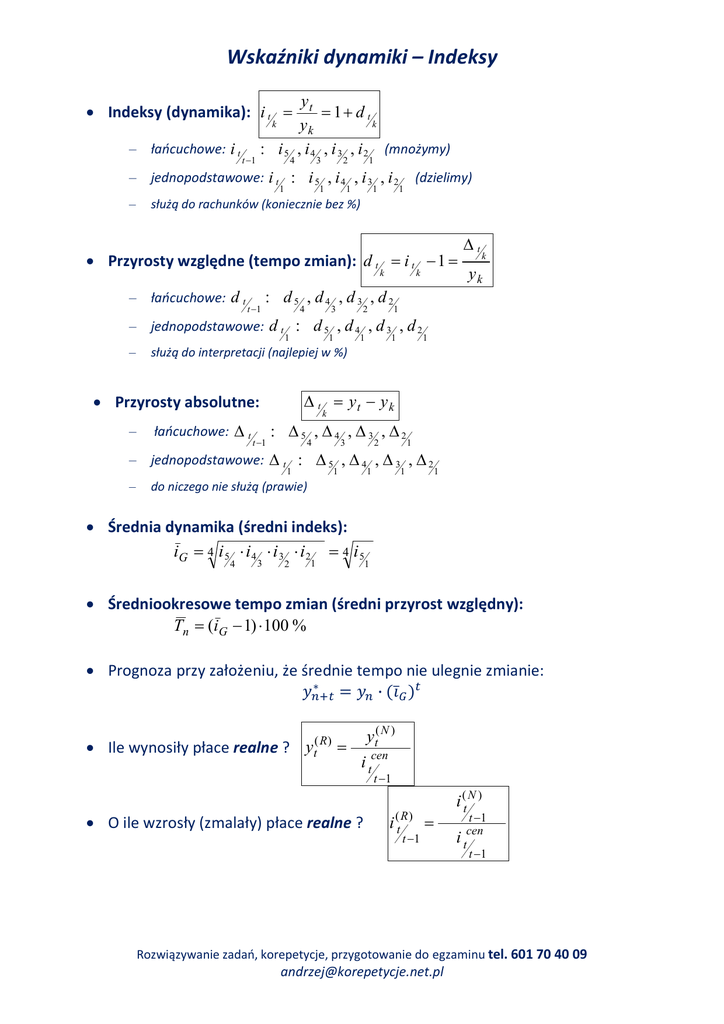 Wskaźniki dynamiki – Indeksy yt 1 d t k k yk : i 5 , i 4 , i 3 , i 2 (mnożymy) Indeksy (dynamika): i t – – łańcuchowe: i t t 1 4 3 1 jednopodstawowe: i t : i 5 , i 4 , i 3 , i 2 1 – 2 1 1 1 (dzielimy) 1 służą do rachunków (koniecznie bez %) Przyrosty względne (tempo zmian): d t i t 1 k – łańcuchowe: d t t 1 k : d5 , d4 , d 3 , d2 4 3 2 jednopodstawowe: d t : d 5 , d 4 , d 3 , d 2 – służą do interpretacji (najlepiej w %) Przyrosty absolutne: – łańcuchowe: t t 1 1 1 1 t yt y k k : 5 , 4 , 3 , 2 4 3 2 1 jednopodstawowe: t : 5 , 4 , 3 , 2 – do niczego nie służą (prawie) 1 1 1 Średnia dynamika (średni indeks): iG 4 i 5 i 4 i 3 i 2 4 i 5 3 yk 1 – 4 k 1 – 1 t 2 1 1 1 1 Średniookresowe tempo zmian (średni przyrost względny): Tn (iG 1) 100 % Prognoza przy założeniu, że średnie tempo nie ulegnie zmianie: ∗ = ∙( ̅ ) Ile wynosiły płace realne ? yt( R) yt( N ) i tcen t 1 O ile wzrosły (zmalały) płace realne ? i (tR ) t 1 i (t N ) t 1 cen it t 1 Rozwiązywanie zadań, korepetycje, przygotowanie do egzaminu tel. 601 70 40 09 [email protected]