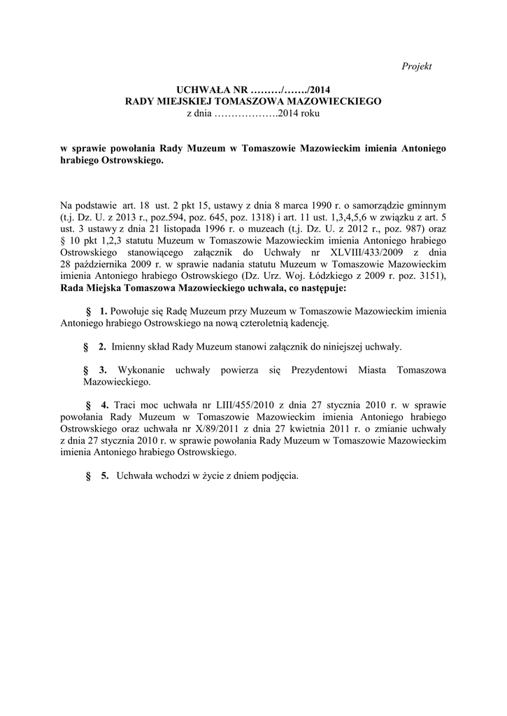 Projekt UCHWAŁA NR ………/……./2014 RADY MIEJSKIEJ TOMASZOWA MAZOWIECKIEGO z dnia ……………….2014 roku w sprawie powołania Rady Muzeum w Tomaszowie Mazowieckim imienia Antoniego hrabiego Ostrowskiego. Na podstawie art. 18 ust. 2 pkt 15, ustawy z dnia 8 marca 1990 r. o samorządzie gminnym (t.j. Dz. U. z 2013 r., poz.594, poz. 645, poz. 1318) i art. 11 ust. 1,3,4,5,6 w związku z art. 5 ust. 3 ustawy z dnia 21 listopada 1996 r. o muzeach (t.j. Dz. U. z 2012 r., poz. 987) oraz § 10 pkt 1,2,3 statutu Muzeum w Tomaszowie Mazowieckim imienia Antoniego hrabiego Ostrowskiego stanowiącego załącznik do Uchwały nr XLVIII/433/2009 z dnia 28 października 2009 r. w sprawie nadania statutu Muzeum w Tomaszowie Mazowieckim imienia Antoniego hrabiego Ostrowskiego (Dz. Urz. Woj. Łódzkiego z 2009 r. poz. 3151), Rada Miejska Tomaszowa Mazowieckiego uchwala, co następuje: § 1. Powołuje się Radę Muzeum przy Muzeum w Tomaszowie Mazowieckim imienia Antoniego hrabiego Ostrowskiego na nową czteroletnią kadencję. § 2. Imienny skład Rady Muzeum stanowi załącznik do niniejszej uchwały. § 3. Wykonanie Mazowieckiego. uchwały powierza się Prezydentowi Miasta Tomaszowa § 4. Traci moc uchwała nr LIII/455/2010 z dnia 27 stycznia 2010 r. w sprawie powołania Rady Muzeum w Tomaszowie Mazowieckim imienia Antoniego hrabiego Ostrowskiego oraz uchwała nr X/89/2011 z dnia 27 kwietnia 2011 r. o zmianie uchwały z dnia 27 stycznia 2010 r. w sprawie powołania Rady Muzeum w Tomaszowie Mazowieckim imienia Antoniego hrabiego Ostrowskiego. § 5. Uchwała wchodzi w życie z dniem podjęcia. Załącznik do uchwały nr …../……./2014 Rady Miejskiej Tomaszowa Mazowieckiego z dnia ………2014 r. Skład Rady Muzeum w Tomaszowie Mazowieckim imienia Antoniego hrabiego Ostrowskiego 1. Waldemar Wendrowski /Zastępca Prezydenta Miasta Tomaszowa Mazowieckiego/ - Przedstawiciel Prezydenta Miasta 2.…………………………………………………………- Przedstawiciel Rady Miejskiej 3………………………………………………………….- Przedstawiciel Rady Miejskiej 4. Jan Rybak - prezes Towarzystwa Przyjaciół Muzeum; 5. Wiesława Bogurat - etnograf, muzealnik, dyrektor Muzeum w Tomaszowie Mazowieckim im. A. hr. Ostrowskiego w latach 1991-2013; 6. Elżbieta Szymańska - przedsiębiorca, właściciel hoteli, restauracji i sklepów w Polsce i zagranicą, m.in. tomaszowskiej firmy KELMES; 7. dr Robert Kotowski - historyk, nauczyciel akademicki, Dyrektor Muzeum Narodowego w Kielcach 8. dr Tomasz Matuszak - historyk, archiwista, Dyrektor Archiwum Państwowego w Piotrkowie Trybunalskim; 9. dr Maria Piech - pracownik naukowy Wydziału Turystyki i Rekreacji Uniwersytetu Łódzkiego, Filia w Tomaszowie Mazowieckim; 10. Alicja Woźniak - etnolog, muzealnik, st. kustosz działu stroju i tkaniny w Muzeum Archeologicznym i Etnograficznym w Łodzi. UZASADNIENIE Zgodnie z art. 11 ust. 1 i 3 w związku z art. 5 ust. 3 ustawy z dnia 21 listopada 1996 r. o muzeach (tekst jednolity Dz. U. z 2012 r. poz. 987 z późn. zm.) przy muzeum samorządowym działa Rada Muzeum, której członków na 4-letnią kadencję powołuje jednostka samorządu terytorialnego. Zgodnie z art.11 ust. 4 ustawy członków Rady – nie przekraczającej 15 osób powołuje i odwołuje jednostka samorządu terytorialnego. Zadaniem Rady Muzeum jest sprawowanie nadzoru nad wypełnianiem przez muzeum jego powinności wobec zbiorów i społeczeństwa, a w szczególności nad realizacją zadań i celów statutowych placówki muzealnej. Rada wybiera ze swojego grona przewodniczącego. Skład Rady Muzeum określa art. 11 ust. 5 ustawy stanowiąc, że w skład Rady Muzeum powołane są osoby spośród kandydatów wskazanych przez: 1) jednostkę samorządu terytorialnego, 2) właściwe ze względu na siedzibę muzeum organy jednostek samorządu terytorialnego, 3) stowarzyszenia naukowe i twórcze, 4) fundacje i inne instytucje wspierające działalność muzeum, 5) dyrektora muzeum, 6) samą Radę Muzeum. W związku z tym, że upłynęła czteroletnia kadencja dotychczasowej Rady Muzeum w Tomaszowie Mazowieckim imienia hrabiego Antoniego Ostrowskiego powołanej uchwałą nr LIII/455/2010 Rady Miejskiej Tomaszowa Mazowieckiego z dnia 27 stycznia 2010 r. w sprawie powołania Rady Muzeum w Tomaszowie Mazowieckim imienia Antoniego hrabiego Ostrowskiego oraz uchwałą nr X/89/2011 Rady Miejskiej Tomaszowa Mazowieckiego z dnia 27 kwietnia 2011 r. o zmianie uchwały nr LIII/455/2010 Rady Miejskiej Tomaszowa Mazowieckiego z dnia 27 stycznia 2010 r. w sprawie powołania Rady Muzeum w Tomaszowie Mazowieckim imienia Antoniego hrabiego Ostrowskiego, proponuje się przyjęcie uchwały określającej nowy, 10 osobowy skład Rady Muzeum. W związku powyższym do składu Rady Muzeum w Tomaszowie Mazowieckim im. A. hr. Ostrowskiego proponuje się osoby, których imienna lista stanowi Załącznik do uchwały. Osoby te są desygnowane przez odpowiednie instytucje lub przyjęły zaproszenie Prezydenta Miasta Tomaszowa Mazowieckiego oraz Dyrektor Muzeum w Tomaszowie Mazowieckim do uczestnictwa w działaniach Rady Muzeum i wyrażają chęć pracy w Radzie. Tomaszów Mazowiecki, ………………………….. 2014 r.