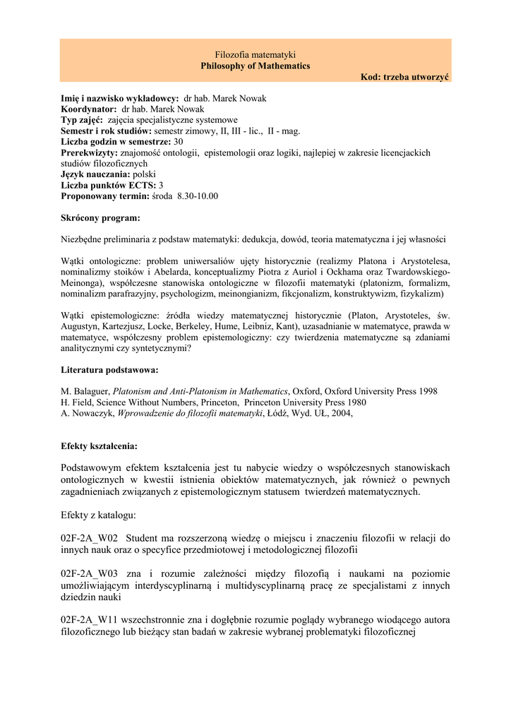 Filozofia matematyki Philosophy of Mathematics Kod: trzeba utworzyć Imię i nazwisko wykładowcy: dr hab. Marek Nowak Koordynator: dr hab. Marek Nowak Typ zajęć: zajęcia specjalistyczne systemowe Semestr i rok studiów: semestr zimowy, II, III - lic., II - mag. Liczba godzin w semestrze: 30 Prerekwizyty: znajomość ontologii, epistemologii oraz logiki, najlepiej w zakresie licencjackich studiów filozoficznych Język nauczania: polski Liczba punktów ECTS: 3 Proponowany termin: środa 8.30-10.00 Skrócony program: Niezbędne preliminaria z podstaw matematyki: dedukcja, dowód, teoria matematyczna i jej własności Wątki ontologiczne: problem uniwersaliów ujęty historycznie (realizmy Platona i Arystotelesa, nominalizmy stoików i Abelarda, konceptualizmy Piotra z Auriol i Ockhama oraz TwardowskiegoMeinonga), współczesne stanowiska ontologiczne w filozofii matematyki (platonizm, formalizm, nominalizm parafrazyjny, psychologizm, meinongianizm, fikcjonalizm, konstruktywizm, fizykalizm) Wątki epistemologiczne: źródła wiedzy matematycznej historycznie (Platon, Arystoteles, św. Augustyn, Kartezjusz, Locke, Berkeley, Hume, Leibniz, Kant), uzasadnianie w matematyce, prawda w matematyce, współczesny problem epistemologiczny: czy twierdzenia matematyczne są zdaniami analitycznymi czy syntetycznymi? Literatura podstawowa: M. Balaguer, Platonism and Anti-Platonism in Mathematics, Oxford, Oxford University Press 1998 H. Field, Science Without Numbers, Princeton, Princeton University Press 1980 A. Nowaczyk, Wprowadzenie do filozofii matematyki, Łódź, Wyd. UŁ, 2004, Efekty kształcenia: Podstawowym efektem kształcenia jest tu nabycie wiedzy o współczesnych stanowiskach ontologicznych w kwestii istnienia obiektów matematycznych, jak również o pewnych zagadnieniach związanych z epistemologicznym statusem twierdzeń matematycznych. Efekty z katalogu: 02F-2A_W02 Student ma rozszerzoną wiedzę o miejscu i znaczeniu filozofii w relacji do innych nauk oraz o specyfice przedmiotowej i metodologicznej filozofii 02F-2A_W03 zna i rozumie zależności między filozofią i naukami na poziomie umożliwiającym interdyscyplinarną i multidyscyplinarną pracę ze specjalistami z innych dziedzin nauki 02F-2A_W11 wszechstronnie zna i dogłębnie rozumie poglądy wybranego wiodącego autora filozoficznego lub bieżący stan badań w zakresie wybranej problematyki filozoficznej