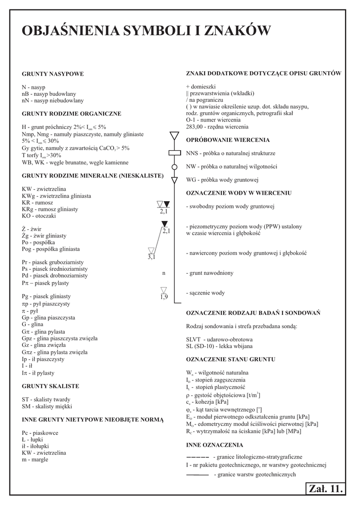 OBJAŒNIENIA SYMBOLI I ZNAKÓW GRUNTY NASYPOWE ZNAKI DODATKOWE DOTYCZ¥CE OPISU GRUNTÓW N - nasyp nB - nasyp budowlany nN - nasyp niebudowlany + domieszki || przewarstwienia (wk³adki) / na pograniczu ( ) w nawiasie okreœlenie uzup. dot. sk³adu nasypu, rodz. gruntów organicznych, petrografii ska³ O-1 - numer wiercenia 283,00 - rzêdna wiercenia GRUNTY RODZIME ORGANICZNE H - grunt próchniczy 2%< Iom < 5% Nmp, Nmg - namu³y piaszczyste, namu³y gliniaste 5% < Iom < 30% Gy gytie, namu³y z zawartoœci¹ CaCO3 > 5% T torfy Iom >30% WB, WK - wêgle brunatne, wêgle kamienne OPRÓBOWANIE WIERCENIA NNS - próbka o naturalnej strukturze NW - próbka o naturalnej wilgotnoœci GRUNTY RODZIME MINERALNE (NIESKALISTE) KW - zwietrzelina KWg - zwietrzelina gliniasta KR - rumosz KRg - rumosz gliniasty KO - otoczaki OZNACZENIE WODY W WIERCENIU 2,1 ¯ - ¿wir ¯g - ¿wir gliniasty Po - pospó³ka Pog - pospó³ka gliniasta Pr - piasek gruboziarnisty Ps - piasek œrednioziarnisty Pd - piasek drobnoziarnisty Pp - piasek pylasty Pg - piasek gliniasty pp - py³ piaszczysty p - py³ Gp - glina piaszczysta G - glina Gp - glina pylasta Gpz - glina piaszczysta zwiêz³a Gz - glina zwiêz³a Gpz - glina pylasta zwiêz³a Ip - i³ piaszczysty I - i³ Ip - i³ pylasty 2,1 - swobodny poziom wody gruntowej - piezometryczny poziom wody (PPW) ustalony w czasie wiercenia i g³êbokoœæ - nawiercony poziom wody gruntowej i g³êbokoœæ 3,1 n 1,9 GRUNTY SKALISTE ST - skalisty twardy SM - skalisty miêkki INNE GRUNTY NIETYPOWE NIEOBJÊTE NORM¥ Pc - piaskowce £ - ³upki i³ - i³o³upki KW - zwietrzelina m - margle WG - próbka wody gruntowej - grunt nawodniony - s¹czenie wody OZNACZENIE RODZAJU BADAÑ I SONDOWAÑ Rodzaj sondowania i strefa przebadana sond¹: SLVT - udarowo-obrotowa SL (SD-10) - lekka wbijana OZNACZENIE STANU GRUNTU Wn - wilgotnoœæ naturalna ID - stopieñ zagêszczenia IL - stopieñ plastycznoœæ r - gêstoœæ objêtoœciowa [t/m3] cu - kohezja [kPa] ju - k¹t tarcia wewnêtrznego [o] EO - modu³ pierwotnego odkszta³cenia gruntu [kPa] MO - edometryczny modu³ œciœliwoœci pierwotnej [kPa] RC - wytrzyma³oœæ na œciskanie [kPa] lub [MPa] INNE OZNACZENIA - granice litologiczno-stratygraficzne I - nr pakietu geotechnicznego, nr warstwy geotechnicznej - granice warstw geotechnicznych Za³. 11.