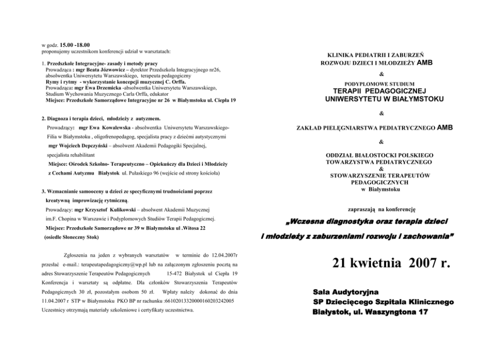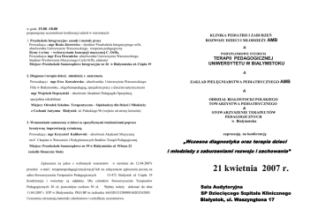 w godz. 15.00 -18.00 proponujemy uczestnikom konferencji udział w warsztatach: 1. Przedszkole Integracyjne- zasady i metody pracy Prowadząca : mgr Beata Józwowicz – dyrektor Przedszkola Integracyjnego nr26, absolwentka Uniwersytetu Warszawskiego, terapeuta pedagogiczny Rymy i rytmy - wykorzystanie koncepcji muzycznej C. Orffa. Prowadząca: mgr Ewa Drzemicka -absolwentka Uniwersytetu Warszawskiego, Studium Wychowania Muzycznego Carla Orffa, edukator Miejsce: Przedszkole Samorządowe Integracyjne nr 26 w Białymstoku ul. Ciepła 19 KLINIKA PEDIATRII I ZABURZEŃ ROZWOJU DZIECI I MŁODZIEśY AMB & PODYPLOMOWE STUDIUM TERAPII PEDAGOGICZNEJ UNIWERSYTETU W BIAŁYMSTOKU & 2. Diagnoza i terapia dzieci, młodzieŜy z autyzmem. Prowadzący: mgr Ewa Kowalewska - absolwentka Uniwersytetu Warszawskiego- ZAKŁAD PIELĘGNIARSTWA PEDIATRYCZNEGO AMB Filia w Białymstoku , oligofrenopedagog, specjalista pracy z dziećmi autystycznymi mgr Wojciech Depczyński – absolwent Akademii Pedagogiki Specjalnej, specjalista rehabilitant Miejsce: Ośrodek Szkolno- Terapeutyczno – Opiekuńczy dla Dzieci i MłodzieŜy z Cechami Autyzmu Białystok ul. Pułaskiego 96 (wejście od strony kościoła) 3. Wzmacnianie samooceny u dzieci ze specyficznymi trudnościami poprzez & ODDZIAŁ BIAŁOSTOCKI POLSKIEGO TOWARZYSTWA PEDIATRYCZNEGO & STOWARZYSZENIE TERAPEUTÓW PEDAGOGICZNYCH w Białymstoku kreatywną improwizację rytmiczną. Prowadzący: mgr Krzysztof Kulikowski – absolwent Akademii Muzycznej im.F. Chopina w Warszawie i Podyplomowych Studiów Terapii Pedagogicznej. zapraszają na konferencję „Wczesna diagnostyka oraz terapia dzieci Miejsce: Przedszkole Samorządowe nr 39 w Białymstoku ul .Witosa 22 i młodzieŜy z zaburzeniami rozwoju i zachowania zachowania” nia” (osiedle Słoneczny Stok) Zgłoszenia na jeden z wybranych warsztatów w terminie do 12.04.2007r przesłać e-mail.: [email protected] lub na załączonym zgłoszeniu pocztą na adres Stowarzyszenie Terapeutów Pedagogicznych 21 kwietnia 2007 r. 15-472 Białystok ul Ciepła 19 Konferencja i warsztaty są odpłatne. Dla członków Stowarzyszenia Terapeutów Pedagogicznych 30 zł, pozostałym osobom 50 zł. Wpłaty naleŜy dokonać do dnia 11.04.2007 r STP w Białymstoku PKO BP nr rachunku :66102013320000160203242005 Uczestnicy otrzymają materiały szkoleniowe i certyfikaty uczestnictwa. Sala Audytoryjna SP Dziecięcego Szpitala Klinicznego Białystok, ul. Waszyngtona 17 PROGRAM NAUKOWY KONFERENCJI 10.00 Otwarcie konferencji Prof. dr hab. med.J.D. Piotrowska- JastrzębskaKierownik Kliniki Pediatrii i Zaburzeń Rozwoju Dzieci i MłodzieŜy AMB Prezes Oddziału Białostockiego Polskiego Towarzystwa Pediatrycznego 10.10 Wystąpienie Organizatorów i zaproszonych Gości SESJA I Przewodniczący: Prof. dr hab. J.D. Piotrowska -Jastrzębska, Dr n. med. A. Iwaszkiewicz -Pawłowska, Dr n.. hum. A. Balejko 10.30 Holistyczne ujęcie procesu diagnozowania w naukach pedagogicznych Prof. dr hab. J. Nikitorowicz – Rektor Uniwersytetu w Białymstoku 10.50 Wspomaganie rozwoju mowy u niemowląt i małych dzieci Dr n. hum. A. Balejko – Podyplomowe Studium Terapii Pedagogicznej Uniwersytetu w Białymstoku 11.10 Wczesna diagnostyka i terapia dzieci z zaburzeniami mowy mgr E. Okarma – Akademia Pedagogiczna w Krakowie 11.30 11.40 Pytania i dyskusje Przerwa /kawa,herbata/ SESJA II Przewodniczący: Prof. dr hab. med. E. Maciorkowska Dr n. med. H. Kądziela-Olech, Dr n. med. I. Białokoz-Kalinowska 12.00 Zaburzenia psychiczne u dzieci i młodzieŜy Dr n. med. H. Kądziela –Olech – Klinika Pediatrii AMB Dzienny Oddział Psychiatryczny SP DSK 12.20 Formy oddziaływania psychoterapeutycznego u dzieci i młodzieŜy mgr U. Dymnicka, mgr E. Chodakiewicz – Klinika Pediatrii AMB – Dzienny Oddział Psychiatryczny SP DSK 12.40 Niedobory Ŝywieniowe u dzieci – problem medyczny, pedagogiczny i społeczny Dr n. med. M.Piotrowska- Depta, Dr n. med.I. Białokoz-Kalinowska Prof. dr hab. J.D. Piotrowska-Jastrzębska – Klinika Pediartii AMB 12.55 Medyczno-psychologiczne i społeczno-prawne aspekty zatruć u dzieci i młodzieŜy – analiza materiału Kliniki Pediatrii AMB Dr B. Nawrocka, dr K. Kierus-Jankowska Prof. dr hab. J.D. Piotrowska-Jastrzębska - Klinika Pediatrii AMB 13.10 Zachowania ryzykowne u dzieci i młodzieŜy Prof. dr hab. E. Maciorkowska, mgr A. Sacharewicz- Zakład Pielęgniarstwa Pediatrycznego AMB 13.25 Występowanie zachowań ryzykownych wśród dzieci i młodzieŜy Białegostoku Prof. dr hab. E. Maciorkowska, mgr A.. Sacharewicz - Zakład Pielęgniarstwa Pediatrycznego AMB 13.40 Pytania i dyskusja 13.50 Podsumowanie i zakończenie Konferencji Prof. dr hab. J.D. Piotrowska-Jastrzębska