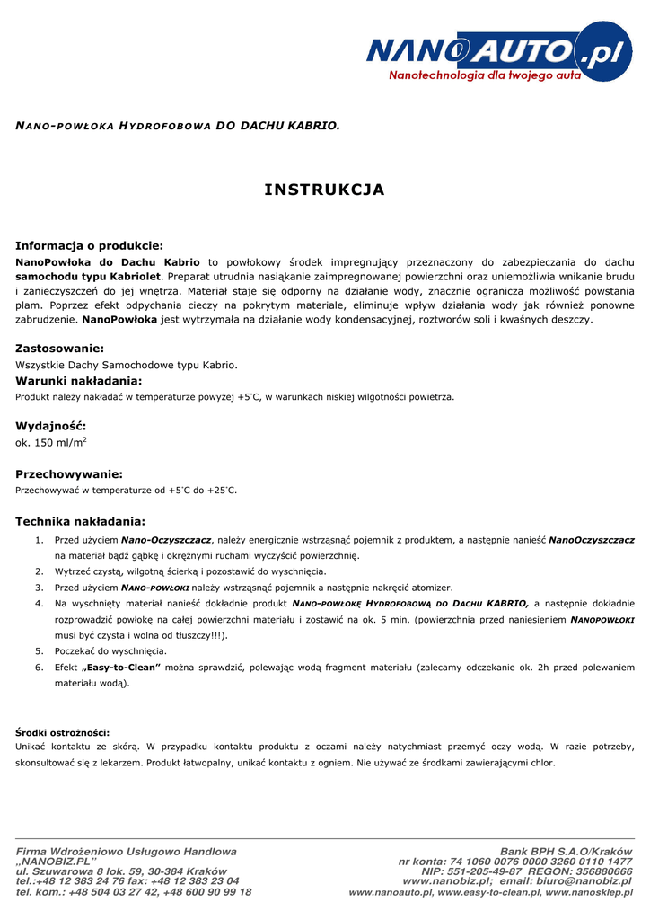 N A N O - P O W Ł O K A H Y D R O F O B O W A DO DACHU KABRIO. INSTRUKCJA Informacja o produkcie: NanoPowłoka do Dachu Kabrio to powłokowy środek impregnujący przeznaczony do zabezpieczania do dachu samochodu typu Kabriolet. Preparat utrudnia nasiąkanie zaimpregnowanej powierzchni oraz uniemożliwia wnikanie brudu i zanieczyszczeń do jej wnętrza. Materiał staje się odporny na działanie wody, znacznie ogranicza możliwość powstania plam. Poprzez efekt odpychania cieczy na pokrytym materiale, eliminuje wpływ działania wody jak również ponowne zabrudzenie. NanoPowłoka jest wytrzymała na działanie wody kondensacyjnej, roztworów soli i kwaśnych deszczy. Zastosowanie: Wszystkie Dachy Samochodowe typu Kabrio. Warunki nakładania: Produkt należy nakładać w temperaturze powyżej +5˚C, w warunkach niskiej wilgotności powietrza. Wydajność: ok. 150 ml/m2 Przechowywanie: Przechowywać w temperaturze od +5˚C do +25˚C. Technika nakładania: 1. Przed użyciem Nano-Oczyszczacz, należy energicznie wstrząsnąć pojemnik z produktem, a następnie nanieść NanoOczyszczacz na materiał bądź gąbkę i okrężnymi ruchami wyczyścić powierzchnię. 2. Wytrzeć czystą, wilgotną ścierką i pozostawić do wyschnięcia. 3. Przed użyciem NANO-POWŁOKI należy wstrząsnąć pojemnik a następnie nakręcić atomizer. 4. Na wyschnięty materiał nanieść dokładnie produkt NANO-POWŁOKĘ HYDROFOBOWĄ DO DACHU KABRIO, a następnie dokładnie rozprowadzić powłokę na całej powierzchni materiału i zostawić na ok. 5 min. (powierzchnia przed naniesieniem NANOPOWŁOKI musi być czysta i wolna od tłuszczy!!!). 5. Poczekać do wyschnięcia. 6. Efekt „Easy-to-Clean” można sprawdzić, polewając wodą fragment materiału (zalecamy odczekanie ok. 2h przed polewaniem materiału wodą). Środki ostrożności: Unikać kontaktu ze skórą. W przypadku kontaktu produktu z oczami należy natychmiast przemyć oczy wodą. W razie potrzeby, skonsultować się z lekarzem. Produkt łatwopalny, unikać kontaktu z ogniem. Nie używać ze środkami zawierającymi chlor. Firma Wdrożeniowo Usługowo Handlowa „NANOBIZ.PL” ul. Szuwarowa 8 lok. 59, 30-384 Kraków tel.:+48 12 383 24 76 fax: +48 12 383 23 04 tel. kom.: +48 504 03 27 42, +48 600 90 99 18 Bank BPH S.A.O/Kraków nr konta: 74 1060 0076 0000 3260 0110 1477 NIP: 551-205-49-87 REGON: 356880666 www.nanobiz.pl; email: [email protected] www.nanoauto.pl, www.easy-to-clean.pl, www.nanosklep.pl