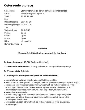 Ogłoszenie o pracę Stanowisko Starszy referent do spraw sprzętu informatycznego Email [email protected] Telefon 77 47 42 944 Fax Data składania 2016-01-20 Data wygaśnięcia 2016-01-20 Tagi Województwo OPOLSKIE Powiat Opole Gmina Opole Miasto Opole Ulica ul. Licealna Numer budynku 3 Dyrektor Zespołu Szkół Ogólnokształcących Nr I w Opolu 1. Adres jednostki: 45-714 Opole ul. Licealna 3 2. Określenie stanowiska: starszy referent ds. sprzętu informatycznego 3. Wymiar etatu 0,5 etatu 4. Wymagania niezbędne związane ze stanowiskiem: ● ● ● ● ● ● ● obywatelstwo państwa członkowskiego Unii Europejskiej, pełna zdolność do czynności prawnych oraz korzystanie w pełni praw publicznych, posiadanie kwalifikacji zawodowych wymaganych do wykonywania pracy na określonym stanowisku tj. wykształcenie wyższe lub średnie techniczne, doświadczenie zawodowe minimum 1 rok na podobnym stanowisku, nieposzlakowana opinia, osoba kandydująca nie może być prawomocnie skazana za przestępstwo popełnione umyślnie ścigane z oskarżenia publicznego lub za umyślne przestępstwa skarbowe, brak przeciwskazań zdrowotnych do wykonywania pracy na stanowisku urzędniczym. 5. Wymagania dodatkowe związane ze stanowiskiem: ● ● ● ● ● ● ● ● ● umiejętność pracy w zespole, znajomość przepisów wymaganych w ramach danego stanowiska, pozwalających na prawidłowe wykonywanie powierzonych zdań, dobra znajomość pakietu MS Office, Windows Serwer 2003,cms joomla, administrowanie sieciami LAN, VLAN, wifi, WAN znajomość systemu Windows w wersjach od XP do 8.1 Predyspozycje i cechy osobowe wysoka kultura osobista, komunikatywność, umiejętność organizowania pracy na stanowisku, dokładność, sumienność, rzetelność, terminowość, potrzeba doskonalenia swoich umiejętności, samodoskonalenie zawodowe, samodzielność w rozwiazywaniu problemów. 6. Ogólny zakres wykonywanych zadań na stanowisku: ● ● ● ● ● ● ● ● ● utrzymywanie i zarzadzanie sieciami lokalnymi ( LAN )i rozległymi (WAN)instytucji, znajomość os Microtik, Ubiquit Unifi, analiza potrzeb i planowanie rozwoju/ wdrożeń oprogramowania sprzętu, obsługa i kontrola usług gwarancyjnych i pogwarancyjnych dotyczących sprzętu teleinformatycznego , administrowanie i rozwój stron www opartych na csm joomla, zarzadzanie domena oparta na MS Serwer 2003, administrowanie oprogramowaniem MS Office, programami do zarzadzania szkołą oprogramowanie ZUS – płatnik, antywirus pakiet Kaspersky, obsługa monitoringu na terenie obiektów szkolnych, administracja dziennikiem elektronicznym, tworzenie materiałów graficznych, 7. Wymagane dokumenty: ● ● ● ● ● ● ● ● list motywacyjny, CV kwestionariusz osobowy dla osób ubiegających się o zatrudnienie, kserokopie dokumentów potwierdzających wykształcenie i kwalifikacje wymagane do zajmowania stanowiska, kserokopie innych dokumentów o posiadanych kwalifikacjach i umiejętnościach, kserokopie świadectw pracy i ewentualnie opinie o dotychczasowej pracy zawodowej, kserokopia dokumentu potwierdzającego posiadane obywatelstwo, oświadczenie o braku przeciwskazań zdrowotnych do pracy na określonym stanowisku, ● ● ● ● oświadczenie kandydata o pełnej zdolności do czynności prawnych oraz korzystaniu w pełni z praw publicznych, oświadczenie o braku skazania za przestępstwo umyślne lub przestępstwo skarbowe, oświadczenie o nieposzlakowanej opinii, kserokopia dokumentu potwierdzającego niepełnosprawność ( w przypadku osoby niepełnosprawnej). 8. Dokumenty aplikacyjne: list motywacyjny, CV powinny być opatrzone klauzulą: „ Wyrażam zgodę na przetwarzanie moich danych osobowych zawartych w ofercie pracy dla potrzeb niezbędnych do realizacji procesu rekrutacji zgodnie z ustawą z dnia 29 sierpnia 1997 r. o ochronie danych osobowych ( Dz. U. z 2014 poz.1182 ze.zm).” 9. Informacja o warunkach pracy na stanowisku: Praca w budynkach Zespołu Szkół Ogólnokształcących Nr I, w budynku III kondygnacyjnym (z windą), w budynku II kondygnacyjnym ( brak windy), w niepełnym wymiarze czasu pracy, samodzielna, z przewaga wysiłku umysłowego, wymagająca dobrego wzroku. 10. Procentowy wskaźnik zatrudnienia osób niepełnosprawnych: W miesiącu grudniu 2015 r. wskaźnik zatrudnienia osób niepełnosprawnych, w rozumieniu przepisów o rehabilitacji zawodowej i społecznej oraz zatrudnieniu osób niepełnosprawnych wyniósł 0,0 %. 11.Termin i miejsce składania dokumentów: Wymagane dokumenty aplikacyjne należy składać osobiście w siedzibie Zespołu Szkół Ogólnokształcących Nr I w Opolu lub przesłać na adres szkoły w terminie 10 dni od daty ukazania się ogłoszenia, w zaklejonych kopertach z dopiskiem: dotyczy naboru na stanowisko Starszego referenta ds. sprzętu informatycznego Decyduje data faktycznego wpływu do szkoły. Aplikacje, które wpłyną po terminie nie będą rozpatrywane. Kandydaci spełniający formalne wymagania zostaną telefonicznie poinformowani o terminie rozmowy kwalifikacyjnej. 12. Dodatkowe informacje można uzyskać pod numerem telefonu: 77 4742944. 13. Informacja o wyniku naboru będzie umieszczona w Biuletynie Informacji Publicznej (http://zsoiopole.bip.gov.pl/) oraz na tablicy informacyjnej Zespołu Szkół Ogólnokształcących Nr I w Opolu. Dyrektor Zespołu Szkół Ogólnokształcących Nr I w Opolu mgr Zofia Godlewska
