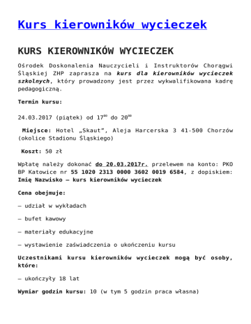 Kurs kierowników wycieczek KURS KIEROWNIKÓW WYCIECZEK Ośrodek Doskonalenia Nauczycieli i Instruktorów Chorągwi Śląskiej ZHP zaprasza na kurs dla kierowników wycieczek szkolnych, który prowadzony jest przez wykwalifikowana kadrę pedagogiczną. Termin kursu: 24.03.2017 (piątek) od 1700 do 2000 Miejsce: Hotel „Skaut”, Aleja Harcerska 3 41-500 Chorzów (okolice Stadionu Śląskiego) Koszt: 50 zł Wpłatę należy dokonać do 20.03.2017r. przelewem na konto: PKO BP Katowice nr 55 1020 2313 0000 3602 0019 6584, z dopiskiem: Imię Nazwisko – kurs kierowników wycieczek Cena obejmuje: – udział w wykładach – bufet kawowy – materiały edukacyjne – wystawienie zaświadczenia o ukończeniu kursu Uczestnikami kursu kierowników wycieczek mogą być osoby, które: – ukończyły 18 lat Wymiar godzin kursu: 10 (w tym 5 godzin praca własna) Zgłoszenia: do 18.03.2017r. Telefon: 32 2586 996 Szczegółowych informacji udziela Barbara Juskowiak, Formularz zgłoszeniowy www: https://5sz56avsaldmfxoxl9fgylp6t.zgloszenia24.pl