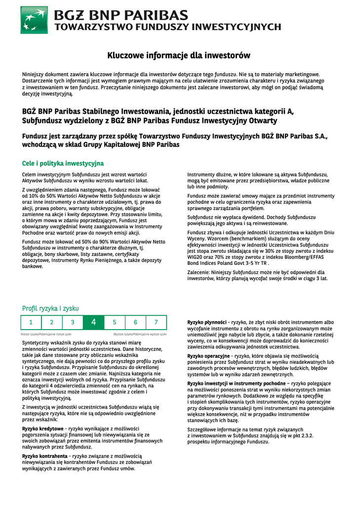 Kluczowe informacje dla inwestorów Niniejszy dokument zawiera kluczowe informacje dla inwestorów dotyczące tego funduszu. Nie są to materiały marketingowe. Dostarczenie tych informacji jest wymogiem prawnym mającym na celu ułatwienie zrozumienia charakteru i ryzyka związanego z inwestowaniem w ten fundusz. Przeczytanie niniejszego dokumentu jest zalecane inwestorowi, aby mógł on podjąć świadomą decyzję inwestycyjną. BGŻ BNP Paribas Stabilnego Inwestowania, jednostki uczestnictwa kategorii A, Subfundusz wydzielony z BGŻ BNP Paribas Fundusz Inwestycyjny Otwarty Fundusz jest zarządzany przez spółkę Towarzystwo Funduszy Inwestycyjnych BGŻ BNP Paribas S.A., wchodzącą w skład Grupy Kapitałowej BNP Paribas Cele i polityka inwestycyjna Celem inwestycyjnym Subfunduszu jest wzrost wartości Aktywów Subfunduszu w wyniku wzrostu wartości lokat. Z uwzględnieniem zdania następnego, Fundusz może lokować od 10% do 50% Wartości Aktywów Netto Subfunduszu w akcje oraz inne instrumenty o charakterze udziałowym, tj. prawa do akcji, prawa poboru, warranty subskrypcyjne, obligacje zamienne na akcje i kwity depozytowe. Przy stosowaniu limitu, o którym mowa w zdaniu poprzedzającym, Fundusz jest obowiązany uwzględniać kwotę zaangażowania w Instrumenty Pochodne oraz wartość praw do nowych emisji akcji. Fundusz może lokować od 50% do 90% Wartości Aktywów Netto Subfunduszu w instrumenty o charakterze dłużnym, tj. obligacje, bony skarbowe, listy zastawne, certyfikaty depozytowe, Instrumenty Rynku Pieniężnego, a także depozyty bankowe. Instrumenty dłużne, w które lokowane są aktywa Subfunduszu, mogą być emitowane przez przedsiębiorstwa, władze publiczne lub inne podmioty. Fundusz może zawierać umowy mające za przedmiot instrumenty pochodne w celu ograniczenia ryzyka oraz zapewnienia sprawnego zarządzania portfelem. Subfundusz nie wypłaca dywidend. Dochody Subfunduszu powiększają jego aktywa i są reinwestowane. Fundusz zbywa i odkupuje Jednostki Uczestnictwa w każdym Dniu Wyceny. Wzorcem (benchmarkiem) służącym do oceny efektywności inwestycji w Jednostki Uczestnictwa Subfunduszu jest stopa zwrotu składająca się w 30% ze stopy zwrotu z indeksu WIG20 oraz 70% ze stopy zwrotu z indeksu Bloomberg/EFFAS Bond Indices Poland Govt 3-5 Yr TR . Zalecenie: Niniejszy Subfundusz może nie być odpowiedni dla inwestorów, którzy planują wycofać swoje środki w ciągu 3 lat. Profil ryzyka i zysku 1 2 3 Niższe ryzyko/Potencjalnie niższe zyski 4 5 6 7 Wyższe ryzyko/Potencjalnie wyższe zyski Syntetyczny wskaźnik zysku do ryzyka stanowi miarę zmienności wartości jednostki uczestnictwa. Dane historyczne, takie jak dane stosowane przy obliczaniu wskaźnika syntetycznego, nie dają pewności co do przyszłego profilu zysku i ryzyka Subfunduszu. Przypisanie Subfunduszu do określonej kategorii może z czasem ulec zmianie. Najniższa kategoria nie oznacza inwestycji wolnych od ryzyka. Przypisanie Subfunduszu do kategorii 4 odzwierciedla zmienność cen na rynkach, na których Subfundusz może inwestować zgodnie z celem i polityką inwestycyjną. Z inwestycją w jednostki uczestnictwa Subfunduszu wiążą się następujące ryzyka, które nie są odpowiednio uwzględnione przez wskaźnik: Ryzyko kredytowe - ryzyko wynikające z możliwości pogorszenia sytuacji finansowej lub niewywiązania się ze swoich zobowiązań przez emitenta instrumentów finansowych nabywanych przez Subfundusz. Ryzyko płynności - ryzyko, że zbyt niski obrót instrumentem albo wycofanie instrumentu z obrotu na rynku zorganizowanym może uniemożliwić jego nabycie lub zbycie, a także dokonanie rzetelnej wyceny, co w konsekwencji może doprowadzić do konieczności zawieszenia odkupywania jednostek uczestnictwa. Ryzyko operacyjne - ryzyko, które objawia się możliwością poniesienia przez Subfundusz strat w wyniku nieadekwatnych lub zawodnych procesów wewnętrznych, błędów ludzkich, błędów systemów lub w wyniku zdarzeń zewnętrznych. Ryzyko inwestycji w instrumenty pochodne – ryzyko polegające na możliwości ponoszenia strat w wyniku niekorzystnych zmian parametrów rynkowych. Dodatkowo ze względu na specyfikę i stopień skomplikowania tych instrumentów, ryzyko operacyjne przy dokonywaniu transakcji tymi instrumentami ma potencjalnie większe konsekwencje, niż w przypadku instrumentów stanowiących ich bazę. Szczegółowe informacje na temat ryzyk związanych z inwestowaniem w Subfundusz znajdują się w pkt 2.3.2. prospektu informacyjnego Funduszu. Ryzyko kontrahenta - ryzyko związane z możliwością niewywiązania się kontrahentów Funduszu ze zobowiązań wynikających z zawieranych przez Fundusz umów. Dokument pobrano z mojeFundusze.pl Opłaty Opłaty jednorazowe pobierane przed lub po dokonaniu inwestycji Opłata za nabycie 4,00% Jest to maksymalna kwota, jaka może zostać pobrana z Państwa środków przed zainwestowaniem Opłata za odkupienie 0,00% Jest to maksymalna kwota, jaka może zostać pobrana z Państwa środków przed wypłaceniem środków z inwestycji Opłaty pobierane z Subfunduszu w ciągu roku Opłaty bieżące 3,40% Opłaty pobierane z Subfunduszu w określonych warunkach szczególnych Opłaty za wyniki 0,00% Opłaty ponoszone przez inwestora służą pokryciu kosztów działania Subfunduszu, w tym kosztów dystrybucji i wprowadzenia do obrotu. Opłaty te zmniejszają potencjalny wzrost z inwestycji w Subfundusz. Wszystkie opłaty podawane są w wysokości maksymalnej. W niektórych przypadkach inwestor może płacić niższą opłatę. Informacje dotyczące bieżącej wysokości opłat można uzyskać w placówkach dystrybutorów oraz w TFI BGŻ BNP Paribas S.A. Z uwagi, iż Subfundusz prowadzi działalność przez okres nieprzekraczający jednego roku kalendarzowego, podana kwota opłat bieżących ma charakter szacunkowy. Roczne sprawozdanie Funduszu za każdy rok obrotowy będzie zawierało szczegółowe informacje dotycząc
