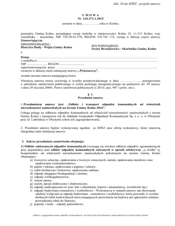 Zał. 10 do SIWZ - projekt umowy UMOWA Nr GO.271.1.2015 zawarta w dniu……………. roku w Kolnie, pomiędzy Gminą Kolno, posiadającą swoją siedzibę w miejscowości: Kolno 33, 11-311 Kolno, woj. warmińsko – mazurskie, NIP 739-38-41-578, REGON 510 743 172, zwaną w dalszej części umowy Zamawiającym, reprezentowaną przez : przy kontrasygnacie: Henryka Dudę - Wójta Gminy Kolno Iwony Brzuśkiewicz - Skarbnika Gminy Kolno a firmą: ………………………………………………………………………………………………………. z siedzibą w.…………………………………………………………………………………………………. NIP ......................... REGON ............................., reprezentowaną/ym przez ………………………………………………………………………………... zwanym w dalszej części niniejszej umowy „Wykonawcą”, została zawarta umowa następującej treści: Niniejszą umowę strony zawierają w wyniku przeprowadzonego w dniu ……………….. postępowania o udzielenie zamówienia publicznego w trybie przetargu nieograniczonego na podstawie art. 39 ustawy z dnia 29 stycznia 2004r. Prawo zamówień publicznych (z 2013r, poz. 907 z późn. zm.). § 1. Przedmiot umowy 1. Przedmiotem umowy jest: „Odbiór i transport odpadów komunalnych od właścicieli nieruchomości zamieszkałych na terenie Gminy Kolno 2016”. Usługa polega na odbiorze odpadów komunalnych od właścicieli nieruchomości zamieszkałych z terenu Gminy Kolno i transporcie ich do Zakładu Gospodarki Odpadami Komunalnymi Sp. z o. o. w Olsztynie przy ul. Lubelskiej w Olsztynie celem ich zagospodarowania. 2. Przedmiot umowy będzie wykonywany zgodnie ze SIWZ oraz ofertą wykonawcy, które stanowią integralną część niniejszej umowy. 3. Zakres przedmiotu zamówienia obejmuje: 1) Odbiór zmieszanych odpadów komunalnych (wymaga się również odbioru odpadów zgromadzonych przy pojemniku) oraz odbiór odpadów komunalnych zebranych w sposób selektywny „u źródła” tj. bezpośrednio od właścicieli nieruchomości zamieszkałych położonych na terenie Gminy Kolno obejmujący: a) tworzywa sztuczne, opakowania z tworzyw sztucznych, metale, opakowania metalowe oraz opakowania wielomateriałowe; b) papier i tektura, opakowania z papieru i tektury; c) szkło bezbarwne i kolorowe, opakowania szklane; d) odpady ulegające biodegradacji i zielone; e) odpady wielkogabarytowe; f) zużyte opony; g) zużyty sprzęt elektryczny i elektroniczny; h) odpady niebezpieczne (w tym: leki i chemikalia, baterie i akumulatory, świetlówki itp.) i) odpady budowlano-remontowe i rozbiórkowe - Wykonawca w ramach umowy ma obowiązek odebrać wyłącznie te odpady budowlano - remontowe i rozbiórkowe, które powstały w wyniku drobnych robót budowlanych niewymagających pozwolenia na budowę ani zgłoszenia zamiaru prowadzenia robót do Starosty; j) popioły i żużle – odpady paleniskowe. „Odbiór i zagospodarowaniu odpadów komunalnych od właścicieli nieruchomości zamieszkałych na terenie Gminy Kolno” Odpady komunalne zbierane i gromadzone będą w następujący sposób: a) zmieszane odpady w pojemnikach o pojemności od 110 l do 1100 l; b) selektywnie zbierane odpady (tj.: papier i tektura, opakowania z papieru i tektury; tworzywa sztuczne, opakowania z tworzyw sztucznych, metale, opakowania metalowe i opakowania wielomateriałowe; szkło, opakowania szklane; odpady ulegające biodegradacji i zielone): – w zabudowie wielorodzinnej – pojemniki o pojemności 1100 l – w zabudowie jednorodzinnej i zagrodowej – worki z folii polietylenowej LDPE o odpowiedniej grubości zapewniającej ich wytrzymałość i pojemności 120 l, dostosowując pojemność worków proporcjonalnie do ilości wytwarzanych odpadów danej frakcji. Selektywnie zebrane odpady paleniskowe tj. popioły i żużle zbierane będą w oddzielnych pojemnikach (które zapewni Wykonawca) o pojemności 1100 l zlokalizowanych w zabudowie wielorodzinnej w sezonie grzewczym od października do kwietnia. Nie przewiduje się gromadzenia popiołów i żużli w workach. Po sezonie grzewczym Wykonawca zabierze pojemniki przeznaczone na popioły i żużle Odpady wielkogabarytowe, zużyte opony, zużyty sprzęt elektryczny i elektroniczny, odpady niebezpieczne (w tym: leki i chemikalia, baterie i akumulatory, świetlówki itp.) oraz odpady budowlano-remontowe i rozbiórkowe będą odbierane z miejsc posadowienia pojemników na odpady komunalne. 2) Dostarczanie oraz sukcesywne uzupełnianie w zabudowie jednorodzinnej i zagrodowej worków do selektywnej zbiórki odpadów komunalnych w kolorach: a) niebieski z przeznaczeniem na papier i tekturę, opakowania z papieru i tektury; b) żółty z przeznaczeniem na tworzywa sztuczne, opakowania z tworzyw sztucznych, metale, opakowania metalowe i opakowania wielomateriałowe; c) biały z przeznaczeniem na szkło, opakowania szklane; d) zielony z przeznaczeniem na odpady ulegające biodegradacji i zielone. Pierwszy komplet worków Wykonawca dostarczy właścicielom nieruchomości po podpisaniu umowy z Zamawiającym i przed rozpoczęciem realizacji odbioru odpadów wynikającego z harmonogramu. W trakcie odbioru worków do selektywnej zbiórki z terenu nieruchomości, Wykonawca będzie zostawiał właścicielowi nieruchomości w zamian taką ilość worków i w takich kolorach w jakich zostały wystawione lub większą ilość na prośbę właściciela nieruchomości. 3) Wyposażenie nieruchomości w zabudowie wielorodzinnej (co najmniej 5 lokali mieszkalnych bądź zespół takich budynków) w ramach umowy w pojemniki do zbiórki i gromadzenia odpadów komunalnych selektywnie zbieranych (w tym również do zbiórki odpadów paleniskowych tj. popiołów i żużli) oraz zmieszanych. Ilość i pojemność pojemników ma być dostosowana do liczby obsługiwanych mieszkańców, harmonogramu częstotliwości ich opróżnian