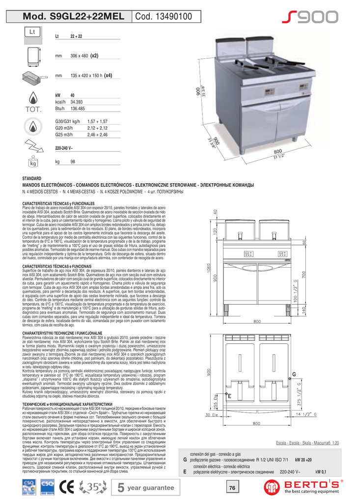 Mod. S9GL22+22MEL TOT. 22 + 22 mm 306 x 460 (x2) mm 135 x 420 x 150 h (x4) kW kcal/h Btu/h 40 34.393 136.485 G30/G31 kg/h G20 m3/h G25 m3/h 900 35 3/8” Lt Cod. 13490100 1,57 + 1,57 2,12 + 2,12 2,46 + 2,46 35 900/8” 3 220-240 V~ 800 2” kg 31 1/ 98 STANDARD MANDOS ELECTRÓNICOS - COMANDOS ELECTRÓNICOS - ELEKTRONICZNE STEROWANIE - ЭЛЕКТРОННЫЕ КОМАНДЫ N. 4 MEDIOS CESTOS - N. 4 MEIAS-CESTAS - N. 4 KOSZE POŁÓWKOWE - 4 шт. ПОЛУКОРЗИНЫ CARACTERÍSTICAS TÉCNICAS y FUNCIONALES Plano de trabajo de acero inoxidable AISI 304 con espesor 20/10, paneles frontales y laterales de acero inoxidable AISI 304, acabado Scotch Brite. Quemadores de acero inoxidable de sección ovalada de nido de abeja. Intercambiadores de calor de sección ovalada de gran superficie, colocados directamente en el interior de la cuba, para un calentamiento rápido y homogéneo. Llama piloto y válvula de seguridad de termopar. Cuba de acero inoxidable AISI 304 con amplios bordes redondeados y amplia zona fría, debajo de los quemadores, para la sedimentación de los residuos. El plano, de bordes redondeados, incorpora una superficie para el apoyo de los cestos ligeramente inclinada que favorece la descarga del aceite. Control de la temperatura por medio de centralita electrónica con las siguientes funciones. control de la temperatura de 0°C a 190°C, visualización de la temperatura programada y de la de trabajo, programa de “melting” y de mantenimiento a 100°C para el uso de grasas sólidas de fritura, autodiagnosis para posibles anomalías. Termostato de seguridad de rearme manual. Dos cubas con mandos separados para una regulación independiente y óptima de la temperatura. Grifo de descarga de esfera, situado dentro del hueco, controlado por una manija con empuñadura atérmica, con contenedor de recogida de acero. CARACTERÍSTICAS TÉCNICAS e FUNCIONAIS Superfície de trabalho de aço inox AISI 304, de espessura 20/10, painéis dianteiros e laterais de aço inox AISI 304, com acabamento Scotch Brite. Queimadores de aço inox com secção oval com estrutura alveolar. Permutadores de calor com secção oval de grande superfície, colocados directamente no interior da cuba, para garantir um aquecimento rápido e homogéneo. Chama piloto e válvula de segurança com termopar. Cuba de aço inox AISI 304 com amplas bordas arredondadas e ampla área fria, sob os queimadores, para permitir a decantação dos resíduos. A superfície, que tem bordas arredondadas, é equipada com uma superfície de apoio das cestas levemente inclinada, que favorece a descarga do óleo. Controle da temperatura mediante central electrónica com as seguintes funções: controle da temperatura, de 0°C a 190°C, visualização da temperatura programada e da temperatura de exercício, programa de “melting” e de manutenção a 100°C para a utilização de gorduras sólidas de fritura, autodiagnóstico para eventuais anomalias. Termostato de segurança com accionamento manual. Duas cubas com comandos separados, para uma regulação independente e ideal da temperatura. Torneira de descarga de esfera, localizada dentro do vão, comandada por pega com puxador com isolamento térmico, com caixa de recolha de aço. CHARAKTERYSTYKI TECHNICZNE I FUNKCJONALNE Powierzchnia robocza ze stali nierdzewnej inox AISI 304 o grubości 20/10, panele przednie i boczne ze stali nierdzewnej inox AISI 304, wykończenie typu Scotch Brite. Palniki ze stali nierdzewnej inox w formie plastra miodu. Wymienniki ciepła o owalnym przekroju i dużej powierzchni, umieszczone bezpośrednio wewnątrz zbiornika zapewniają szybkie i jednolite podgrzewanie. Płomień pilotujący oraz zawόr awaryjny z termoparą Zbiornik ze stali nierdzewnej inox AISI 304 o szerokich zaokrąglonych narożnikach oraz szerokiej strefie chłodnej, pod palnikami, do dekantacji pozostałości. Płaszczyzna z zaokrąglonymi obrzeżami zawiera w sobie powierzchnię dla opierania koszy, która jest lekko nachylona w celu łatwiejszego odpływu oleju. Kontrola temperatury za pomocą centralki elektronicznej posiadającej następujące funkcje: kontrola temperatury w zakresie od 0°C do 190°C, wizualizacja temperatury ustawionej i roboczej, program „stapiania” i utrzymywania 100°C dla stałych tłuszczy używanych do smażenia, autodiagnostyka ewentualnych anomalii. Termostat awaryjny uzbrajany ręcznie. Dwa osobne zbiorniki z oddzielnymi poleceniami, zapewniające niezależną i optymalną regulację temperatury. Kulowy kranik odprowadzający, umieszczony wewnątrz zbiornika, sterowany za pomocą rączki z obudową odporną na ciepło, stalowa miseczka zbiorcza. ТЕХНИЧЕСКИЕ и ФУНКЦИОНАЛЬНЫЕ ХАРАКТЕРИСТИКИ Рабочая поверхность из нержавеющей стали AISI 304 толщиной 20/10, передние и боковые панели из нержавеющей стали AISI 304 с отделкой «Скотч Брайт». Трубчатые горелки из нержавеющей стали овального сечения в форме пчелиных сот. Теплообменники овального сечения с большой поверхностью, расположенные непосредственно в емкости, для обеспечения быстрого и однородного разогрева. Запальная горелка и предохранительный клапан с термопарой. Емкость из нержавеющей стали AISI 304 с широкими закругленными бортами и широкой холодной зоной, расположенная под горелками, для сбора остатков продуктов. Поверхность с закругленными бортами включает панель для установки корзин, имеющую легкий нак