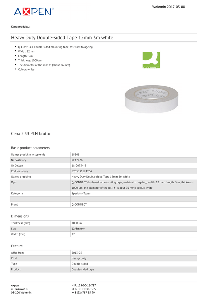 Wołomin 2017-03-08 Karta produktu: Heavy Duty Double-sided Tape 12mm 3m white Q-CONNECT double-sided mounting tape, resistant to ageing Width: 12 mm Length: 3 m Thickness: 1000 μm The diameter of the roll: 3'' (about 76 mm) Colour: white Cena 2,53 PLN brutto Basic product parameters Numer produktu w systemie 18541 Nr dostawcy KF17476 Nr Celcen 18-00734-3 Kod kreskowy 5705831174764 Nazwa produktu Heavy Duty Double-sided Tape 12mm 3m white Opis Q-CONNECT double-sided mounting tape, resistant to ageing; width: 12 mm; length: 3 m; thickness: 1000 μm; the diameter of the roll: 3'' (about 76 mm); colour: white Kategoria Specialty Tapes Brand Q-CONNECT Dimensions Thickness (mm) 1000μm Size 12/3mm/m Width (mm) 12 Feature Offer from 2013-05 Kind Heavy- duty Type Double-sided Product Double-sided tape Axpen ul. Laskowa 4 05-200 Wołomin NIP: 125-00-16-787 REGON: 010346305 +48 (22) 787 55 99 Wołomin 2017-03-08 Karta katalogowa produktu cd. Heavy Duty Double-sided Tape 12mm 3m white Material Foam Procurement vocabulary CPV 44424200-0 Certifications Hit Hit New product Standard Colour Colour White Pozostałe zdjęcia produktu Serdecznie zapraszamy do współpracy Axpen zespół. Axpen ul. Laskowa 4 05-200 Wołomin NIP: 125-00-16-787 REGON: 010346305 +48 (22) 787 55 99