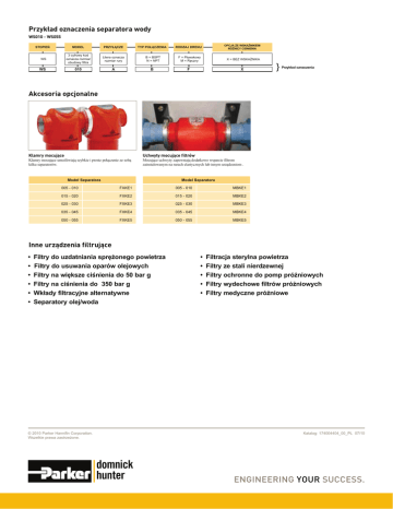 Przykład oznaczenia separatora wody WS010 - WS055 6723,(ē 02'(/ 35=<àĄ&=( :6 F\IURZ\NRG R]QDF]DUR]PLDU REXGRZ\ILOWUD /LWHUDR]QDF]D UR]PLDUUXU\ :6 $ 7<332àĄ&=(1,$ % %637 1 137 % 52'=$-'5(18 ) 3á\ZDNRZ\ 0 5ĊF]Q\ ) 23&-$=(:6.$ħ1,.,(0 5Ïĩ1,&<&,ĝ1,(1,$ ; %(=:6.$ħ1,.$ ; ` 3U]\NáDGR]QDF]HQLD Akcesoria opcjonalne Klamry mocujące .ODPU\PRFXMąFHXPRĪOLZLDMąV]\ENLHLSURVWHSRáąF]HQLH]HVREą NLONXVHSDUDWRUyZ Uchwyty mocujące filtrów 0RFXMąFHXFKZ\W\]DSHZQLDMąGRGDWNRZHZVSDUFLHILOWURP ]DLQVWDORZDQ\PQDUXUDFKHODVW\F]Q\FKOXELQQ\PXU]ąG]HQLRP 0RGHO6HSDUDWRUD 0RGHO6HSDUDWRUD );.( 0%.( );.( 0%.( );.( 0%.( );.( 0%.( );.( 0%.( Inne urządzenia filtrujące )LOWU\GRX]GDWQLDQLDVSUĊĪRQHJRSRZLHWU]D )LOWU\GRXVXZDQLDRSDUyZROHMRZ\FK )LOWU\QDZLĊNV]HFLĞQLHQLDGREDUJ )LOWU\QDFLĞQLHQLDGREDUJ :NáDG\ILOWUDF\MQHDOWHUQDW\ZQH 6HSDUDWRU\ROHMZRGD 3DUNHU+DQQLILQ&RUSRUDWLRQ :V]HONLHSUDZD]DVWU]HĪRQH )LOWUDFMDVWHU\OQDSRZLHWU]D )LOWU\]HVWDOLQLHUG]HZQHM )LOWU\RFKURQQHGRSRPSSUyĪQLRZ\FK )LOWU\Z\GHFKRZHILOWUyZSUyĪQLRZ\FK )LOWU\PHG\F]QHSUyĪQLRZH .DWDORJBB3/ ENGINEERING YOUR SUCCESS.