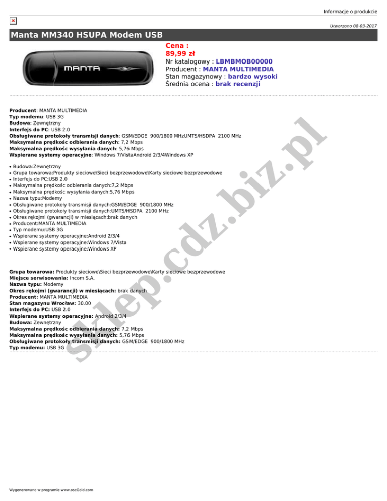Informacje o produkcie Utworzono 08-03-2017 Manta MM340 HSUPA Modem USB Cena : 89,99 zł ● ● ● ● ● ● ● ● ● ● ● .c ● Budowa:Zewnętrzny Grupa towarowa:Produkty sieciowe\Sieci bezprzewodowe\Karty sieciowe bezprzewodowe Interfejs do PC:USB 2.0 Maksymalna prędkośc odbierania danych:7,2 Mbps Maksymalna prędkośc wysyłania danych:5,76 Mbps Nazwa typu:Modemy Obsługiwane protokoły transmisji danych:GSM/EDGE 900/1800 MHz Obsługiwane protokoły transmisji danych:UMTS/HSDPA 2100 MHz Okres rękojmi (gwarancji) w miesiącach:brak danych Producent:MANTA MULTIMEDIA Typ modemu:USB 3G Wspierane systemy operacyjne:Android 2/3/4 Wspierane systemy operacyjne:Windows 7/Vista Wspierane systemy operacyjne:Windows XP .b ● dz ● iz .p Producent: MANTA MULTIMEDIA Typ modemu: USB 3G Budowa: Zewnętrzny Interfejs do PC: USB 2.0 Obsługiwane protokoły transmisji danych: GSM/EDGE 900/1800 MHzUMTS/HSDPA 2100 MHz Maksymalna prędkośc odbierania danych: 7,2 Mbps Maksymalna prędkośc wysyłania danych: 5,76 Mbps Wspierane systemy operacyjne: Windows 7/VistaAndroid 2/3/4Windows XP l Nr katalogowy : LBMBMOB00000 Producent : MANTA MULTIMEDIA Stan magazynowy : bardzo wysoki Średnia ocena : brak recenzji sk le p Grupa towarowa: Produkty sieciowe\Sieci bezprzewodowe\Karty sieciowe bezprzewodowe Miejsce serwisowania: Incom S.A. Nazwa typu: Modemy Okres rękojmi (gwarancji) w miesiącach: brak danych Producent: MANTA MULTIMEDIA Stan magazynu Wrocław: 30.00 Interfejs do PC: USB 2.0 Wspierane systemy operacyjne: Android 2/3/4 Budowa: Zewnętrzny Maksymalna prędkośc odbierania danych: 7,2 Mbps Maksymalna prędkośc wysyłania danych: 5,76 Mbps Obsługiwane protokoły transmisji danych: GSM/EDGE 900/1800 MHz Typ modemu: USB 3G Wygenerowano w programie www.oscGold.com