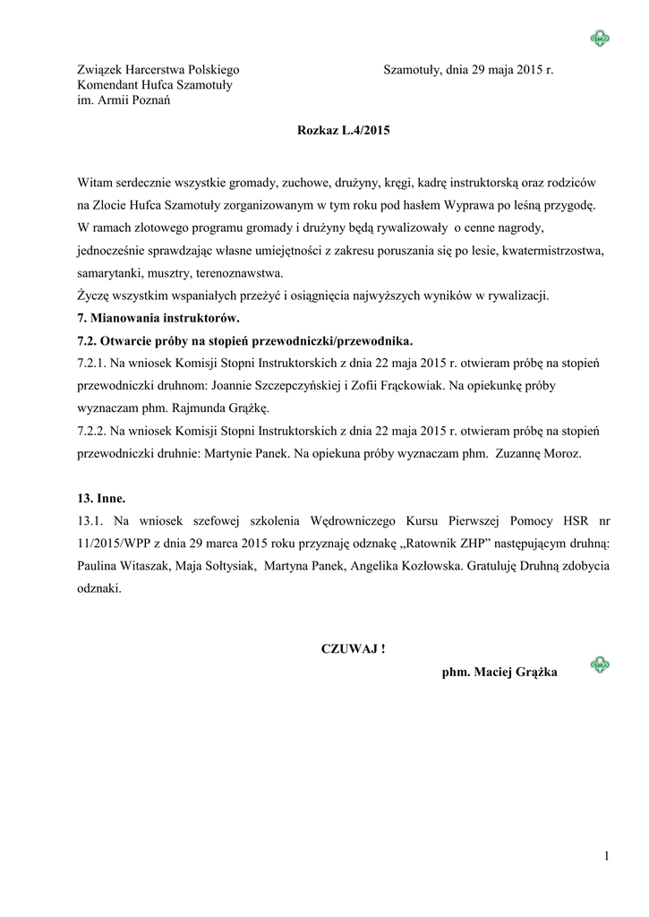 Związek Harcerstwa Polskiego Komendant Hufca Szamotuły im. Armii Poznań Szamotuły, dnia 29 maja 2015 r. Rozkaz L.4/2015 Witam serdecznie wszystkie gromady, zuchowe, drużyny, kręgi, kadrę instruktorską oraz rodziców na Zlocie Hufca Szamotuły zorganizowanym w tym roku pod hasłem Wyprawa po leśną przygodę. W ramach zlotowego programu gromady i drużyny będą rywalizowały o cenne nagrody, jednocześnie sprawdzając własne umiejętności z zakresu poruszania się po lesie, kwatermistrzostwa, samarytanki, musztry, terenoznawstwa. Życzę wszystkim wspaniałych przeżyć i osiągnięcia najwyższych wyników w rywalizacji. 7. Mianowania instruktorów. 7.2. Otwarcie próby na stopień przewodniczki/przewodnika. 7.2.1. Na wniosek Komisji Stopni Instruktorskich z dnia 22 maja 2015 r. otwieram próbę na stopień przewodniczki druhnom: Joannie Szczepczyńskiej i Zofii Frąckowiak. Na opiekunkę próby wyznaczam phm. Rajmunda Grążkę. 7.2.2. Na wniosek Komisji Stopni Instruktorskich z dnia 22 maja 2015 r. otwieram próbę na stopień przewodniczki druhnie: Martynie Panek. Na opiekuna próby wyznaczam phm. Zuzannę Moroz. 13. Inne. 13.1. Na wniosek szefowej szkolenia Wędrowniczego Kursu Pierwszej Pomocy HSR nr 11/2015/WPP z dnia 29 marca 2015 roku przyznaję odznakę „Ratownik ZHP” następującym druhną: Paulina Witaszak, Maja Sołtysiak, Martyna Panek, Angelika Kozłowska. Gratuluję Druhną zdobycia odznaki. CZUWAJ ! phm. Maciej Grążka 1