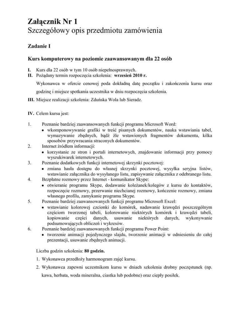 Załącznik Nr 1 Szczegółowy opis przedmiotu zamówienia Zadanie I Kurs komputerowy na poziomie zaawansowanym dla 22 osób I. Kurs dla 22 osób w tym 10 osób niepełnosprawnych. II. Pożądany termin rozpoczęcia szkolenia: wrzesień 2010 r. Wykonawca w ofercie cenowej poda dokładną datę początku i zakończenia kursu oraz godzinę i miejsce spotkania uczestnika w dniu rozpoczęcia szkolenia. III. Miejsce realizacji szkolenia: Zduńska Wola lub Sieradz. IV. Celem kursu jest: 1. 2. 3. 4. 5. 6. Poznanie bardziej zaawansowanych funkcji programu Microsoft Word: wkomponowywanie grafiki w treść pisanych dokumentów, nauka wstawiania tabel, wymazywanie zbędnych, bądź źle wstawionych fragmentów dokumentu, kilka sposobów przywracania straconych dokumentów. Internet źródłem informacji: korzystanie ze stron i portali internetowych, znajdowanie informacji przy pomocy wyszukiwarek internetowych. Poznanie dodatkowych funkcji internetowej skrzynki pocztowej: zmiana hasła dostępu do własnej skrzynki pocztowej, wysyłka seryjna listów, wstawianie załącznika do wysyłanego listu, zapisywanie załącznika z odebranego listu. Bezpłatne rozmowy przez Internet - komunikator Skype: otwieranie programu Skype, dodawanie koleżanek/kolegów z kursu do kontaktów, rozpoczęcie rozmowy, przerwanie niechcianej rozmowy, kończenie rozmowy, zmiana własnego profilu, zamykanie programu Skype. Poznanie bardziej zaawansowanych funkcji programu Microsoft Excel: wstawianie kolorowej czcionki do komórek, nadawanie krawędzi poszczególnym częściom tworzonej tabeli, kolorowanie niektórych komórek i krawędzi tabeli, kopiowanie części danych, usuwanie niektórych danych, wykonywanie podsumowujących obliczeń i wykresów. Poznanie bardziej zaawansowanych funkcji programu Power Point: tworzenie animacji pojedynczego slajdu, tworzenie animacji w odniesieniu do całej prezentacji, usuwanie zbędnych animacji. Liczba godzin szkolenia: 80 godzin. 1. Wykonawca przedłoży harmonogram zajęć kursu. 2. Wykonawca zapewni uczestnikom kursu w dniach szkolenia drobny poczęstunek (np. kawa, herbata, woda mineralna, ciastka lub podobne) oraz ciepły posiłek. 3. W przypadku organizacji szkolenia w Sieradzu wykonawca zapewni uczestnikom kursu dowóz na szkolenia. 4. Wykonawca ma obowiązek ubezpieczyć uczestników szkolenia od następstw nieszczęśliwych wypadków. Koszt ubezpieczenia NW należy ująć w koszcie kursu. 5. Wykonawca w uzgodnieniu z Zamawiającym, wystawi uczestnikowi kursu zaświadczenia (certyfikaty) o uczestnictwie w szkoleniu oraz o uzyskaniu kwalifikacji z logo Unii Europejskiej, EFS, Wojewódzkiego Urzędu Pracy w Łodzi, nazwą realizatora, tytułem projektu i nazwą programu. Wykonawca w ten sam sposób oznaczy także sale, gdzie będą się odbywały zajęcia. 6. Uczestnik, który zda egzamin/egzaminy otrzyma zaświadczenie (certyfikat). Szczegółowych informacji w tej sprawie po stronie Zamawiającego udzieli koordynator projektu P. Joanna Grabowska, tel. 661180001. V. Wymagania 1. Wymagane jest, aby każdy uczestnik kursu posiadał swoje stanowisko komputerowe z dostępem do Internetu (1 osoba – 1 komputer) oraz 2 stanowiska rezerwowe z dostępem do Internetu. 2. Wymagane jest, aby sale, w których odbywać się będą szkolenia były dostosowane do potrzeb osób niepełnosprawnych uczestniczących w kursie. Zadanie II Kurs komputerowy niepełnosprawnych I. na poziomie podstawowym dla 10 osób Kurs dla 10 osób niepełnosprawnych. II. Pożądany termin rozpoczęcia szkolenia: wrzesień 2010 r. Wykonawca w ofercie cenowej poda dokładną datę początku i zakończenia kursu oraz godzinę i miejsce spotkania uczestnika w dniu rozpoczęcia szkolenia. III. Miejsce realizacji szkolenia: Zduńska Wola lub Sieradz. IV. Celem kursu jest: 1. Nauka podstaw obsługi komputera: włączanie i wyłączanie stacji roboczej, posługiwanie się myszą, posługiwanie się klawiaturą, nauka korzystania z napędów CD, DVD i FDD (ang.: floppy disk drive). 2. Zapoznanie się z programem Microsoft Word: sporządzanie podstawowych dokumentów, nauka korzystania z kreatora zawartości. 3. Omówienie podstaw dotyczących Internetu: poruszanie się po Internecie (strony i portale internetowe), poszukiwanie informacji (wyszukiwarki internetowe), wiarygodne źródła informacji (strony i portale edukacyjne, rządowe itp.). 4. Nauka posługiwania się internetową skrzynką pocztową: wysyłanie listów, odbieranie listów, zakładanie własnej skrzynki pocztowej w Internecie. 5. Bezpłatne rozmowy przez Internet - komunikator Gadu-Gadu: otwieranie programu Gadu-Gadu, dodawanie koleżanek/kolegów z kursu do kontaktów, rozpoczęcie rozmowy, przerwanie niechcianej rozmowy, kończenie rozmowy, zamykanie programu Gadu-Gadu. 6. Zapoznanie się z programem Microsoft Excel: wprowadzanie danych do komórek, nadawanie krawędzi tworzonej tabeli, kolorowanie komórek i krawędzi tabeli, kopiowanie danych, usuwanie danych, wykonywanie podstawowych obliczeń matematycznych. 7. Zapoznanie się z programem Power Point: otwieranie nowej prezentacji, dodawanie stron do prezentacji, usuwanie stron z prezentacji, stworzenie prezentacji na swój temat (własnej wizytówki). Liczba godzin szkolenia: 60 godzin. 1. Wykonawca przedłoży harmonogram zajęć kursu. 2. Wykonawca zapewni uczestnikom kursu w dniach szkolenia drobny poczęstunek (np. kawa, herbata, woda mineralna, ciastka lub podobne) oraz ciepły posiłek. 3. W przypadku organizacji szkolenia w Sieradzu wykonawca zapewni uczestnikom kursu dowóz na szkolenia. 4. Wykonawca ma obowiązek ubezpieczyć uczestników szkolenia od następstw nieszczęśliwych wypadków. Koszt ubezpieczenia NW należy ująć w koszcie kursu. 5. Wykonawca w uzgodnieniu z Zamawiającym, wystawi uczestnikowi kursu zaświadczenia (certyfikaty) o uczestnictwie w szkoleniu oraz o uzyskaniu kwalifikacji z logo Unii Europejskiej, EFS, Wojewódzkiego Urzędu Pracy w Łodzi, nazwą realizatora, t
