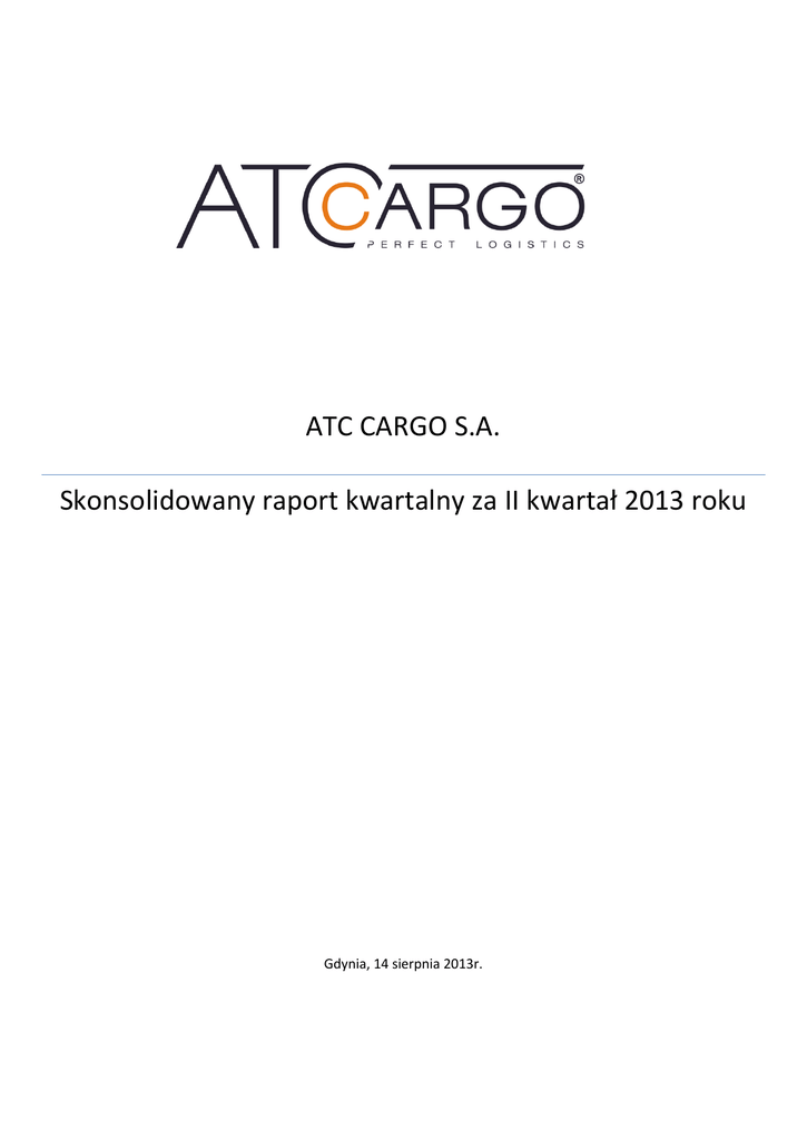 ATC CARGO S.A. Skonsolidowany raport kwartalny za II kwartał 2013 roku Gdynia, 14 sierpnia 2013r. Skonsolidowany raport kwartalny ATC CARGO S.A. za II kwartał 2013 roku SPIS TREŚCI 1. Skonsolidowany raport kwartalny Grupy Kapitałowej ATC CARGO S.A. – wprowadzenie ..................................... 3 2. Wybrane dane finansowe ze skonsolidowanego bilansu oraz rachunku zysków i strat za II kwartał 2013r. wraz z okresami porównywalnymi ............................................................................................................................................... 5 3. Opis czynników i zdarzeń mających wpływ na osiągnięte wyniki finansowe oraz opis aktywności podjętej w obszarze rozwoju prowadzonej działalności wraz z komentarzem Zarządu Emitenta ................................................................... 6 4. Stanowisko Zarządu odnośnie możliwości zrealizowania podanych do publicznej wiadomości prognoz wyników na rok 2013 w świetle danych finansowych zaprezentowanych w raporcie kwartalnym za II kwartał 2013 roku .................... 9 5. Najważniejsze cele Grupy na rok 2013 ..................................................................................................................... 9 www.atc-cargo.pl 2|Strona Skonsolidowany raport kwartalny ATC CARGO S.A. za II kwartał 2013 roku 1. Skonsolidowany raport kwartalny Grupy Kapitałowej ATC CARGO S.A. – wprowadzenie Grupa Kapitałowa ATC CARGO S.A. („Grupa ATC”) funkcjonuje na szeroko rozumianym rynku transportu, spedycji i logistyki (TSL). Na rynku TSL działają przedsiębiorstwa o bardzo zróżnicowanych profilach, m.in. firmy transportowe, które świadczą usługi przemieszczania ładunków za pomocą różnych środków transportu, firmy spedycyjne odpowiedzialne za organizację transportu towarów oraz firmy logistyczne zajmujące się planowaniem, realizacją i kontrolowaniem efektywnego przepływu ładunków. Spółka dominująca ATC CARGO S.A. z siedzibą w Gdyni („Spółka”, „Emitent”), generująca znaczną większość przychodów Grupy, jest operatorem logistycznym oferującym kompleksowe rozwiązania z zakresu zarzadzania łańcuchem dostaw dostosowane do zindywidualizowanych potrzeb klientów. Spółka oferuje usługi spedycji, transportu, załadunku, rozładunku, odpraw celnych, wykonywania wymaganych badań, uzyskiwania stosownych certyfikatów, magazynowania, obsługi portowej. Główną specjalizacją ATC CARGO S.A. jest spedycja w zakresie „door” to „door” z wykorzystaniem transportu morskiego i usług pochodnych. Spółka oferuje również usługi transportu lotniczego, drogowego oraz z zastosowaniem rozwiązań intermodalnych. Spółka została założona w 2006 roku, a od 2010 roku jej akcje są notowane w alternatywnym systemie obrotu New Connect. Grupa Kapitałowa ATC obejmuje również 4 spółki zależne: LOCONI INTERMODAL S.A. z siedzibą w Gdyni, NLS S.A. z siedzibą w Gdyni, OpenLog Sp. z o.o. z siedzibą w Gdyni oraz Baltic Finance Consulting Sp. z o.o. z siedzibą w Gdyni. Rok obrotowy 2011 był pierwszym rokiem, w którym wystąpił obowiązek konsolidacji sprawozdań finansowych Grupy ATC zgodnie z art. 56 ustawy o rachunkowości z dnia 29 września 1994r. (Dz.U. Nr 121, poz. 591). Spółki zależne NLS S.A. oraz OpenLog Sp. z o.o. są spółkami o profilu działalności bardzo zbliżonym do ATC CARGO S.A. Głównym źródłem przychodów tych spółek jest świadczenie usług spedycji kontenerowej, zarówno morskiej, jak i lądowej. Spółki OpenLog Sp. z o.o. i NLS S.A. zostały utworzone odpowiednio: w 2010 roku i 2011 roku. ATC CARGO S.A. posiada w tych spółkach pakiet udziałowy (odpowiednio 52% i 100%), zapewniając jednocześnie kapitał na rozwój działalności tych przedsiębiorstw. Włączenie obu powyższych spółek do Grupy Kapitałowej ATC CARGO S.A. wiązało się z budowaniem trwałych aktywów spółki ATC CARGO S.A. i konsolidacji rynku. Trzecią spółką zależną od ATC CARGO S.A. jest spółka LOCONI INTERMODAL S.A. z siedzibą w Gdyni. Spółka została zawiązana przez ATC CARGO S.A. w dniu 27 kwietnia 2011 roku jako spółka dedykowana do organizacji przewozów kombinowanych (inaczej intermodalnych; łączących co najmniej dwa środki transportu, np. kolej i samochód) na terenie kraju i zagranicą. Spółka ta została utworzona jako niezależny, publiczny operator posiadający kompetencje oraz potencjał do świadczenia usług dla szeroko rozumianego rynku spedycji morskiej, a więc również dla spółek pozostających w konkurencji do ATC CARGO S.A. Głównym przedmiotem działalności Spółki LOCONI INTERMODAL S.A. jest świadczenie usług organizacji transportu intermodalnego szynowo-drogowego oraz wszelkich usług komplementarnych dla przewozu kontenerów morskich. Integracja gałęzi transportu odbywa się na terenie lądowych terminali intermodalnych wyposażonych w odpowiednią infrastrukturę przeładunkową. Głównym odbiorcą usług LOCONI INTERMODAL S.A. są przedsiębiorstwa spedycyjne, w stosunku do których Spółka najczęściej występuje w roli spedytora dalszego. Spółka funkcjonuje na rynku przewozów kombinowanych, który należy uznać za rynek nowy szybko rozwijający się. Czwartą spółką wchodzącą w skład Grupy Kapitałowej ATC CARGO S.A. o odmiennej specyfice działalności jest spółka Baltic Finance Consulitng Sp. z o.o., która świadczy usługi finansowo-księgowe. Spółka ta została utworzona na początku 2011 roku na www.atc-cargo.pl 3|Strona Skonsolidowany raport kwartalny ATC CARGO S.A. za II kwartał 2013 roku 1 skutek wyodrębnienia działu księgowego ze struktur organizacyjnych ATC CARGO S.A. w trybie art. 23 Kodeksu pracy. W chwili obecnej spółka ta świadczy usługi finansowo-księgowe wszystkim spółkom z Grupy ATC CARGO S.A. oraz innym podmiotom. Powiązania organizacyjne i kapitałowe ATC CARGO S.A. jest spółką dominującą w ramach grupy 